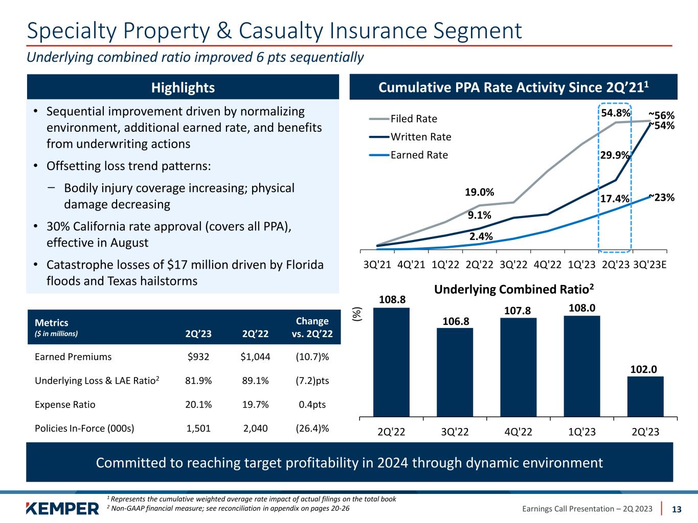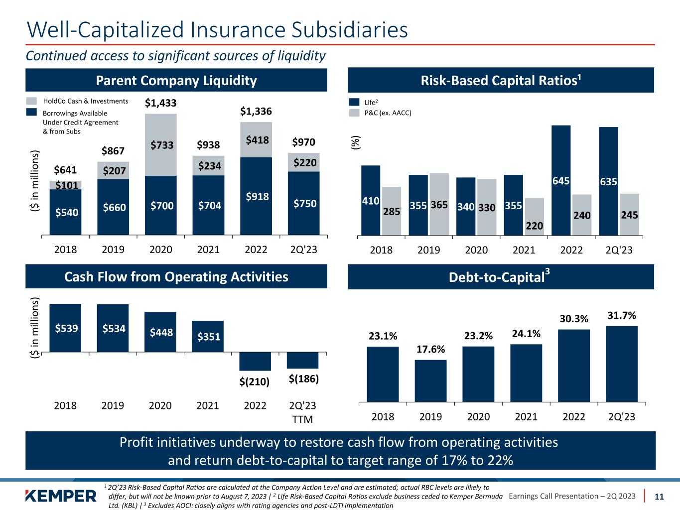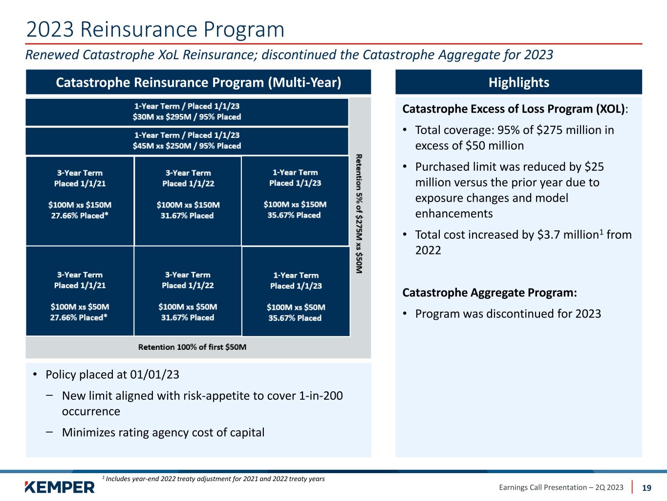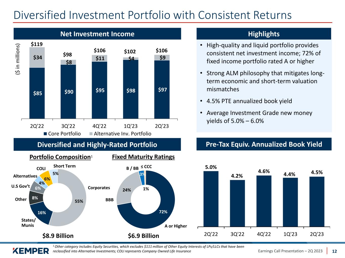 Earnings Call Presentation – 2Q 2023 Preliminary Matters 2 Cautionary Statements Regarding Forward-Looking Information This presentation may contain or incorporate by reference information that includes or is based on forward-looking statements within the meaning of the safe-harbor provisions of the Private Securities Litigation Reform Act of 1995. We caution investors that these forward-looking statements are not guarantees of future performance, and actual results may differ materially. Such statements involve known and unknown risks, uncertainties, and other factors, including but not limited to: • changes in the frequency and severity of insurance claims; • claim development and the process of estimating claim reserves; • the impacts of inflation; • changes in interest rate environment; • supply chain disruption; • product demand and pricing; • effects of governmental and regulatory actions; • litigation outcomes; • investment risks; • cybersecurity risks; • impact of catastrophes; and • other risks and uncertainties detailed in Kemper’s Annual Report on Form 10-K and subsequent filings with the Securities and Exchange Commission (“SEC”). Kemper assumes no obligation to publicly correct or update any forward-looking statements as a result of events or developments subsequent to the date of this presentation. Non-GAAP Financial Measures This presentation contains non-GAAP financial measures that the company believes are meaningful to investors. Non-GAAP financial measures have been reconciled to the most comparable GAAP financial measure.