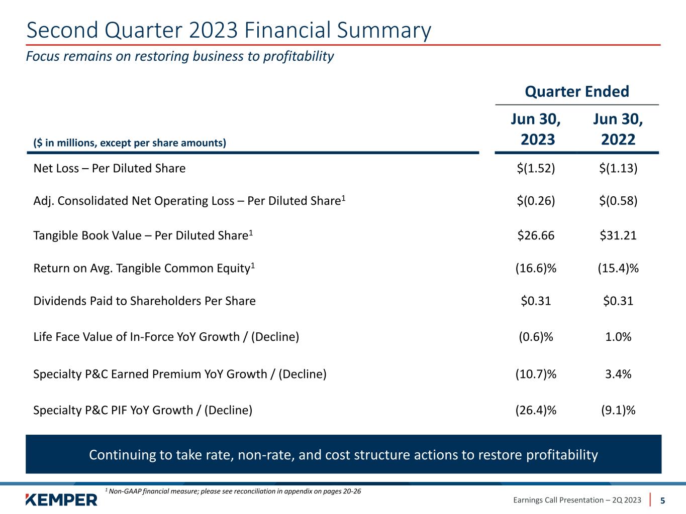 Earnings Call Presentation – 2Q 2023 Second Quarter 2023 Summary 4 Underlying combined ratios improved sequentially Aggressively pursuing profit restoration • Notable rate approved in California – ~30 pts effective August 4th • Other incremental rate actions: ̶ Specialty P&C Private Passenger Auto (PPA) – Filed an additional 15% increase on 36% of the book ̶ Preferred P&C Personal Passenger Auto – Filed an additional 15% increase on 14% of the book • Earn-in of additional approved rate: ̶ Specialty P&C Private Passenger Auto – 13 pts to earn in over the next 6 months ̶ Preferred P&C Personal Passenger Auto – 8 pts to earn in over the next 6 months • LAE, expense, and real estate initiatives in line with planned targets • Completed the strategic review of Preferred P&C2 – wind-down initiated Actions Taken Profit restoration continues with improvement in underlying results • Net loss of $97 million ($1.52/sh), as reported – includes ~$46 million ($0.71/sh) of Personal Insurance goodwill impairment charge • Adjusted consolidated net operating loss1 of $17 million ($0.26/sh), as reported • Underlying combined ratios improved sequentially: ̶ Specialty P&C improved by 6.0 pts ̶ Preferred P&C improved by 1.5 pts • Total pre-tax current year catastrophe losses of $39 million • Unfavorable prior year reserve development of $26 million, driven by Bodily Injury and Property Damage 2nd Quarter Results Capital and liquidity positions enable the company to navigate current environment • Holding company liquidity of approximately $1 billion remains a source of strength for subsidiaries • Insurance companies are appropriately capitalized Balance Sheet Strength 1 Non-GAAP financial measure; please see reconciliation in appendix on pages 20-26 2 Preferred P&C is represented by Kemper Personal Insurance