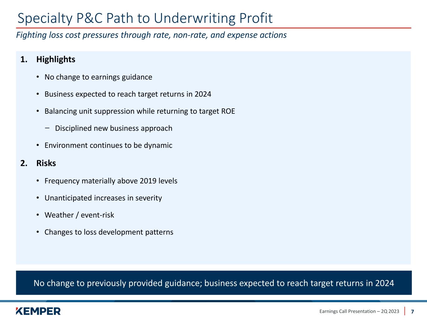 Earnings Call Presentation – 2Q 2023 Kemper P&C Business Reserve Update 6 Unanticipated extension in claim reporting timelines with more claims closing with payment Prior year adverse development of approximately $26 million • Specialty P&C1 adverse development of $24 million ̶ Private Passenger Auto development was primarily the result of Bodily Injury and Property Damage loss activity during the second half of 2022 • Elongated development patterns • More claims closing with payment ̶ Commercial Vehicle development driven by adverse Bodily Injury • Preferred P&C2 adverse development of $2 million ̶ Private Passenger Auto development related to Bodily Injury from 4Q’22 Quickly recognized and reacted to pattern changes to address impact of evolving trends 1 Specialty P&C is represented by the Kemper Auto Brand 2 Preferred P&C is represented by Kemper Personal Insurance