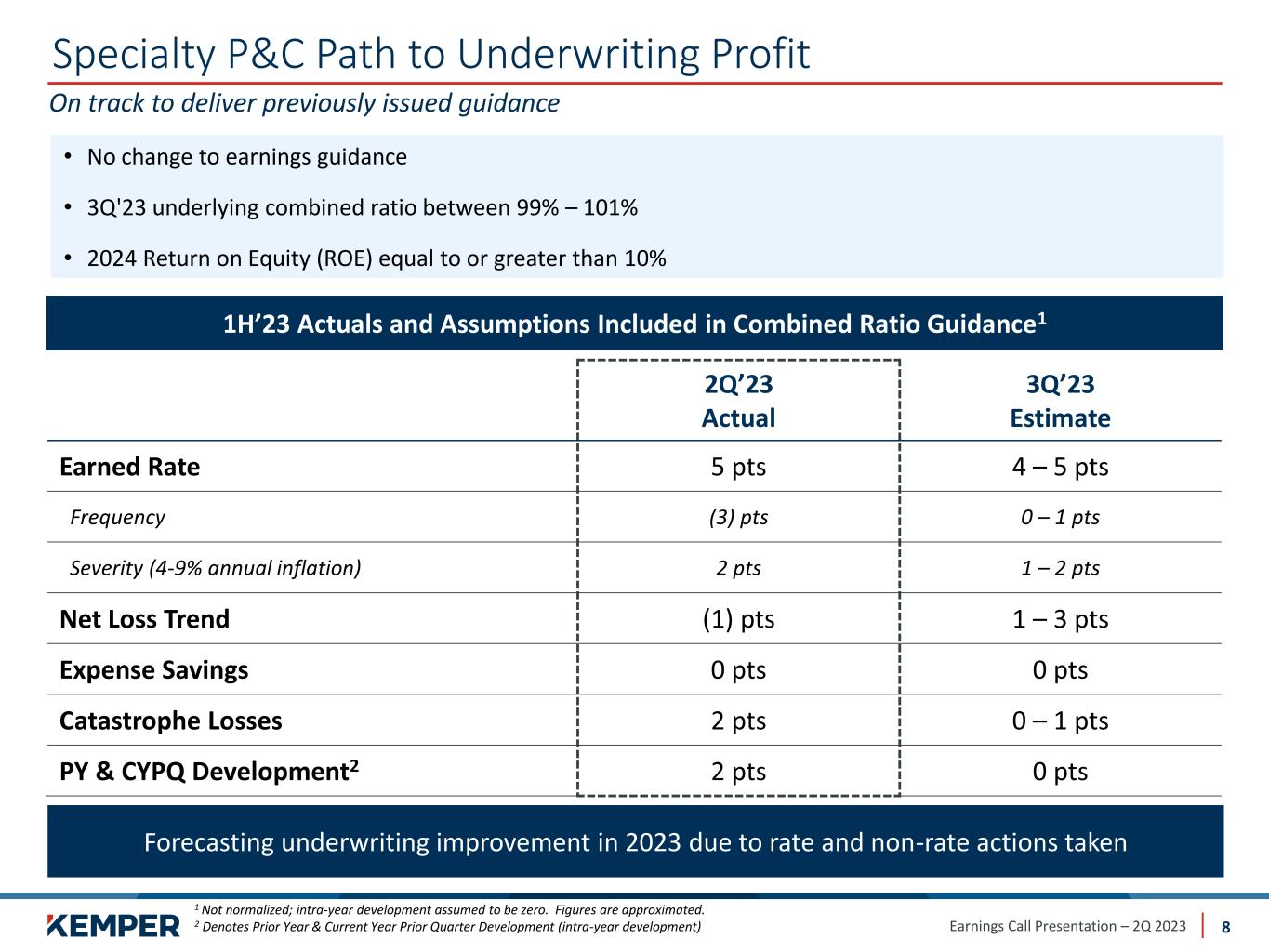 Earnings Call Presentation – 2Q 2023 1. Highlights • No change to earnings guidance • Business expected to reach target returns in 2024 • Balancing unit suppression while returning to target ROE ̶ Disciplined new business approach • Environment continues to be dynamic 2. Risks • Frequency materially above 2019 levels • Unanticipated increases in severity • Weather / event-risk • Changes to loss development patterns No change to previously provided guidance; business expected to reach target returns in 2024 Specialty P&C Path to Underwriting Profit Overcoming loss cost pressures through rate, non-rate, and expense actions 7 Fighting loss cost pressure through rate, non-rate, nd expense actions