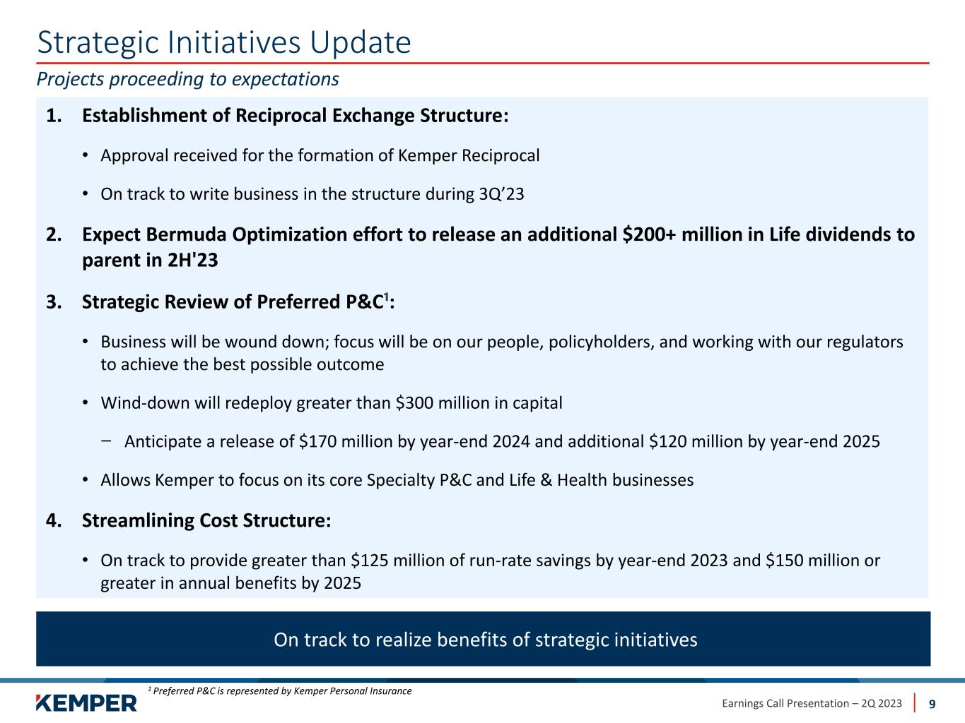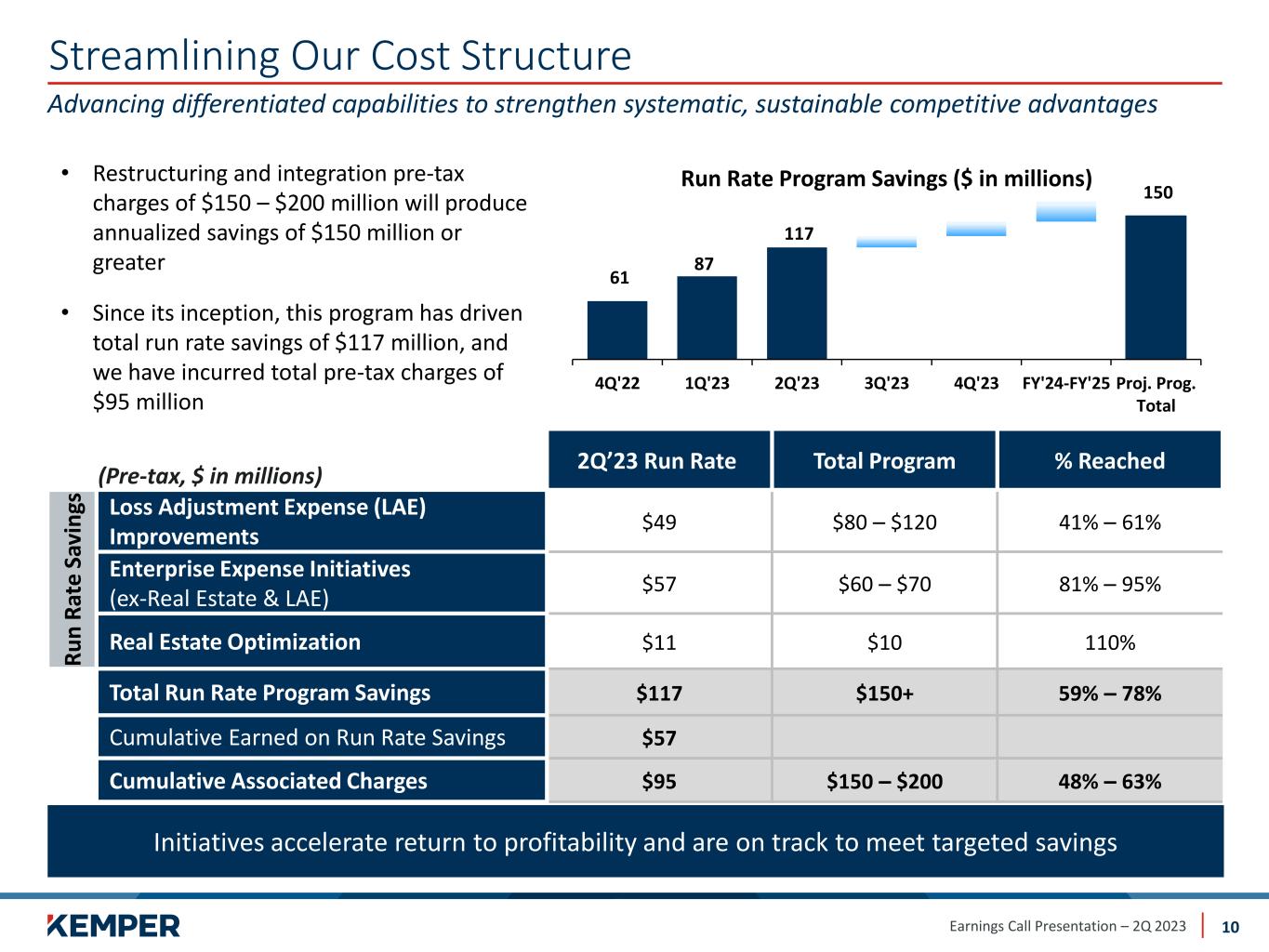 Earnings Call Presentation – 2Q 2023 Strategic Initiatives Update 9 Projects proceeding to expectations On track to realize benefits of strategic initiatives 1. Establishment of Reciprocal Exchange Structure: • Approval received for the formation of Kemper Reciprocal • On track to write business in the structure during 3Q’23 2. Expect Bermuda Optimization effort to release an additional $200+ million in Life dividends to parent in 2H'23 3. Strategic Review of Preferred P&C¹: • Business will be wound down; focus will be on our people, policyholders, and working with our regulators to achieve the best possible outcome • Wind-down will redeploy greater than $300 million in capital ̶ Anticipate a release of $170 million by year-end 2024 and additional $120 million by year-end 2025 • Allows Kemper to focus on its core Specialty P&C and Life & Health businesses 4. Streamlining Cost Structure: • On track to provide greater than $125 million of run-rate savings by year-end 2023 and $150 million or greater in annual benefits by 2025 1 Preferred P&C is represented by Kemper Personal Insurance