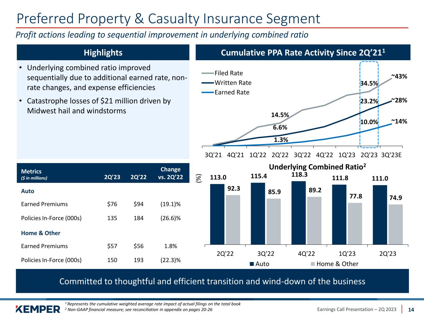 Earnings Call Presentation – 2Q 2023 19.0% 54.8% ~56% 9.1% 29.9% ~54% 2.4% 17.4% ~23% 3Q'21 4Q'21 1Q'22 2Q'22 3Q'22 4Q'22 1Q'23 2Q'23 3Q'23E Filed Rate Written Rate Earned Rate Specialty Property & Casualty Insurance Segment 13 Underlying combined ratio improved 6 pts sequentially 108.8 106.8 107.8 108.0 102.0 2Q'22 3Q'22 4Q'22 1Q'23 2Q'23 Underlying Combined Ratio2 (% ) Highlights • Sequential improvement driven by normalizing environment, additional earned rate, and benefits from underwriting actions • Offsetting loss trend patterns: ̶ Bodily injury coverage increasing; physical damage decreasing • 30% California rate approval (covers all PPA), effective in August • Catastrophe losses of $17 million driven by Florida floods and Texas hailstorms Metrics ($ in millions) 2Q’23 2Q’22 Change vs. 2Q’22 Earned Premiums $932 $1,044 (10.7)% Underlying Loss & LAE Ratio2 81.9% 89.1% (7.2)pts Expense Ratio 20.1% 19.7% 0.4pts Policies In-Force (000s) 1,501 2,040 (26.4)% Cumulative PPA Rate Activity Since 2Q’211 1 Represents the cumulative weighted average rate impact of actual filings on the total book 2 Non-GAAP financial measure; see reconciliation in appendix on pages 20-26 Committed to reaching target profitability in 2024 through dynamic environment