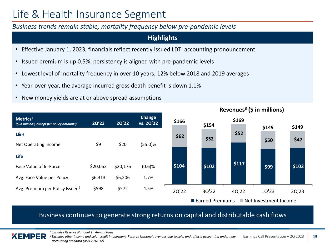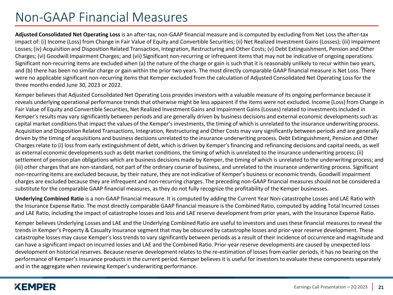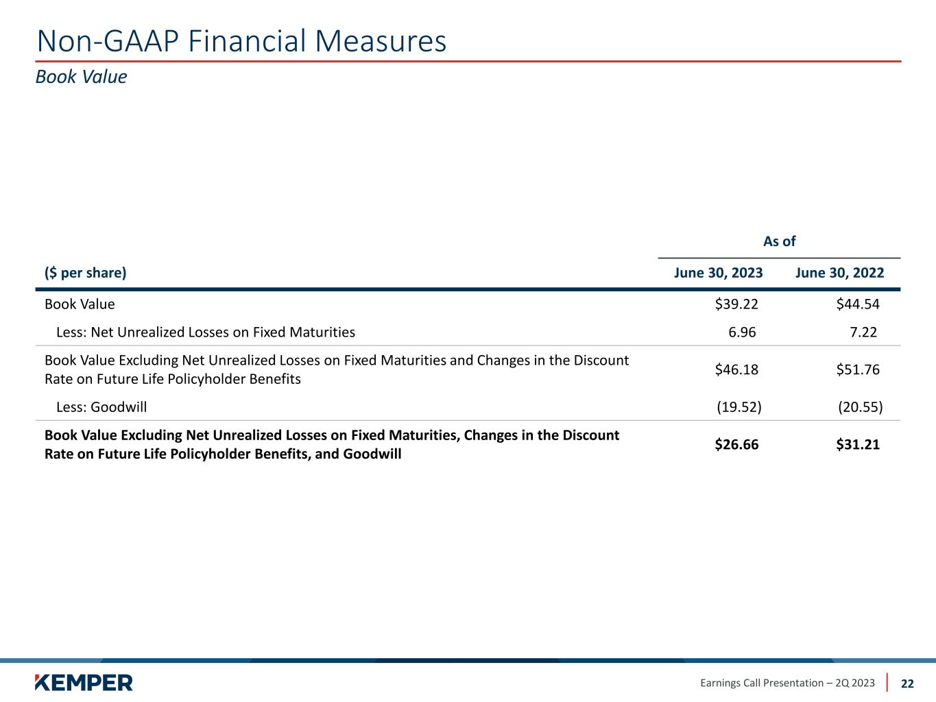 Earnings Call Presentation – 2Q 2023 Non-GAAP Financial Measures 21 Adjusted Consolidated Net Operating Loss is an after-tax, non-GAAP financial measure and is computed by excluding from Net Loss the after-tax impact of: (i) Income (Loss) from Change in Fair Value of Equity and Convertible Securities; (ii) Net Realized Investment Gains (Losses); (iii) Impairment Losses; (iv) Acquisition and Disposition Related Transaction, Integration, Restructuring and Other Costs; (v) Debt Extinguishment, Pension and Other Charges; (vi) Goodwill Impairment Charges; and (vii) Significant non-recurring or infrequent items that may not be indicative of ongoing operations. Significant non-recurring items are excluded when (a) the nature of the charge or gain is such that it is reasonably unlikely to recur within two years, and (b) there has been no similar charge or gain within the prior two years. The most directly comparable GAAP financial measure is Net Loss. There were no applicable significant non-recurring items that Kemper excluded from the calculation of Adjusted Consolidated Net Operating Loss for the three months ended June 30, 2023 or 2022. Kemper believes that Adjusted Consolidated Net Operating Loss provides investors with a valuable measure of its ongoing performance because it reveals underlying operational performance trends that otherwise might be less apparent if the items were not excluded. Income (Loss) from Change in Fair Value of Equity and Convertible Securities, Net Realized Investment Gains and Impairment Gains (Losses) related to investments included in Kemper’s results may vary significantly between periods and are generally driven by business decisions and external economic developments such as capital market conditions that impact the values of the Kemper’s investments, the timing of which is unrelated to the insurance underwriting process. Acquisition and Disposition Related Transactions, Integration, Restructuring and Other Costs may vary significantly between periods and are generally driven by the timing of acquisitions and business decisions unrelated to the insurance underwriting process. Debt Extinguishment, Pension and Other Charges relate to (i) loss from early extinguishment of debt, which is driven by Kemper’s financing and refinancing decisions and capital needs, as well as external economic developments such as debt market conditions, the timing of which is unrelated to the insurance underwriting process; (ii) settlement of pension plan obligations which are business decisions made by Kemper, the timing of which is unrelated to the underwriting process; and (iii) other charges that are non-standard, not part of the ordinary course of business, and unrelated to the insurance underwriting process. Significant non-recurring items are excluded because, by their nature, they are not indicative of Kemper’s business or economic trends. Goodwill impairment charges are excluded because they are infrequent and non-recurring charges. The preceding non-GAAP financial measures should not be considered a substitute for the comparable GAAP financial measures, as they do not fully recognize the profitability of the Kemper businesses. Underlying Combined Ratio is a non-GAAP financial measure. It is computed by adding the Current Year Non-catastrophe Losses and LAE Ratio with the Insurance Expense Ratio. The most directly comparable GAAP financial measure is the Combined Ratio, computed by adding Total Incurred Losses and LAE Ratio, including the impact of catastrophe losses and loss and LAE reserve development from prior years, with the Insurance Expense Ratio. Kemper believes Underlying Losses and LAE and the Underlying Combined Ratio are useful to investors and uses these financial measures to reveal the trends in Kemper’s Property & Casualty Insurance segment that may be obscured by catastrophe losses and prior-year reserve development. These catastrophe losses may cause Kemper’s loss trends to vary significantly between periods as a result of their incidence of occurrence and magnitude and can have a significant impact on incurred losses and LAE and the Combined Ratio. Prior-year reserve developments are caused by unexpected loss development on historical reserves. Because reserve development relates to the re-estimation of losses from earlier periods, it has no bearing on the performance of Kemper’s insurance products in the current period. Kemper believes it is useful for investors to evaluate these components separately and in the aggregate when reviewing Kemper’s underwriting performance.