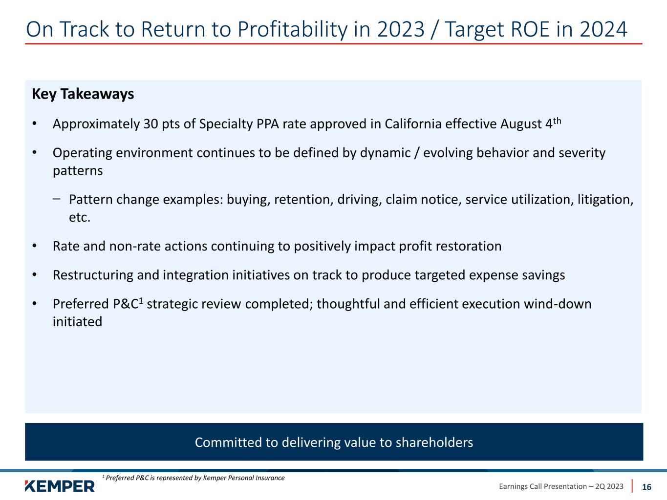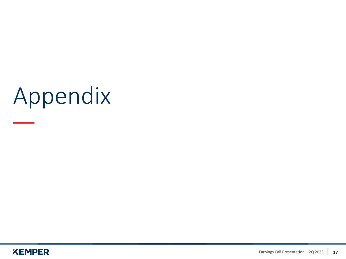 Earnings Call Presentation – 2Q 2023 On Track to Return to Profitability in 2023 / Target ROE in 2024 16 Committed to delivering value to shareholders Key Takeaways • Approximately 30 pts of Specialty PPA rate approved in California effective August 4th • Operating environment continues to be defined by dynamic / evolving behavior and severity patterns ̶ Pattern change examples: buying, retention, driving, claim notice, service utilization, litigation, etc. • Rate and non-rate actions continuing to positively impact profit restoration • Restructuring and integration initiatives on track to produce targeted expense savings • Preferred P&C1 strategic review completed; thoughtful and efficient execution wind-down initiated 1 Preferred P&C is represented by Kemper Personal Insurance