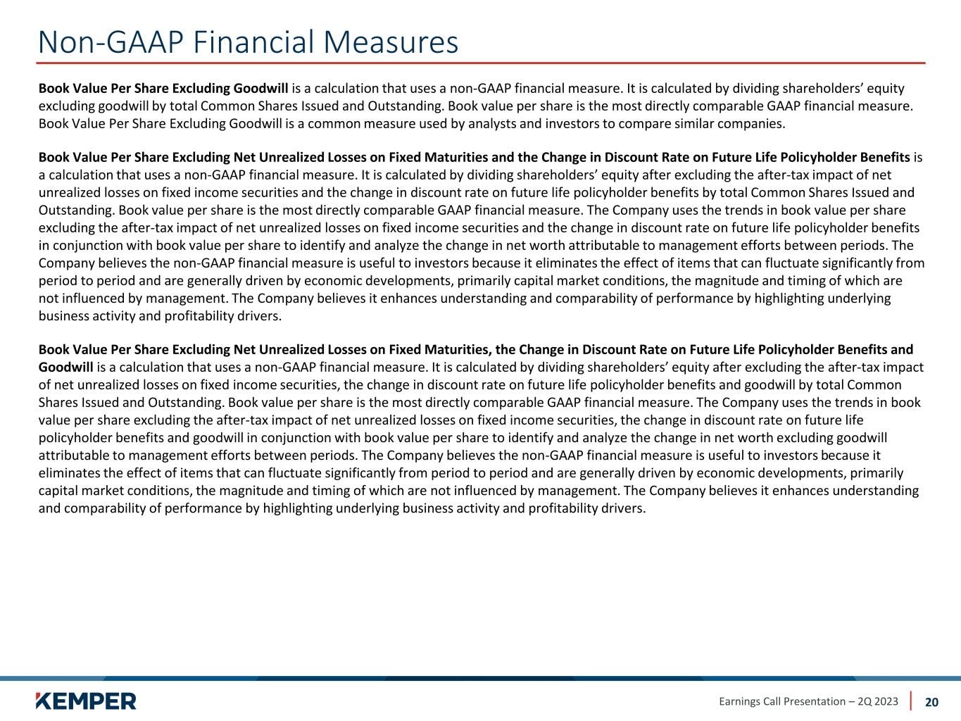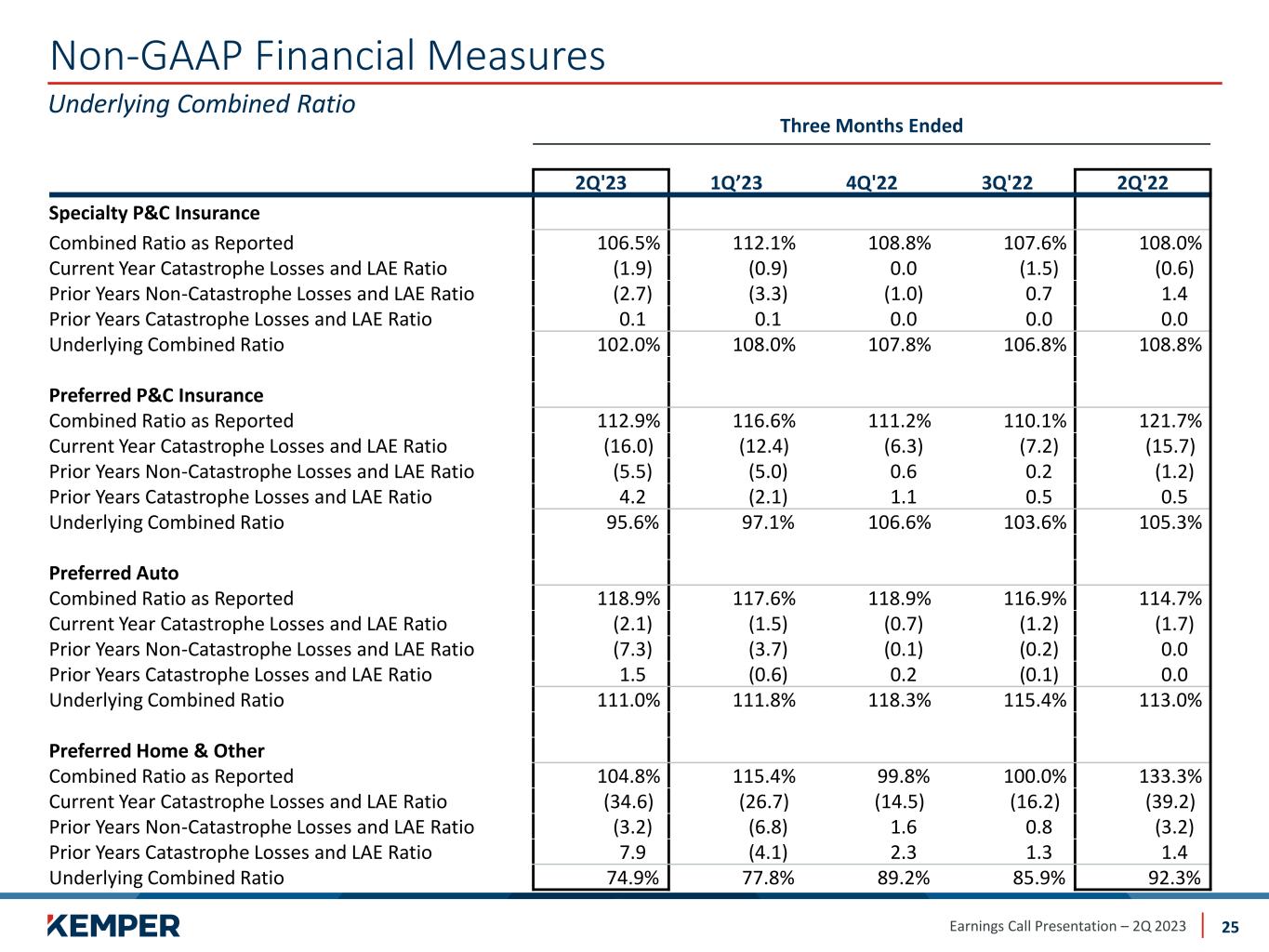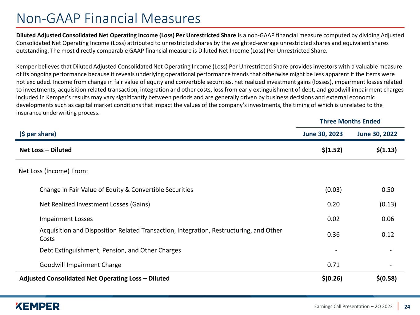 Earnings Call Presentation – 2Q 2023 Non-GAAP Financial Measures 24 Diluted Adjusted Consolidated Net Operating Income (Loss) Per Unrestricted Share is a non-GAAP financial measure computed by dividing Adjusted Consolidated Net Operating Income (Loss) attributed to unrestricted shares by the weighted-average unrestricted shares and equivalent shares outstanding. The most directly comparable GAAP financial measure is Diluted Net Income (Loss) Per Unrestricted Share. Kemper believes that Diluted Adjusted Consolidated Net Operating Income (Loss) Per Unrestricted Share provides investors with a valuable measure of its ongoing performance because it reveals underlying operational performance trends that otherwise might be less apparent if the items were not excluded. Income from change in fair value of equity and convertible securities, net realized investment gains (losses), impairment losses related to investments, acquisition related transaction, integration and other costs, loss from early extinguishment of debt, and goodwill impairment charges included in Kemper’s results may vary significantly between periods and are generally driven by business decisions and external economic developments such as capital market conditions that impact the values of the company’s investments, the timing of which is unrelated to the insurance underwriting process. Three Months Ended ​​($ per share) June 30, 2023​ June 30, 2022 Net Loss – Diluted $(1.52) $(1.13) Net Loss (Income) From: Change in Fair Value of Equity & Convertible Securities (0.03) 0.50 Net Realized Investment Losses (Gains) 0.20 (0.13) Impairment Losses 0.02 0.06 Acquisition and Disposition Related Transaction, Integration, Restructuring, and Other Costs 0.36 0.12 Debt Extinguishment, Pension, and Other Charges - - Goodwill Impairment Charge 0.71 - Adjusted Consolidated Net Operating Loss – Diluted $(0.26) $(0.58)