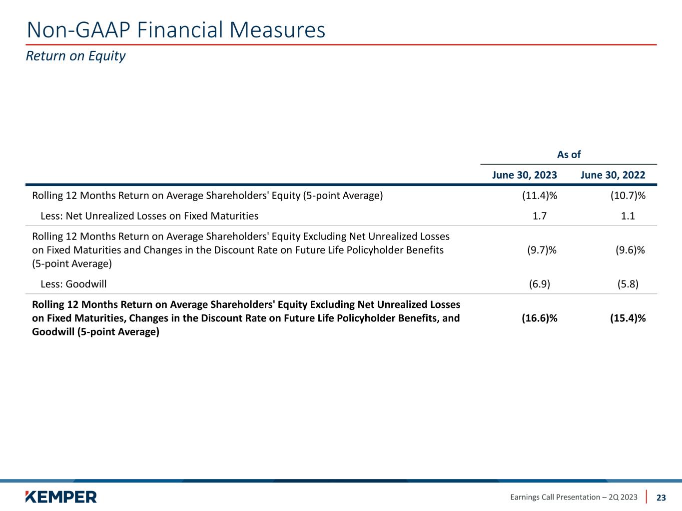 Earnings Call Presentation – 2Q 2023 Non-GAAP Financial Measures 22 Book Value As of ​($ per share) June 30, 2023 June 30, 2022​ Book Value $39.22 $44.54​ Less: Net Unrealized Losses on Fixed Maturities 6.96 7.22​ Book Value Excluding Net Unrealized Losses on Fixed Maturities and Changes in the Discount Rate on Future Life Policyholder Benefits $46.18 $51.76​ Less: Goodwill​ (19.52)​ (20.55)​ Book Value Excluding Net Unrealized Losses on Fixed Maturities, Changes in the Discount Rate on Future Life Policyholder Benefits, and Goodwill $26.66 $31.21