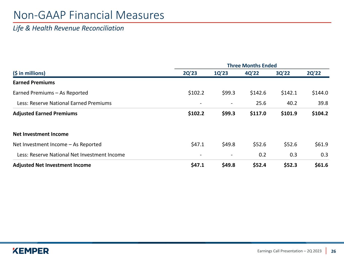 Earnings Call Presentation – 2Q 2023 Non-GAAP Financial Measures 26 Life & Health Revenue Reconciliation Three Months Ended ($ in millions) 2Q'23 1Q'23 4Q'22 3Q'22 2Q'22 Earned Premiums Earned Premiums – As Reported $102.2 $99.3 $142.6 $142.1 $144.0 Less: Reserve National Earned Premiums - - 25.6 40.2 39.8 Adjusted Earned Premiums $102.2 $99.3 $117.0 $101.9 $104.2 Net Investment Income Net Investment Income – As Reported $47.1 $49.8 $52.6 $52.6 $61.9 Less: Reserve National Net Investment Income - - 0.2 0.3 0.3 Adjusted Net Investment Income $47.1 $49.8 $52.4 $52.3 $61.6