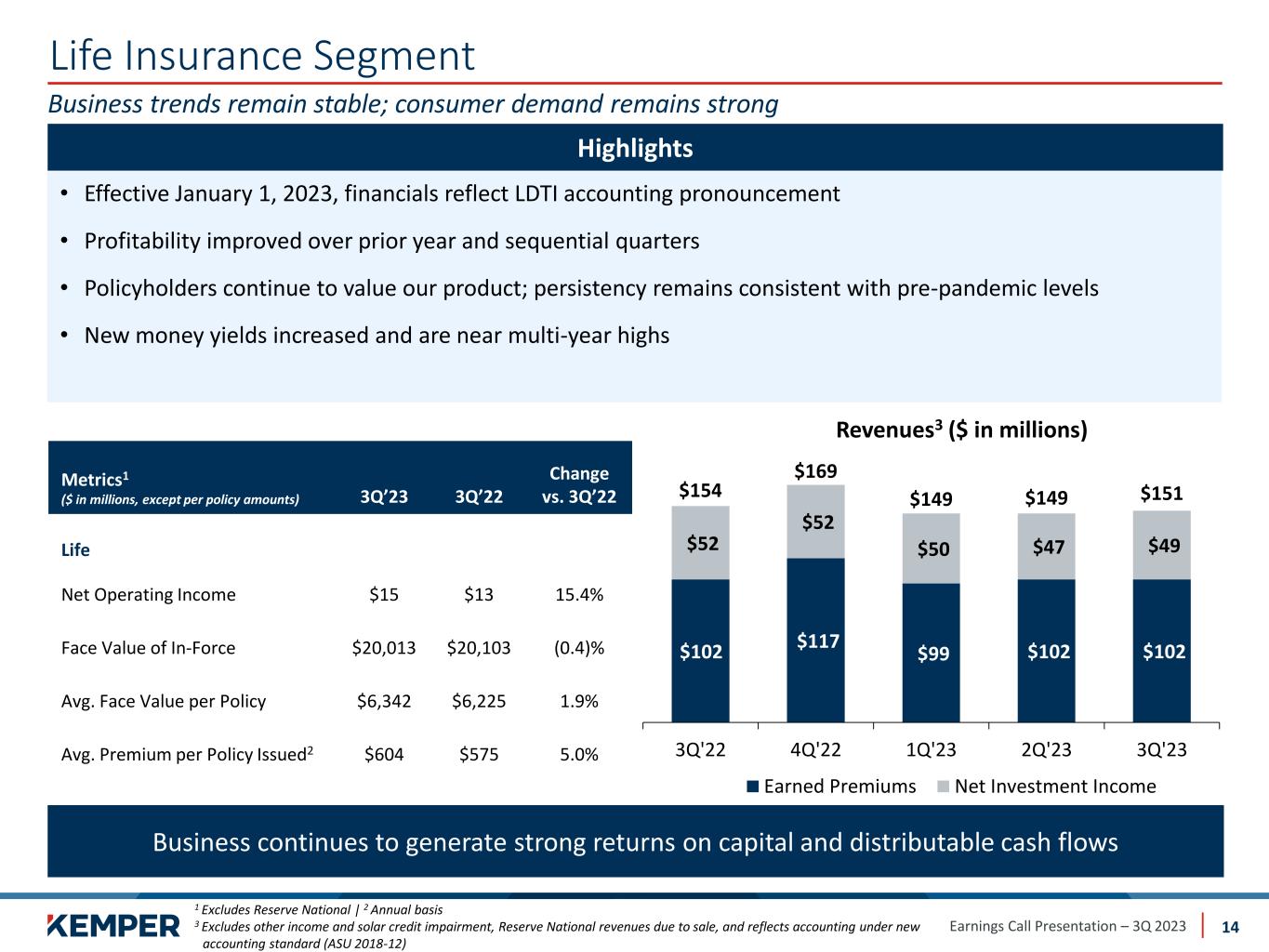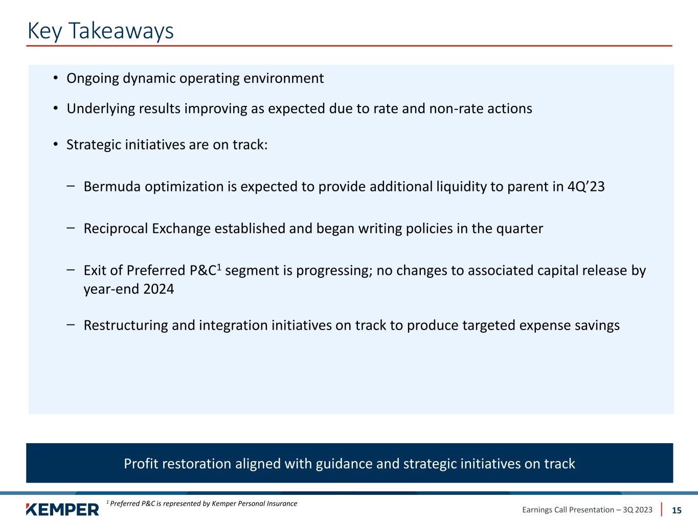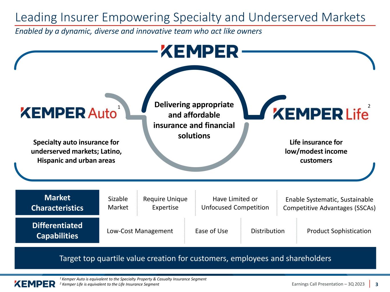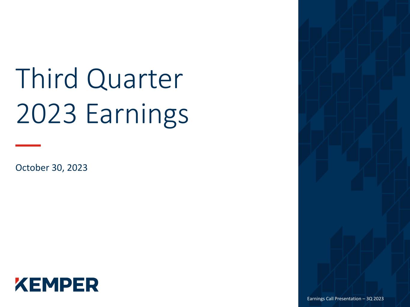 Earnings Call Presentation – 3Q 2023 Preliminary Matters 2 Cautionary Statements Regarding Forward-Looking Information This presentation may contain or incorporate by reference information that includes or is based on forward-looking statements within the meaning of the safe-harbor provisions of the Private Securities Litigation Reform Act of 1995. We caution investors that these forward-looking statements are not guarantees of future performance, and actual results may differ materially. Such statements involve known and unknown risks, uncertainties, and other factors, including but not limited to: • changes in the frequency and severity of insurance claims; • claim development and the process of estimating claim reserves; • the impacts of inflation; • changes in interest rate environment; • supply chain disruption; • product demand and pricing; • effects of governmental and regulatory actions; • litigation outcomes and trends; • investment risks; • cybersecurity risks; • impact of catastrophes; and • other risks and uncertainties detailed in Kemper’s Annual Report on Form 10-K and subsequent filings with the Securities and Exchange Commission (“SEC”). Kemper assumes no obligation to publicly correct or update any forward-looking statements as a result of events or developments subsequent to the date of this presentation. Non-GAAP Financial Measures This presentation contains non-GAAP financial measures that the company believes are meaningful to investors. Non-GAAP financial measures have been reconciled to the most comparable GAAP financial measure.