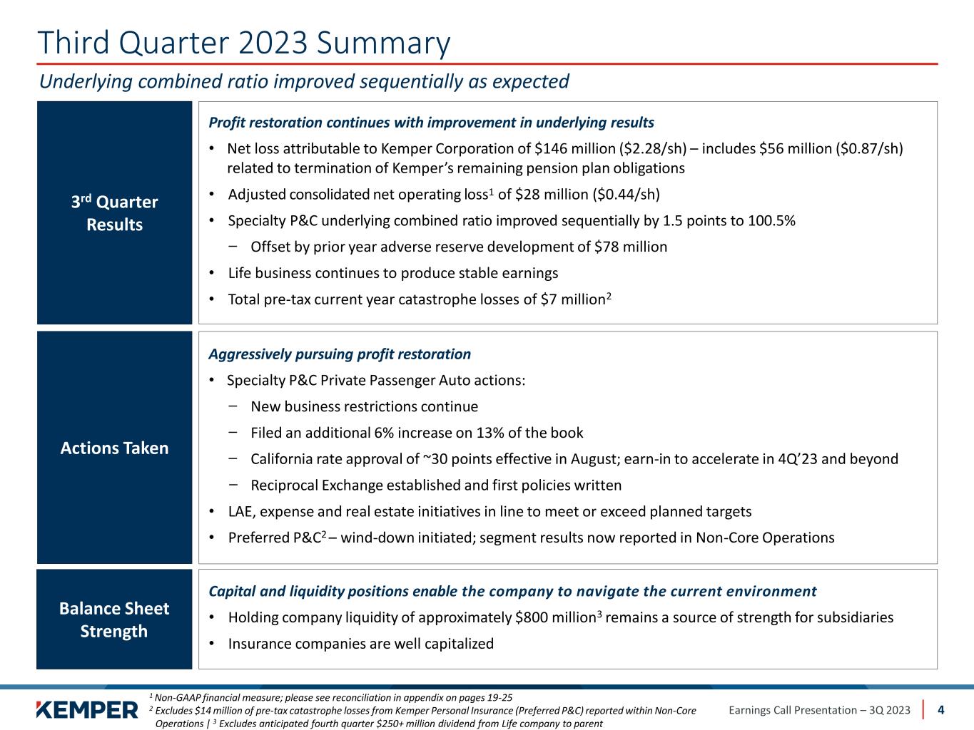 Earnings Call Presentation – 3Q 2023 Target top quartile value creation for customers, employees and shareholders Leading Insurer Empowering Specialty and Underserved Markets Enabled by a dynamic, diverse and innovative team who act like owners 3 Distribution Have Limited or Unfocused Competition Require Unique Expertise Sizable Market Delivering appropriate and affordable insurance and financial solutions Specialty auto insurance for underserved markets; Latino, Hispanic and urban areas Life insurance for low/modest income customers Market Characteristics Differentiated Capabilities Product SophisticationEase of UseLow-Cost Management 1 Enable Systematic, Sustainable Competitive Advantages (SSCAs) 2 1 Kemper Auto is equivalent to the Specialty Property & Casualty Insurance Segment 2 Kemper Life is equivalent to the Life Insurance Segment