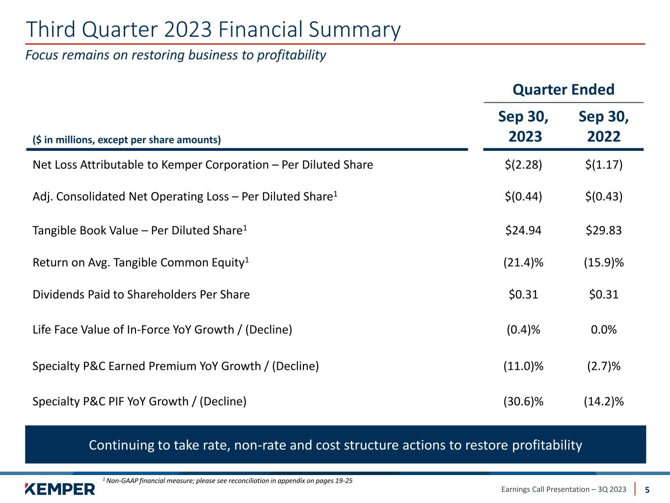 Earnings Call Presentation – 3Q 2023 Third Quarter 2023 Summary 4 Underlying combined ratio improved sequentially as expected Aggressively pursuing profit restoration • Specialty P&C Private Passenger Auto actions: ̶ New business restrictions continue ̶ Filed an additional 6% increase on 13% of the book ̶ California rate approval of ~30 points effective in August; earn-in to accelerate in 4Q’23 and beyond ̶ Reciprocal Exchange established and first policies written • LAE, expense and real estate initiatives in line to meet or exceed planned targets • Preferred P&C2 – wind-down initiated; segment results now reported in Non-Core Operations Actions Taken Profit restoration continues with improvement in underlying results • Net loss attributable to Kemper Corporation of $146 million ($2.28/sh) – includes $56 million ($0.87/sh) related to termination of Kemper’s remaining pension plan obligations • Adjusted consolidated net operating loss1 of $28 million ($0.44/sh) • Specialty P&C underlying combined ratio improved sequentially by 1.5 points to 100.5% ̶ Offset by prior year adverse reserve development of $78 million • Life business continues to produce stable earnings • Total pre-tax current year catastrophe losses of $7 million2 3rd Quarter Results Capital and liquidity positions enable the company to navigate the current environment • Holding company liquidity of approximately $800 million3 remains a source of strength for subsidiaries • Insurance companies are well capitalized Balance Sheet Strength 1 Non-GAAP financial measure; please see reconciliation in appendix on pages 19-25 2 Excludes $14 million of pre-tax catastrophe losses from Kemper Personal Insurance (Preferred P&C) reported within Non-Core Operations | 3 Excludes anticipated fourth quarter $250+ million dividend from Life company to parent