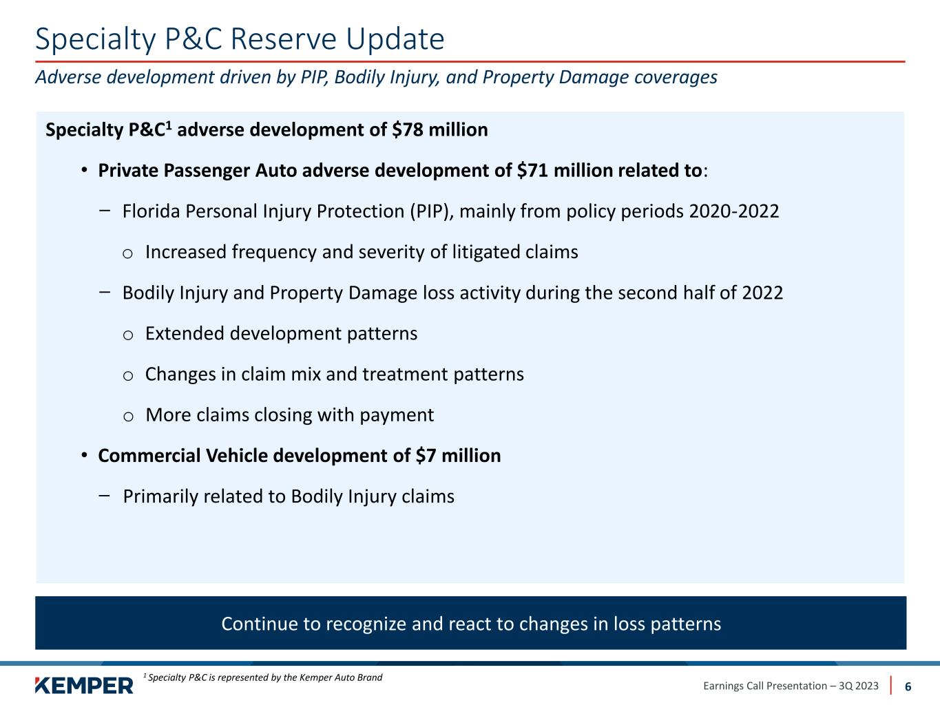 Earnings Call Presentation – 3Q 2023 Third Quarter 2023 Financial Summary 5 Focus remains on restoring business to profitability Continuing to take rate, non-rate and cost structure actions to restore profitability Quarter Ended ($ in millions, except per share amounts) Sep 30, 2023 Sep 30, 2022 Net Loss Attributable to Kemper Corporation – Per Diluted Share $(2.28) $(1.17) Adj. Consolidated Net Operating Loss – Per Diluted Share1 $(0.44) $(0.43) Tangible Book Value – Per Diluted Share1 $24.94 $29.83 Return on Avg. Tangible Common Equity1 (21.4)% (15.9)% Dividends Paid to Shareholders Per Share $0.31 $0.31 Life Face Value of In-Force YoY Growth / (Decline) (0.4)% 0.0% Specialty P&C Earned Premium YoY Growth / (Decline) (11.0)% (2.7)% Specialty P&C PIF YoY Growth / (Decline) (30.6)% (14.2)% 1 Non-GAAP financial measure; please see reconciliation in appendix on pages 19-25