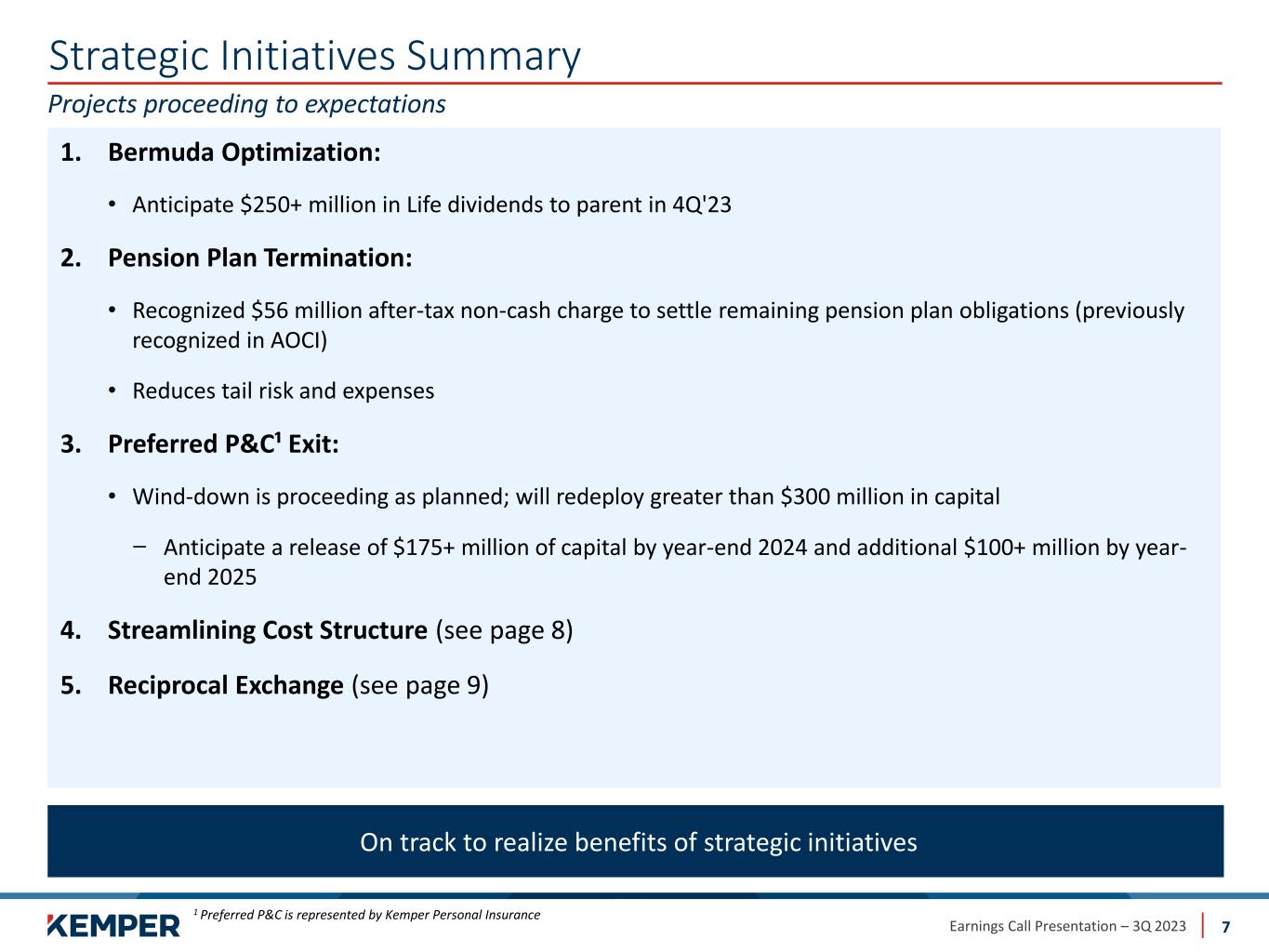 Earnings Call Presentation – 3Q 2023 Specialty P&C Reserve Update 6 Adverse development driven by PIP, Bodily Injury, and Property Damage coverages Specialty P&C1 adverse development of $78 million • Private Passenger Auto adverse development of $71 million related to: ̶ Florida Personal Injury Protection (PIP), mainly from policy periods 2020-2022 o Increased frequency and severity of litigated claims ̶ Bodily Injury and Property Damage loss activity during the second half of 2022 o Extended development patterns o Changes in claim mix and treatment patterns o More claims closing with payment • Commercial Vehicle development of $7 million ̶ Primarily related to Bodily Injury claims Continue to recognize and react to changes in loss patterns 1 Specialty P&C is represented by the Kemper Auto Brand