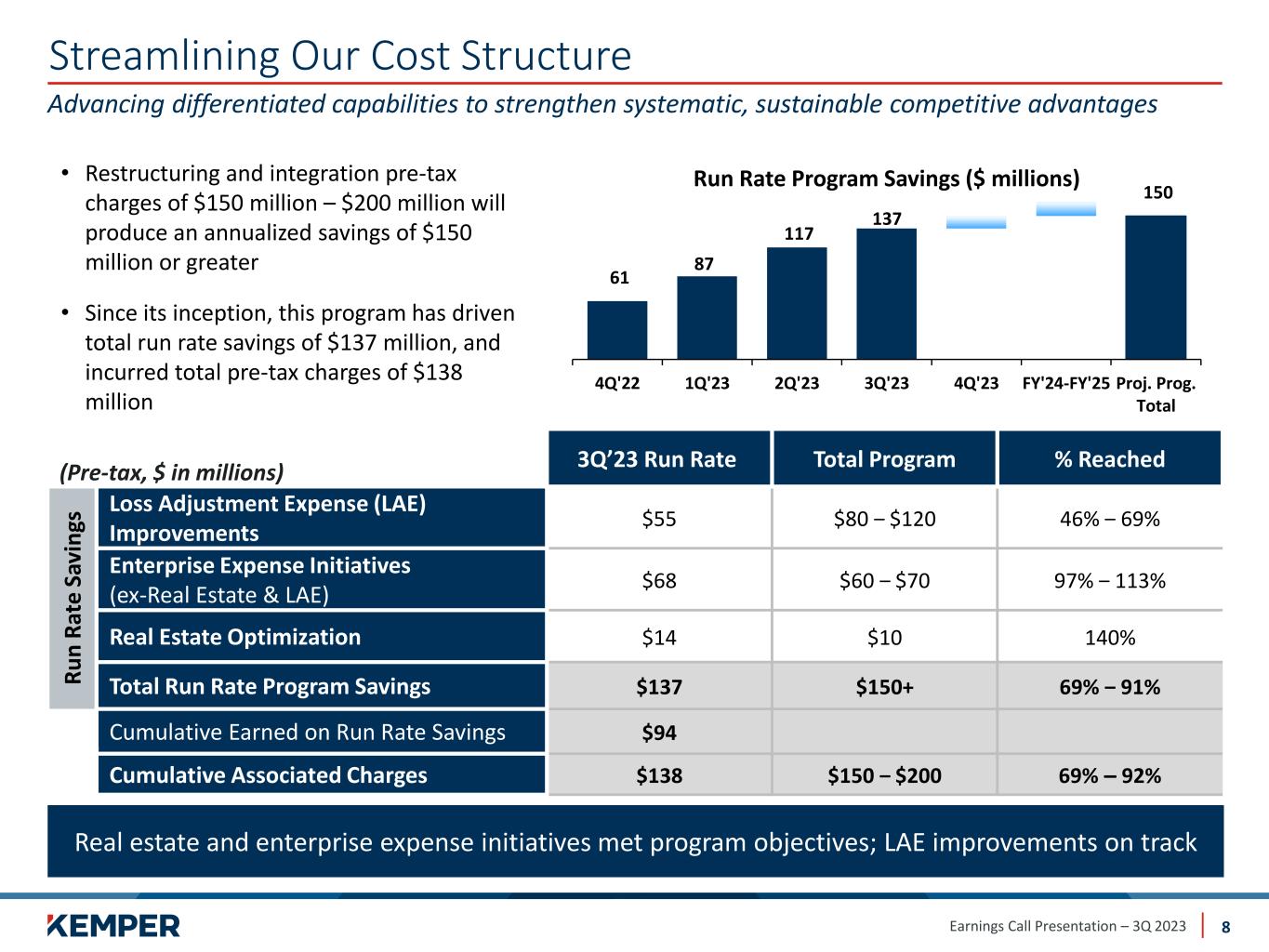 Earnings Call Presentation – 3Q 2023 Strategic Initiatives Summary 7 Projects proceeding to expectations On track to realize benefits of strategic initiatives 1. Bermuda Optimization: • Anticipate $250+ million in Life dividends to parent in 4Q'23 2. Pension Plan Termination: • Recognized $56 million after-tax non-cash charge to settle remaining pension plan obligations (previously recognized in AOCI) • Reduces tail risk and expenses 3. Preferred P&C¹ Exit: • Wind-down is proceeding as planned; will redeploy greater than $300 million in capital ̶ Anticipate a release of $175+ million of capital by year-end 2024 and additional $100+ million by year- end 2025 4. Streamlining Cost Structure (see page 8) 5. Reciprocal Exchange (see page 9) 1 Preferred P&C is represented by Kemper Personal Insurance
