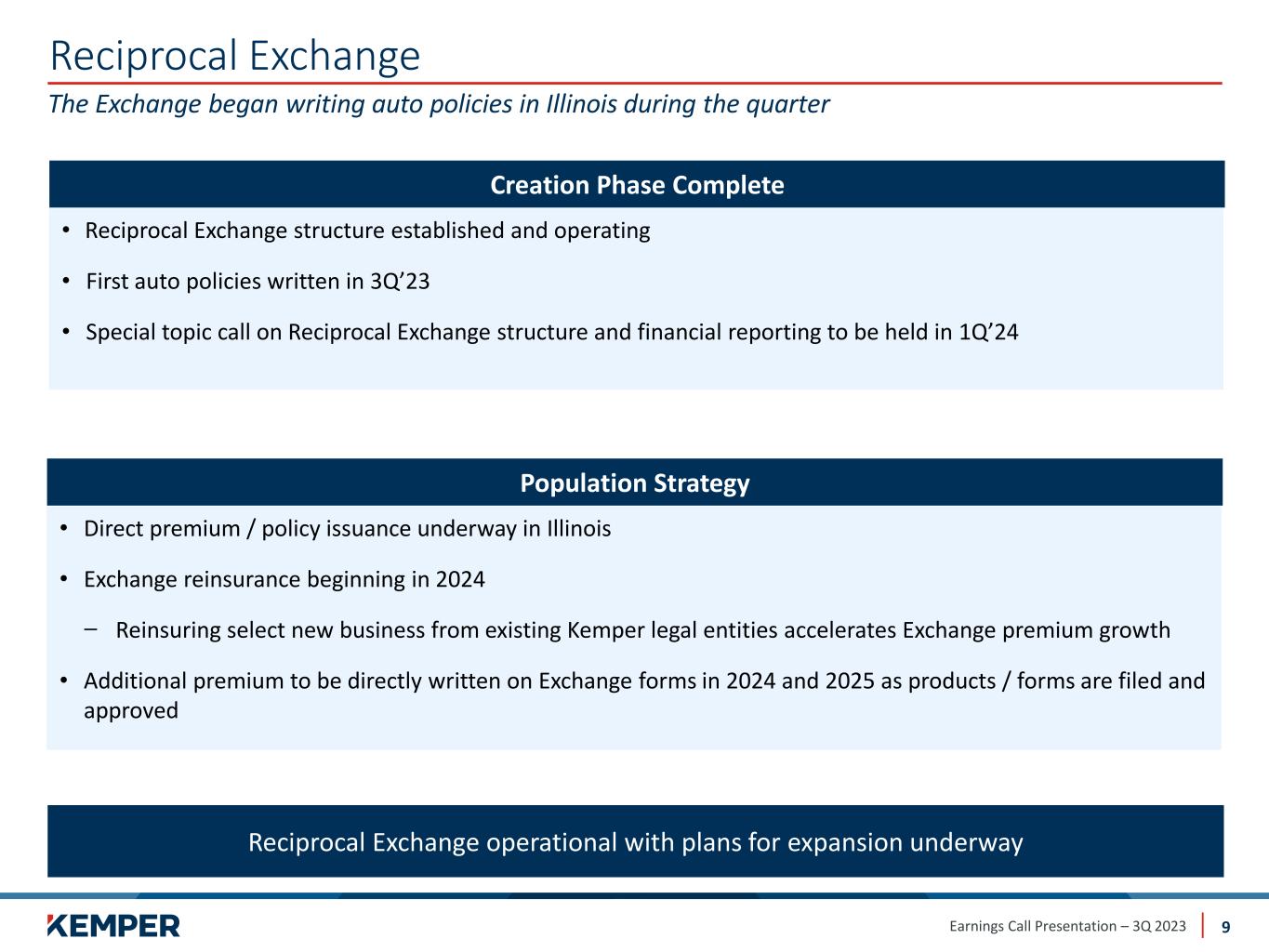 Earnings Call Presentation – 3Q 2023 Reciprocal Exchange 9 The Exchange began writing auto policies in Illinois during the quarter Reciprocal Exchange operational with plans for expansion underway • Reciprocal Exchange structure established and operating • First auto policies written in 3Q’23 • Special topic call on Reciprocal Exchange structure and financial reporting to be held in 1Q’24 Creation Phase Complete • Direct premium / policy issuance underway in Illinois • Exchange reinsurance beginning in 2024 ̶ Reinsuring select new business from existing Kemper legal entities accelerates Exchange premium growth • Additional premium to be directly written on Exchange forms in 2024 and 2025 as products / forms are filed and approved Population Strategy