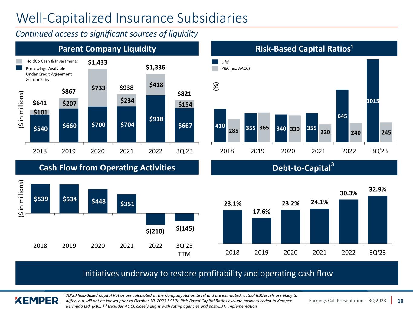 Earnings Call Presentation – 3Q 2023 Well-Capitalized Insurance Subsidiaries 10 Continued access to significant sources of liquidity Initiatives underway to restore profitability and operating cash flow 23.1% 17.6% 23.2% 24.1% 30.3% 32.9% 2018 2019 2020 2021 2022 3Q'23 Debt-to-Capital 3 Parent Company Liquidity Risk-Based Capital Ratios¹ $540 $660 $700 $704 $918 $667 $101 $207 $733 $234 $418 $154 $641 $867 $1,433 $938 $1,336 $821 2018 2019 2020 2021 2022 3Q'23 (% ) Debt Cash Flow from Operating Activities ($ in m ill io n s) $539 $534 $448 $351 $(210) $(145) 2018 2019 2020 2021 2022 3Q'23 TTM HoldCo Cash & Investments Borrowings Available Under Credit Agreement & from Subs P&C (ex. AACC) Life2 1 3Q’23 Risk-Based Capital Ratios are calculated at the Company Action Level and are estimated; actual RBC levels are likely to differ, but will not be known prior to October 30, 2023 | 2 Life Risk-Based Capital Ratios exclude business ceded to Kemper Bermuda Ltd. (KBL) | 3 Excludes AOCI: closely aligns with rating agencies and post-LDTI implementation ($ in m ill io n s) 410 355 340 355 645 1015 285 365 330 220 240 245 2018 2019 2020 2021 2022 3Q'23