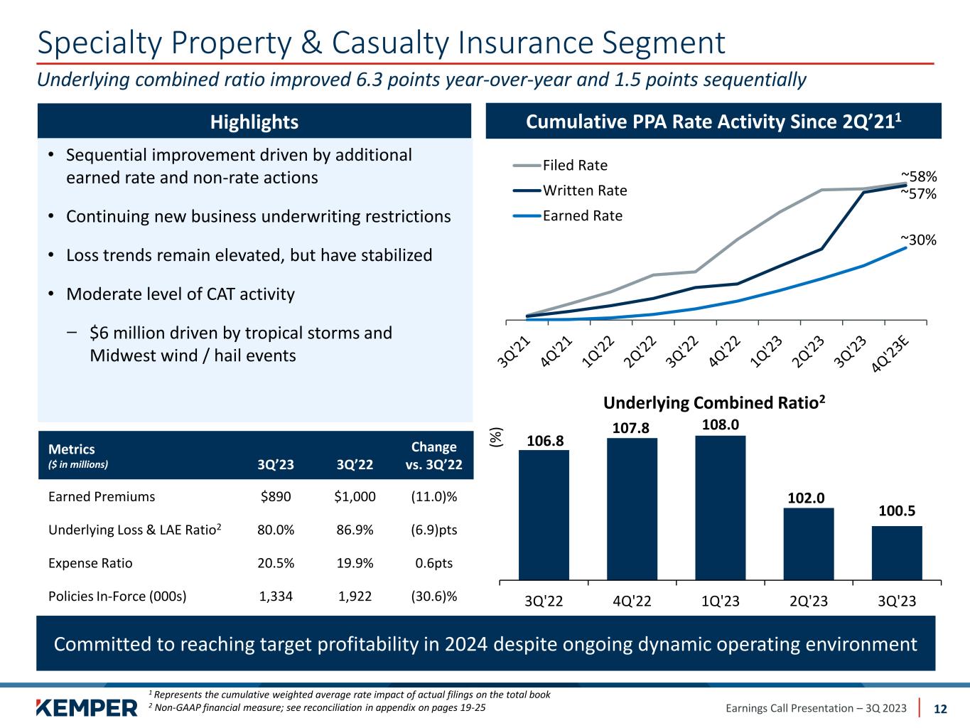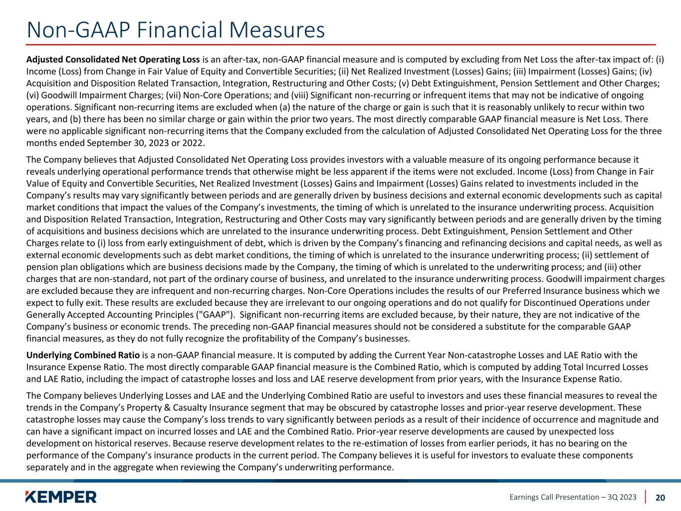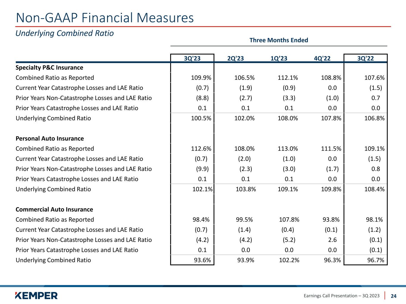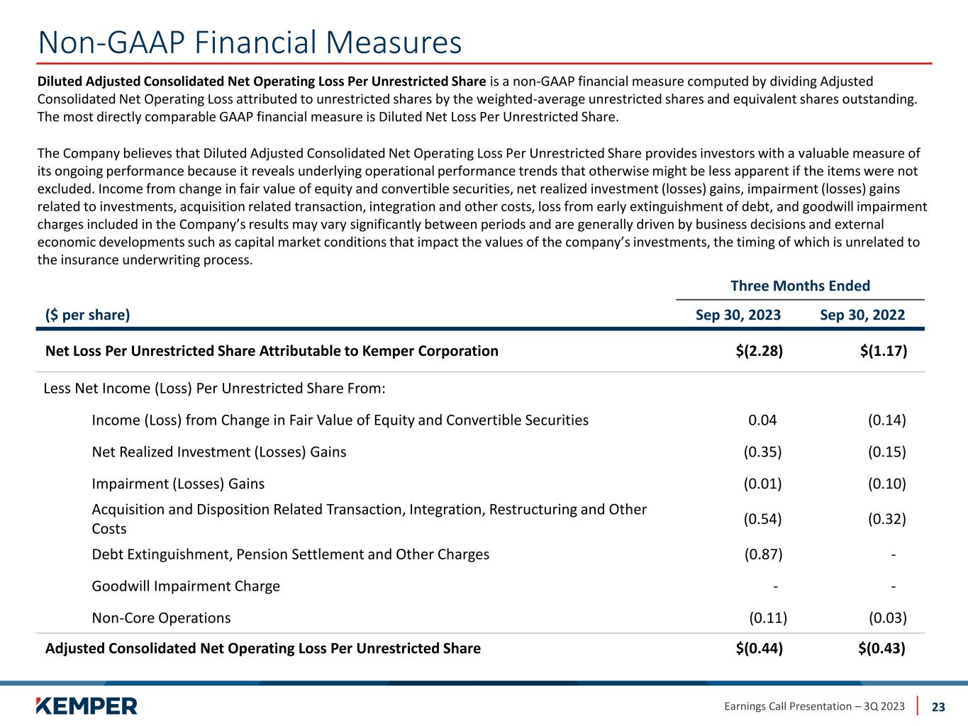 Earnings Call Presentation – 3Q 2023 Non-GAAP Financial Measures 23 Diluted Adjusted Consolidated Net Operating Loss Per Unrestricted Share is a non-GAAP financial measure computed by dividing Adjusted Consolidated Net Operating Loss attributed to unrestricted shares by the weighted-average unrestricted shares and equivalent shares outstanding. The most directly comparable GAAP financial measure is Diluted Net Loss Per Unrestricted Share. The Company believes that Diluted Adjusted Consolidated Net Operating Loss Per Unrestricted Share provides investors with a valuable measure of its ongoing performance because it reveals underlying operational performance trends that otherwise might be less apparent if the items were not excluded. Income from change in fair value of equity and convertible securities, net realized investment (losses) gains, impairment (losses) gains related to investments, acquisition related transaction, integration and other costs, loss from early extinguishment of debt, and goodwill impairment charges included in the Company’s results may vary significantly between periods and are generally driven by business decisions and external economic developments such as capital market conditions that impact the values of the company’s investments, the timing of which is unrelated to the insurance underwriting process. Three Months Ended ​​($ per share) Sep 30, 2023 Sep 30, 2022 Net Loss Per Unrestricted Share Attributable to Kemper Corporation $(2.28) $(1.17) Less Net Income (Loss) Per Unrestricted Share From: Income (Loss) from Change in Fair Value of Equity and Convertible Securities 0.04 (0.14) Net Realized Investment (Losses) Gains (0.35) (0.15) Impairment (Losses) Gains (0.01) (0.10) Acquisition and Disposition Related Transaction, Integration, Restructuring and Other Costs (0.54) (0.32) Debt Extinguishment, Pension Settlement and Other Charges (0.87) - Goodwill Impairment Charge - - Non-Core Operations (0.11) (0.03) Adjusted Consolidated Net Operating Loss Per Unrestricted Share $(0.44) $(0.43)