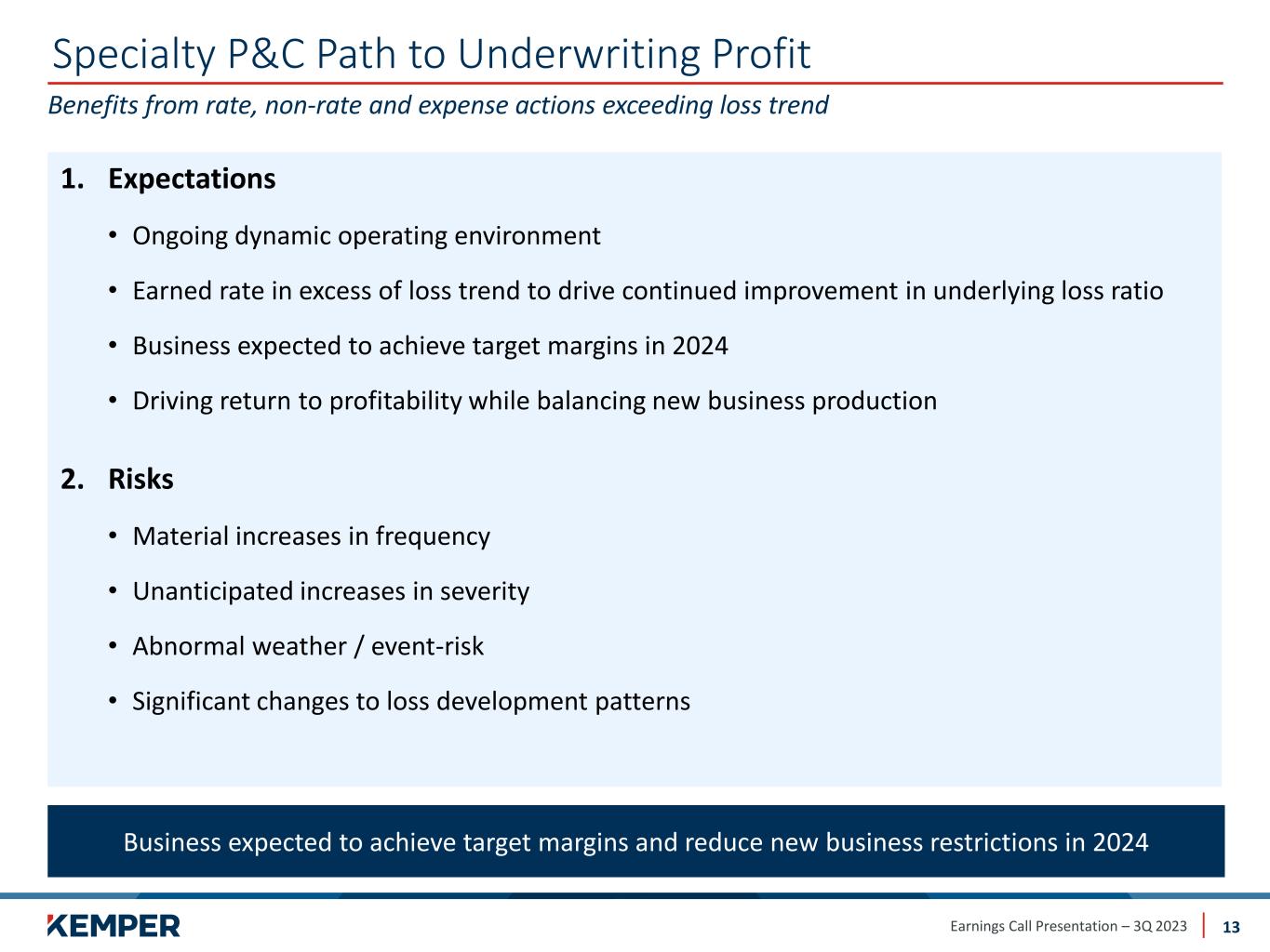 Earnings Call Presentation – 3Q 2023 ~58% ~57% ~30% Filed Rate Written Rate Earned Rate Specialty Property & Casualty Insurance Segment 12 Underlying combined ratio improved 6.3 points year-over-year and 1.5 points sequentially 106.8 107.8 108.0 102.0 100.5 3Q'22 4Q'22 1Q'23 2Q'23 3Q'23 Underlying Combined Ratio2 (% ) Highlights • Sequential improvement driven by additional earned rate and non-rate actions • Continuing new business underwriting restrictions • Loss trends remain elevated, but have stabilized • Moderate level of CAT activity ̶ $6 million driven by tropical storms and Midwest wind / hail events Metrics ($ in millions) 3Q’23 3Q’22 Change vs. 3Q’22 Earned Premiums $890 $1,000 (11.0)% Underlying Loss & LAE Ratio2 80.0% 86.9% (6.9)pts Expense Ratio 20.5% 19.9% 0.6pts Policies In-Force (000s) 1,334 1,922 (30.6)% Cumulative PPA Rate Activity Since 2Q’211 1 Represents the cumulative weighted average rate impact of actual filings on the total book 2 Non-GAAP financial measure; see reconciliation in appendix on pages 19-25 Committed to reaching target profitability in 2024 despite ongoing dynamic operating environment