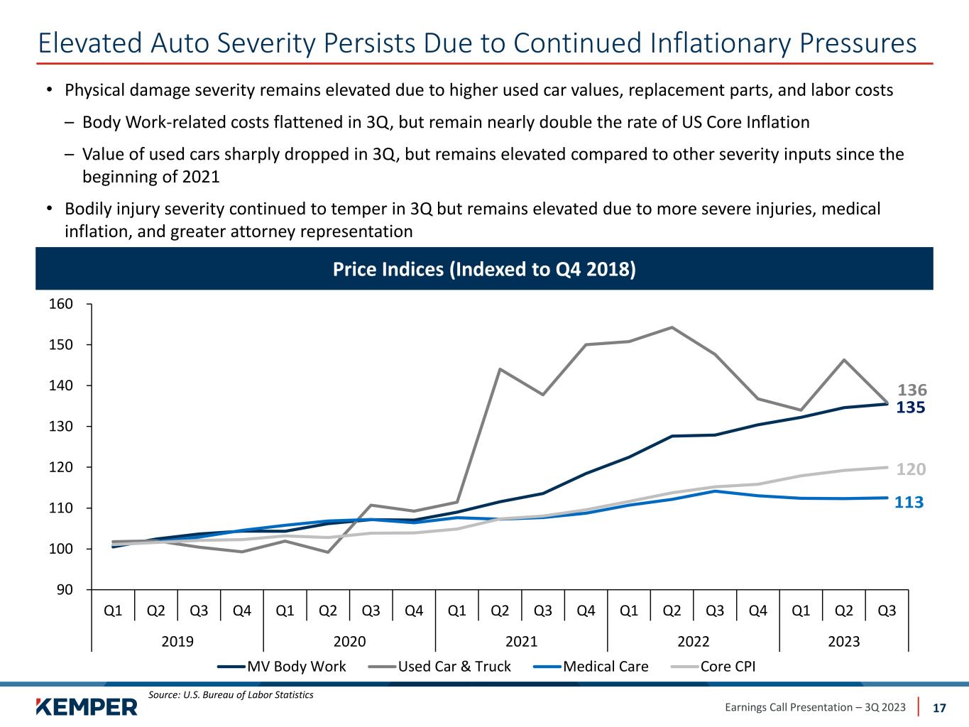 Earnings Call Presentation – 3Q 2023 17 Elevated Auto Severity Persists Due to Continued Inflationary Pressures • Physical damage severity remains elevated due to higher used car values, replacement parts, and labor costs – Body Work-related costs flattened in 3Q, but remain nearly double the rate of US Core Inflation – Value of used cars sharply dropped in 3Q, but remains elevated compared to other severity inputs since the beginning of 2021 • Bodily injury severity continued to temper in 3Q but remains elevated due to more severe injuries, medical inflation, and greater attorney representation Price Indices (Indexed to Q4 2018) Source: U.S. Bureau of Labor Statistics 90 100 110 120 130 140 150 160 Q1 Q2 Q3 Q4 Q1 Q2 Q3 Q4 Q1 Q2 Q3 Q4 Q1 Q2 Q3 Q4 Q1 Q2 Q3 2019 2020 2021 2022 2023 MV Body Work Used Car & Truck Medical Care Core CPI 135 136 113 120