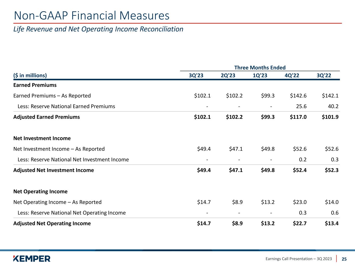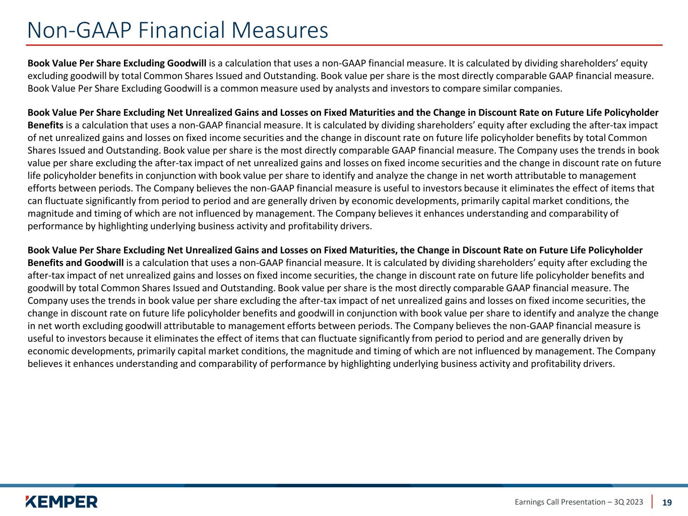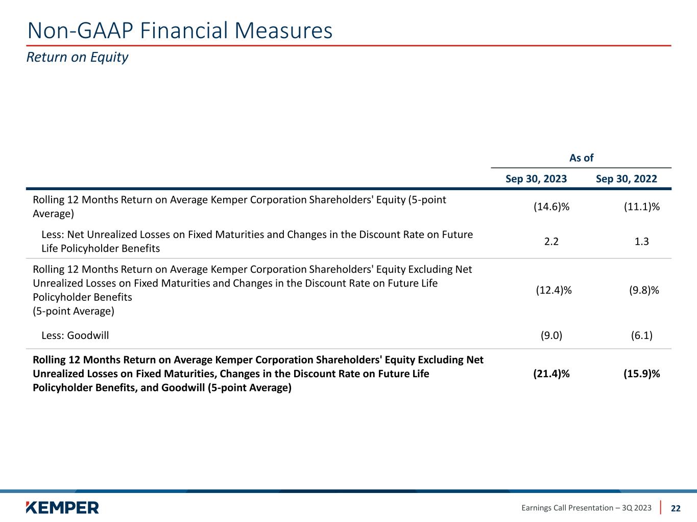 Earnings Call Presentation – 3Q 2023 Non-GAAP Financial Measures 22 Return on Equity As of Sep 30, 2023 Sep 30, 2022 Rolling 12 Months Return on Average Kemper Corporation Shareholders' Equity (5-point Average) (14.6)%​ (11.1)%​ Less: Net Unrealized Losses on Fixed Maturities ​ and Changes in the Discount Rate on Future Life Policyholder Benefits 2.2 1.3 Rolling 12 Months Return on Average Kemper Corporation Shareholders' Equity Excluding Net Unrealized Losses on Fixed Maturities and Changes in the Discount Rate on Future Life Policyholder Benefits (5-point Average) (12.4)%​ (9.8)%​ Less: Goodwill (9.0) (6.1) Rolling 12 Months Return on Average Kemper Corporation Shareholders' Equity Excluding Net Unrealized Losses on Fixed Maturities, Changes in the Discount Rate on Future Life Policyholder Benefits, and Goodwill (5-point Average) (21.4)% (15.9)%