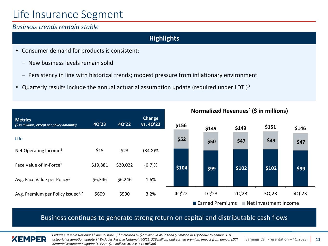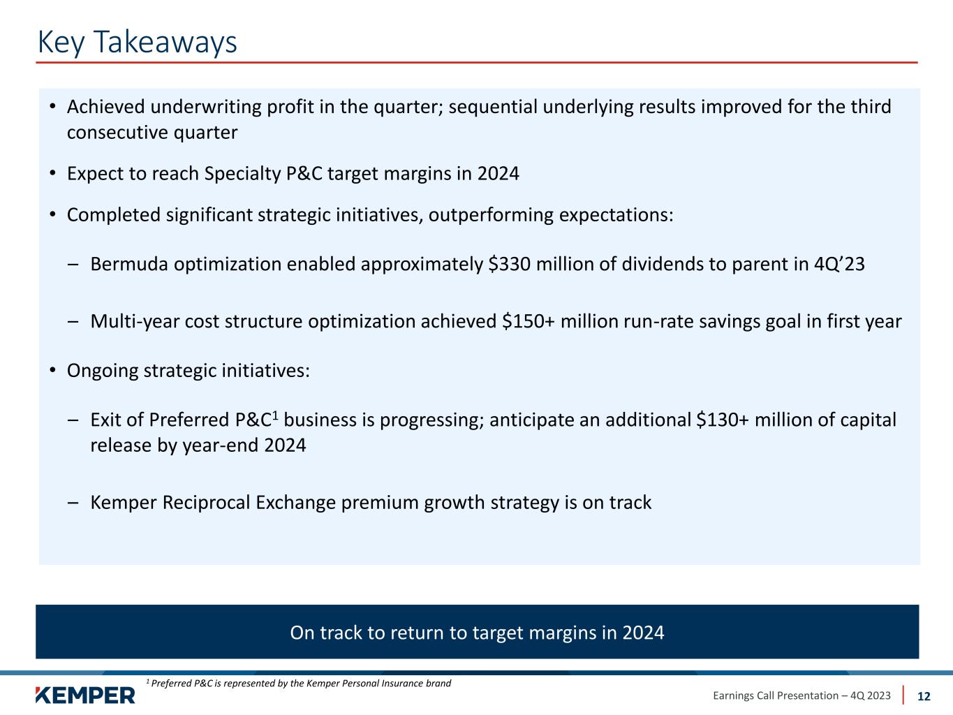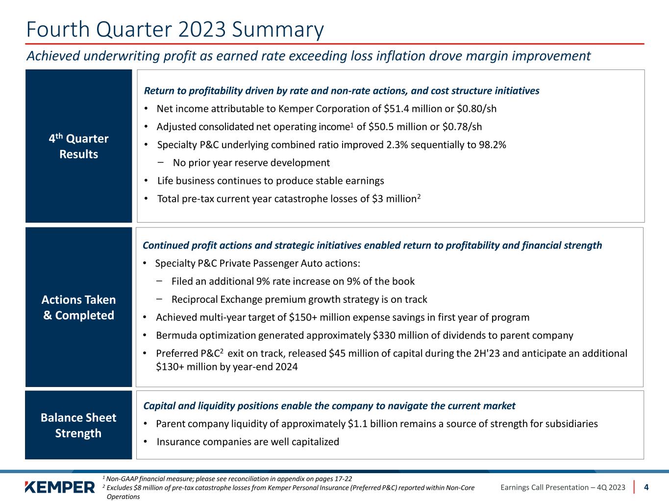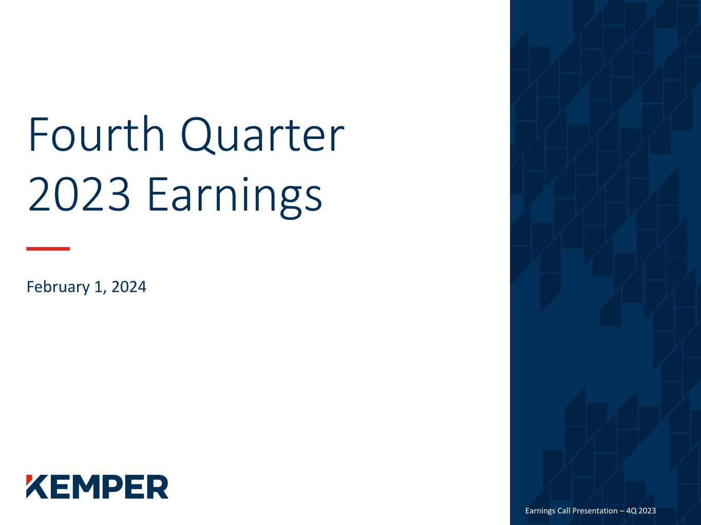 Earnings Call Presentation – 4Q 2023 Preliminary Matters 2 Cautionary Statements Regarding Forward-Looking Information This presentation may contain or incorporate by reference information that includes or is based on forward-looking statements within the meaning of the safe-harbor provisions of the Private Securities Litigation Reform Act of 1995. We caution investors that these forward-looking statements are not guarantees of future performance, and actual results may differ materially. Such statements involve known and unknown risks, uncertainties, and other factors, including but not limited to: • changes in the frequency and severity of insurance claims; • claim development and the process of estimating claim reserves; • the impacts of inflation; • changes in interest rate environment; • supply chain disruption; • product demand and pricing; • effects of governmental and regulatory actions; • litigation outcomes and trends; • investment risks; • cybersecurity risks; • impact of catastrophes; and • other risks and uncertainties detailed in Kemper’s Annual Report on Form 10-K and subsequent filings with the Securities and Exchange Commission (“SEC”). Kemper assumes no obligation to publicly correct or update any forward-looking statements as a result of events or developments subsequent to the date of this presentation. Non-GAAP Financial Measures This presentation contains non-GAAP financial measures that the company believes are meaningful to investors. Non-GAAP financial measures have been reconciled to the most comparable GAAP financial measure.
