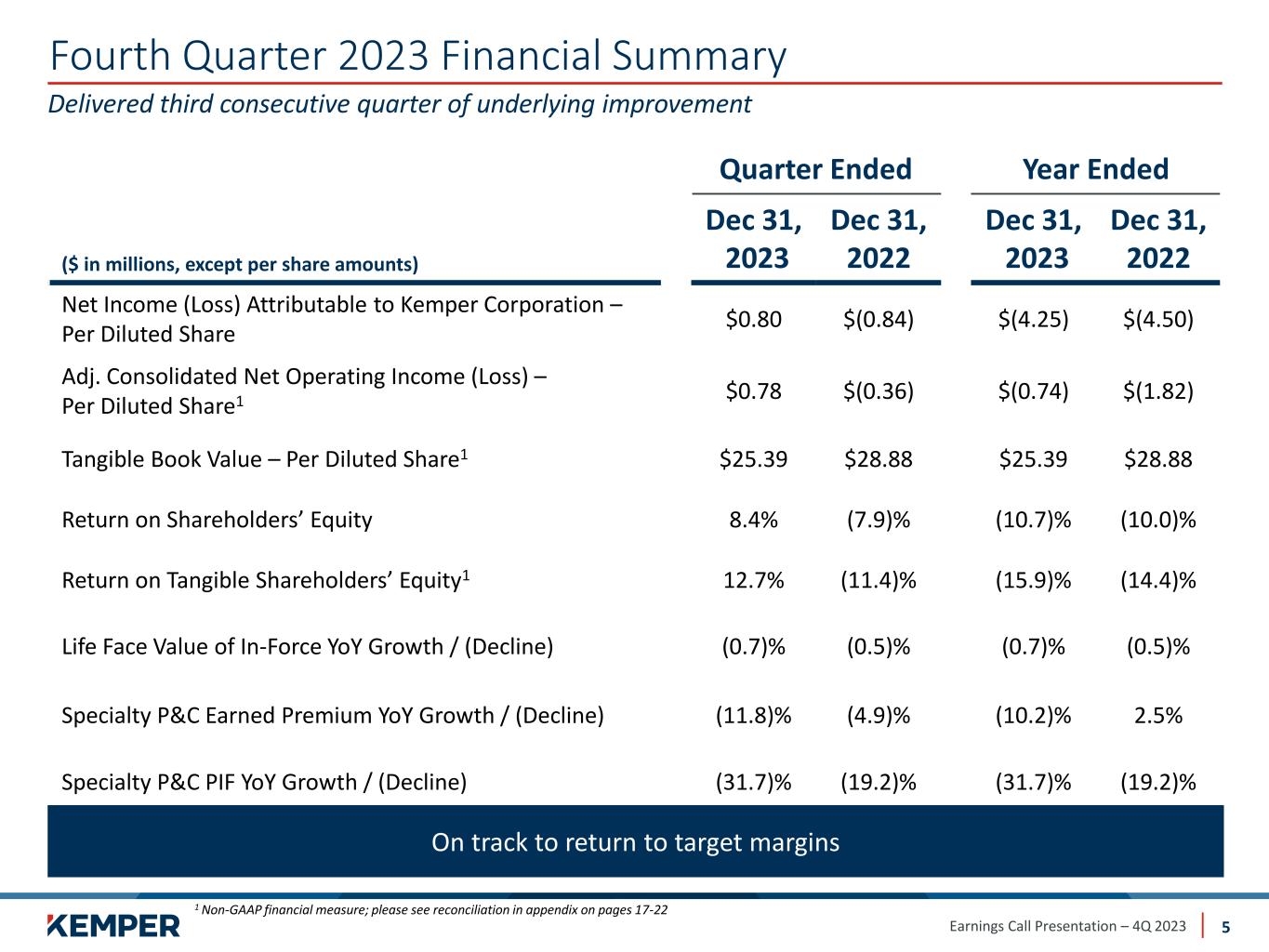 Earnings Call Presentation – 4Q 2023 Fourth Quarter 2023 Summary 4 Achieved underwriting profit as earned rate exceeding loss inflation drove margin improvement Continued profit actions and strategic initiatives enabled return to profitability and financial strength • Specialty P&C Private Passenger Auto actions: ̶ Filed an additional 9% rate increase on 9% of the book ̶ Reciprocal Exchange premium growth strategy is on track • Achieved multi-year target of $150+ million expense savings in first year of program • Bermuda optimization generated approximately $330 million of dividends to parent company • Preferred P&C2 exit on track, released $45 million of capital during the 2H'23 and anticipate an additional $130+ million by year-end 2024 Actions Taken & Completed Return to profitability driven by rate and non-rate actions, and cost structure initiatives • Net income attributable to Kemper Corporation of $51.4 million or $0.80/sh • Adjusted consolidated net operating income1 of $50.5 million or $0.78/sh • Specialty P&C underlying combined ratio improved 2.3% sequentially to 98.2% ̶ No prior year reserve development • Life business continues to produce stable earnings • Total pre-tax current year catastrophe losses of $3 million2 4th Quarter Results Capital and liquidity positions enable the company to navigate the current market • Parent company liquidity of approximately $1.1 billion remains a source of strength for subsidiaries • Insurance companies are well capitalized Balance Sheet Strength 1 Non-GAAP financial measure; please see reconciliation in appendix on pages 17-22 2 Excludes $8 million of pre-tax catastrophe losses from Kemper Personal Insurance (Preferred P&C) reported within Non-Core Operations