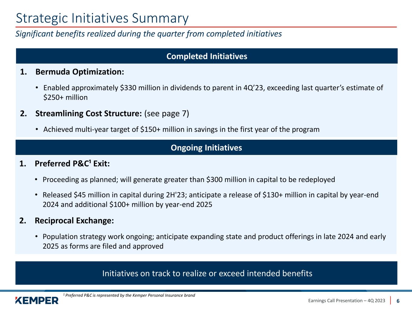 Earnings Call Presentation – 4Q 2023 Fourth Quarter 2023 Financial Summary 5 Delivered third consecutive quarter of underlying improvement Quarter Ended Year Ended ($ in millions, except per share amounts) Dec 31, 2023 Dec 31, 2022 Dec 31, 2023 Dec 31, 2022 Net Income (Loss) Attributable to Kemper Corporation – Per Diluted Share $0.80 $(0.84) $(4.25) $(4.50) Adj. Consolidated Net Operating Income (Loss) – Per Diluted Share1 $0.78 $(0.36) $(0.74) $(1.82) Tangible Book Value – Per Diluted Share1 $25.39 $28.88 $25.39 $28.88 Return on Shareholders’ Equity 8.4% (7.9)% (10.7)% (10.0)% Return on Tangible Shareholders’ Equity1 12.7% (11.4)% (15.9)% (14.4)% Life Face Value of In-Force YoY Growth / (Decline) (0.7)% (0.5)% (0.7)% (0.5)% Specialty P&C Earned Premium YoY Growth / (Decline) (11.8)% (4.9)% (10.2)% 2.5% Specialty P&C PIF YoY Growth / (Decline) (31.7)% (19.2)% (31.7)% (19.2)% 1 Non-GAAP financial measure; please see reconciliation in appendix on pages 17-22 On track to return to target margins