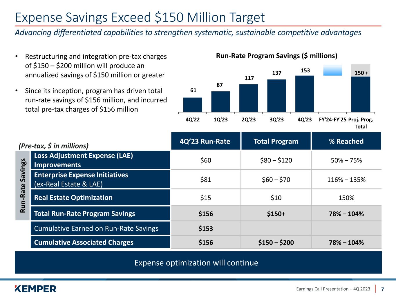 Earnings Call Presentation – 4Q 2023 Strategic Initiatives Summary 6 Significant benefits realized during the quarter from completed initiatives Initiatives on track to realize or exceed intended benefits 1. Bermuda Optimization: • Enabled approximately $330 million in dividends to parent in 4Q’23, exceeding last quarter’s estimate of $250+ million 2. Streamlining Cost Structure: (see page 7) • Achieved multi-year target of $150+ million in savings in the first year of the program Completed Initiatives 1. Preferred P&C¹ Exit: • Proceeding as planned; will generate greater than $300 million in capital to be redeployed • Released $45 million in capital during 2H'23; anticipate a release of $130+ million in capital by year-end 2024 and additional $100+ million by year-end 2025 2. Reciprocal Exchange: • Population strategy work ongoing; anticipate expanding state and product offerings in late 2024 and early 2025 as forms are filed and approved Ongoing Initiatives 1 Preferred P&C is represented by the Kemper Personal Insurance brand
