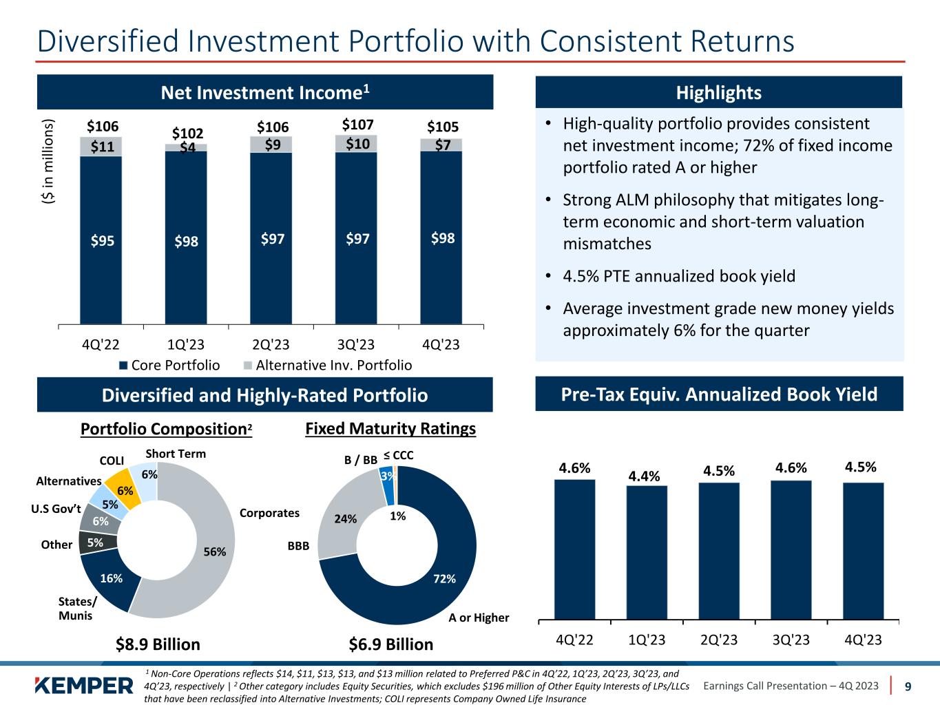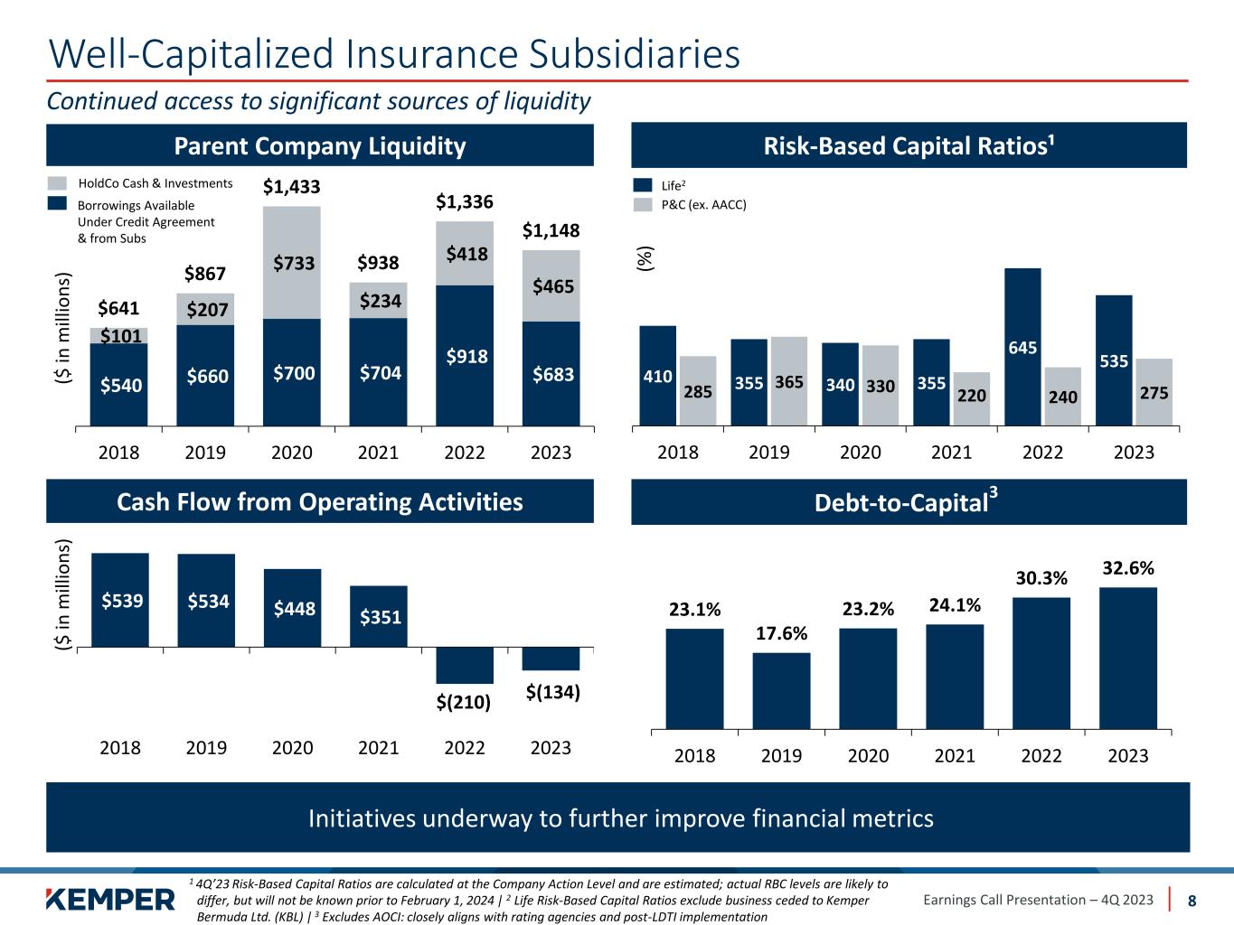 Earnings Call Presentation – 4Q 2023 Well-Capitalized Insurance Subsidiaries 8 Continued access to significant sources of liquidity Initiatives underway to further improve financial metrics 23.1% 17.6% 23.2% 24.1% 30.3% 32.6% 2018 2019 2020 2021 2022 2023 Debt-to-Capital 3 Parent Company Liquidity Risk-Based Capital Ratios¹ $540 $660 $700 $704 $918 $683 $101 $207 $733 $234 $418 $465 $641 $867 $1,433 $938 $1,336 $1,148 2018 2019 2020 2021 2022 2023 (% ) Debt Cash Flow from Operating Activities ($ in m ill io n s) $539 $534 $448 $351 $(210) $(134) 2018 2019 2020 2021 2022 2023 HoldCo Cash & Investments Borrowings Available Under Credit Agreement & from Subs P&C (ex. AACC) Life2 1 4Q’23 Risk-Based Capital Ratios are calculated at the Company Action Level and are estimated; actual RBC levels are likely to differ, but will not be known prior to February 1, 2024 | 2 Life Risk-Based Capital Ratios exclude business ceded to Kemper Bermuda Ltd. (KBL) | 3 Excludes AOCI: closely aligns with rating agencies and post-LDTI implementation ($ in m ill io n s) 410 355 340 355 645 535 285 365 330 220 240 275 2018 2019 2020 2021 2022 2023