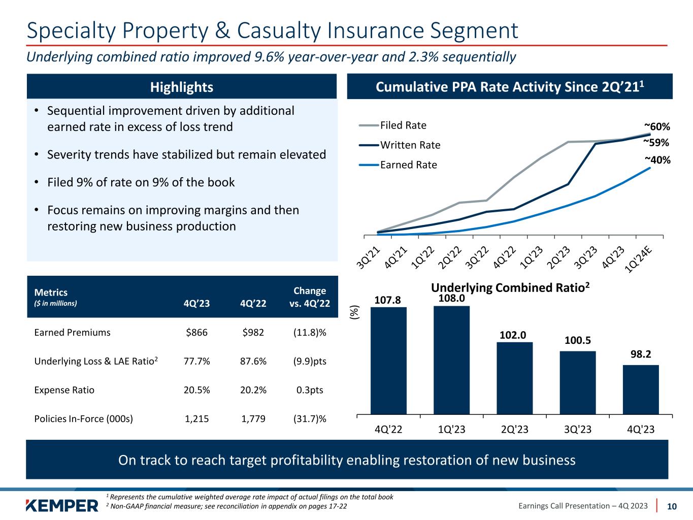 Earnings Call Presentation – 4Q 2023 Target top quartile value creation for customers, employees and shareholders Leading Insurer Empowering Specialty and Underserved Markets Enabled by a dynamic, diverse and innovative team who act like owners 3 Distribution Have Limited or Unfocused Competition Require Unique Expertise Sizable Market Delivering appropriate and affordable insurance and financial solutions Specialty auto insurance1 for underserved markets; Latino, Hispanic and urban areas Life insurance2 for low/modest income customers Market Characteristics Differentiated Capabilities Product SophisticationEase of UseLow-Cost Management Enable Systematic, Sustainable Competitive Advantages (SSCAs) 1 Kemper Auto is equivalent to the Specialty Property & Casualty Insurance Segment 2 Kemper Life is equivalent to the Life Insurance Segment