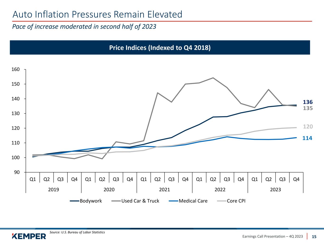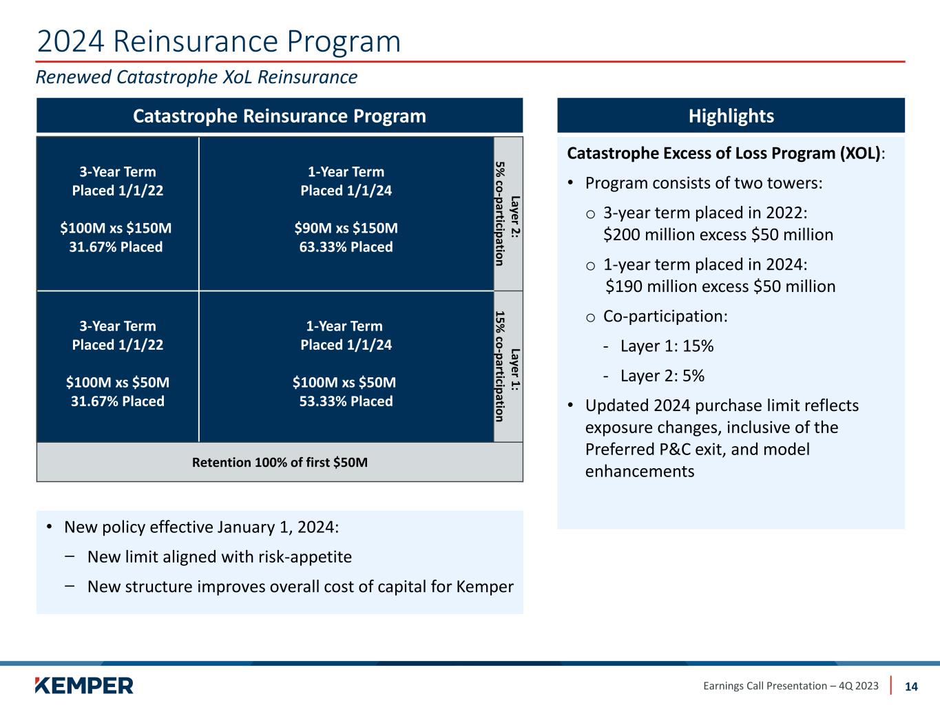 Earnings Call Presentation – 4Q 2023 2024 Reinsurance Program 14 Renewed Catastrophe XoL Reinsurance • New policy effective January 1, 2024: ̶ New limit aligned with risk-appetite ̶ New structure improves overall cost of capital for Kemper Catastrophe Excess of Loss Program (XOL): • Program consists of two towers: o 3-year term placed in 2022: $200 million excess $50 million o 1-year term placed in 2024: $190 million excess $50 million o Co-participation: - Layer 1: 15% - Layer 2: 5% • Updated 2024 purchase limit reflects exposure changes, inclusive of the Preferred P&C exit, and model enhancements HighlightsCatastrophe Reinsurance Program 3-Year Term Placed 1/1/22 $100M xs $150M 31.67% Placed 1-Year Term Placed 1/1/24 $90M xs $150M 63.33% Placed Laye r 2 : 5 % co -p articip atio n 3-Year Term Placed 1/1/22 $100M xs $50M 31.67% Placed 1-Year Term Placed 1/1/24 $100M xs $50M 53.33% Placed Laye r 1 : 1 5 % co -p articip atio n Retention 100% of first $50M