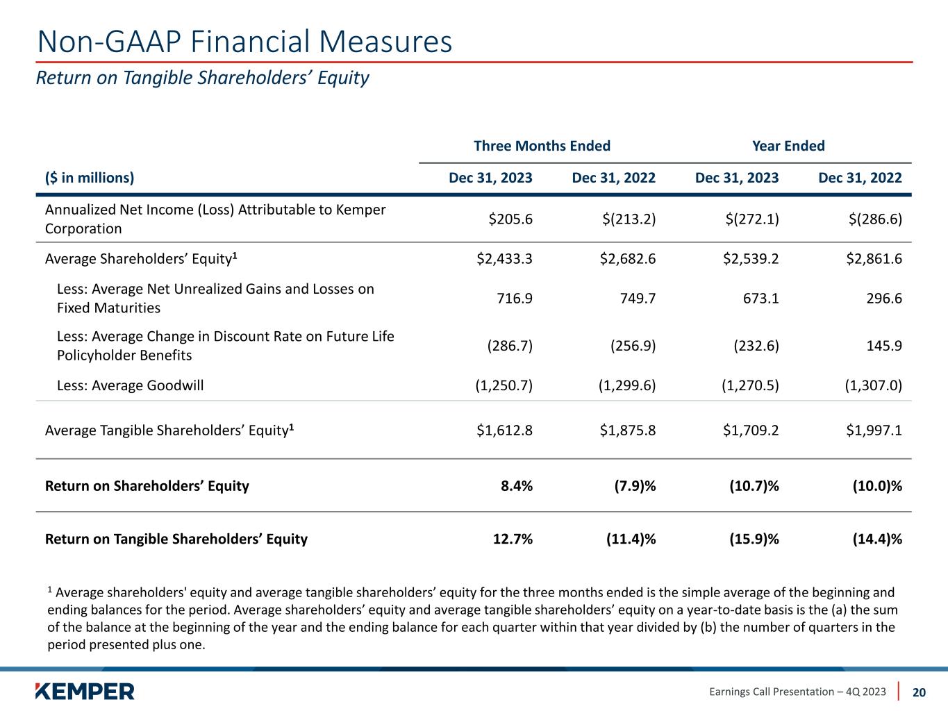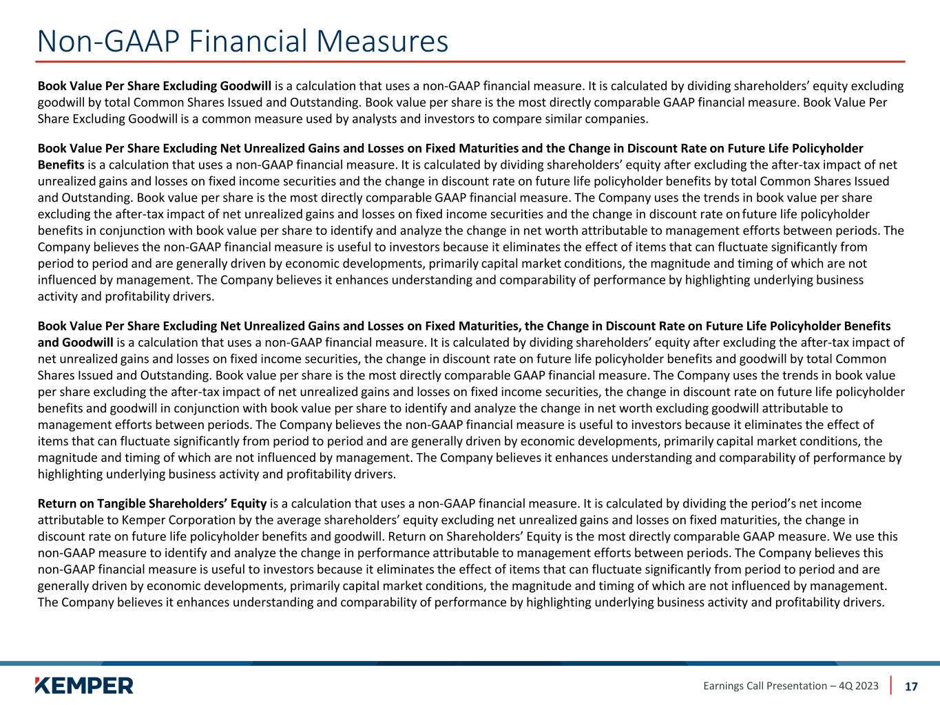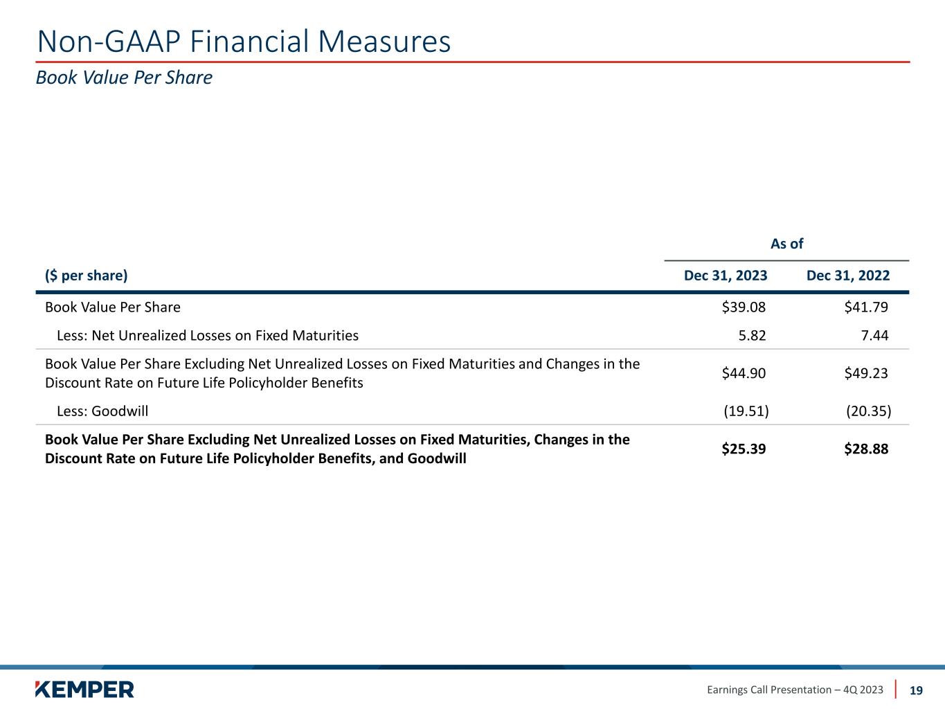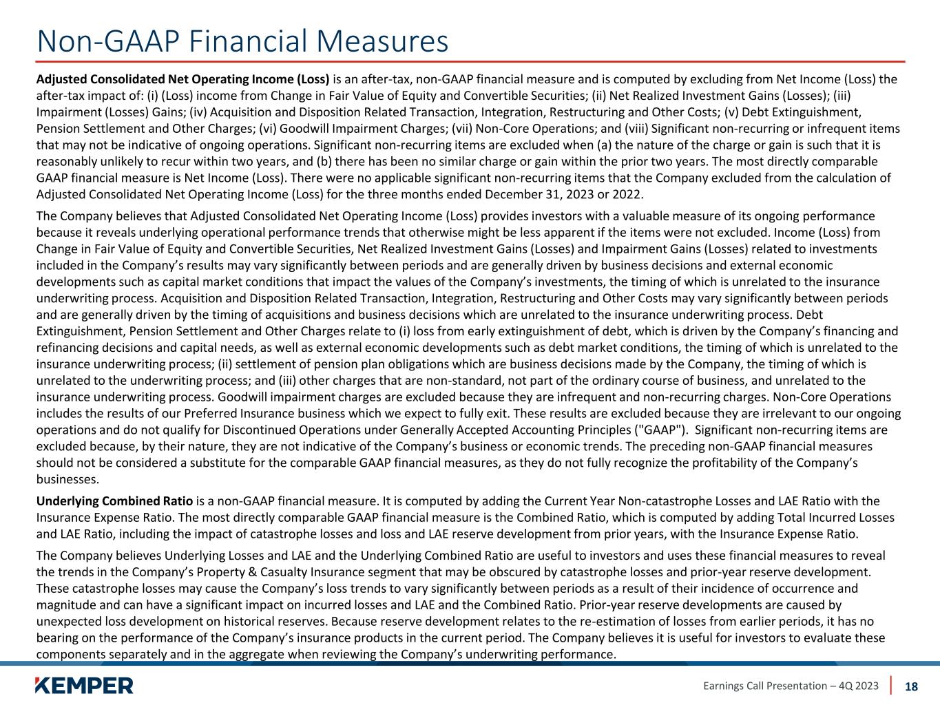 Earnings Call Presentation – 4Q 2023 Non-GAAP Financial Measures 17 Book Value Per Share Excluding Goodwill is a calculation that uses a non-GAAP financial measure. It is calculated by dividing shareholders’ equity excluding goodwill by total Common Shares Issued and Outstanding. Book value per share is the most directly comparable GAAP financial measure. Book Value Per Share Excluding Goodwill is a common measure used by analysts and investors to compare similar companies. Book Value Per Share Excluding Net Unrealized Gains and Losses on Fixed Maturities and the Change in Discount Rate on Future Life Policyholder Benefits is a calculation that uses a non-GAAP financial measure. It is calculated by dividing shareholders’ equity after excluding the after-tax impact of net unrealized gains and losses on fixed income securities and the change in discount rate on future life policyholder benefits by total Common Shares Issued and Outstanding. Book value per share is the most directly comparable GAAP financial measure. The Company uses the trends in book value per share excluding the after-tax impact of net unrealized gains and losses on fixed income securities and the change in discount rate on future life policyholder benefits in conjunction with book value per share to identify and analyze the change in net worth attributable to management efforts between periods. The Company believes the non-GAAP financial measure is useful to investors because it eliminates the effect of items that can fluctuate significantly from period to period and are generally driven by economic developments, primarily capital market conditions, the magnitude and timing of which are not influenced by management. The Company believes it enhances understanding and comparability of performance by highlighting underlying business activity and profitability drivers. Book Value Per Share Excluding Net Unrealized Gains and Losses on Fixed Maturities, the Change in Discount Rate on Future Life Policyholder Benefits and Goodwill is a calculation that uses a non-GAAP financial measure. It is calculated by dividing shareholders’ equity after excluding the after-tax impact of net unrealized gains and losses on fixed income securities, the change in discount rate on future life policyholder benefits and goodwill by total Common Shares Issued and Outstanding. Book value per share is the most directly comparable GAAP financial measure. The Company uses the trends in book value per share excluding the after-tax impact of net unrealized gains and losses on fixed income securities, the change in discount rate on future life policyholder benefits and goodwill in conjunction with book value per share to identify and analyze the change in net worth excluding goodwill attributable to management efforts between periods. The Company believes the non-GAAP financial measure is useful to investors because it eliminates the effect of items that can fluctuate significantly from period to period and are generally driven by economic developments, primarily capital market conditions, the magnitude and timing of which are not influenced by management. The Company believes it enhances understanding and comparability of performance by highlighting underlying business activity and profitability drivers. Return on Tangible Shareholders’ Equity is a calculation that uses a non-GAAP financial measure. It is calculated by dividing the period’s net income attributable to Kemper Corporation by the average shareholders’ equity excluding net unrealized gains and losses on fixed maturities, the change in discount rate on future life policyholder benefits and goodwill. Return on Shareholders’ Equity is the most directly comparable GAAP measure. We use this non-GAAP measure to identify and analyze the change in performance attributable to management efforts between periods. The Company believes this non-GAAP financial measure is useful to investors because it eliminates the effect of items that can fluctuate significantly from period to period and are generally driven by economic developments, primarily capital market conditions, the magnitude and timing of which are not influenced by management. The Company believes it enhances understanding and comparability of performance by highlighting underlying business activity and profitability drivers.