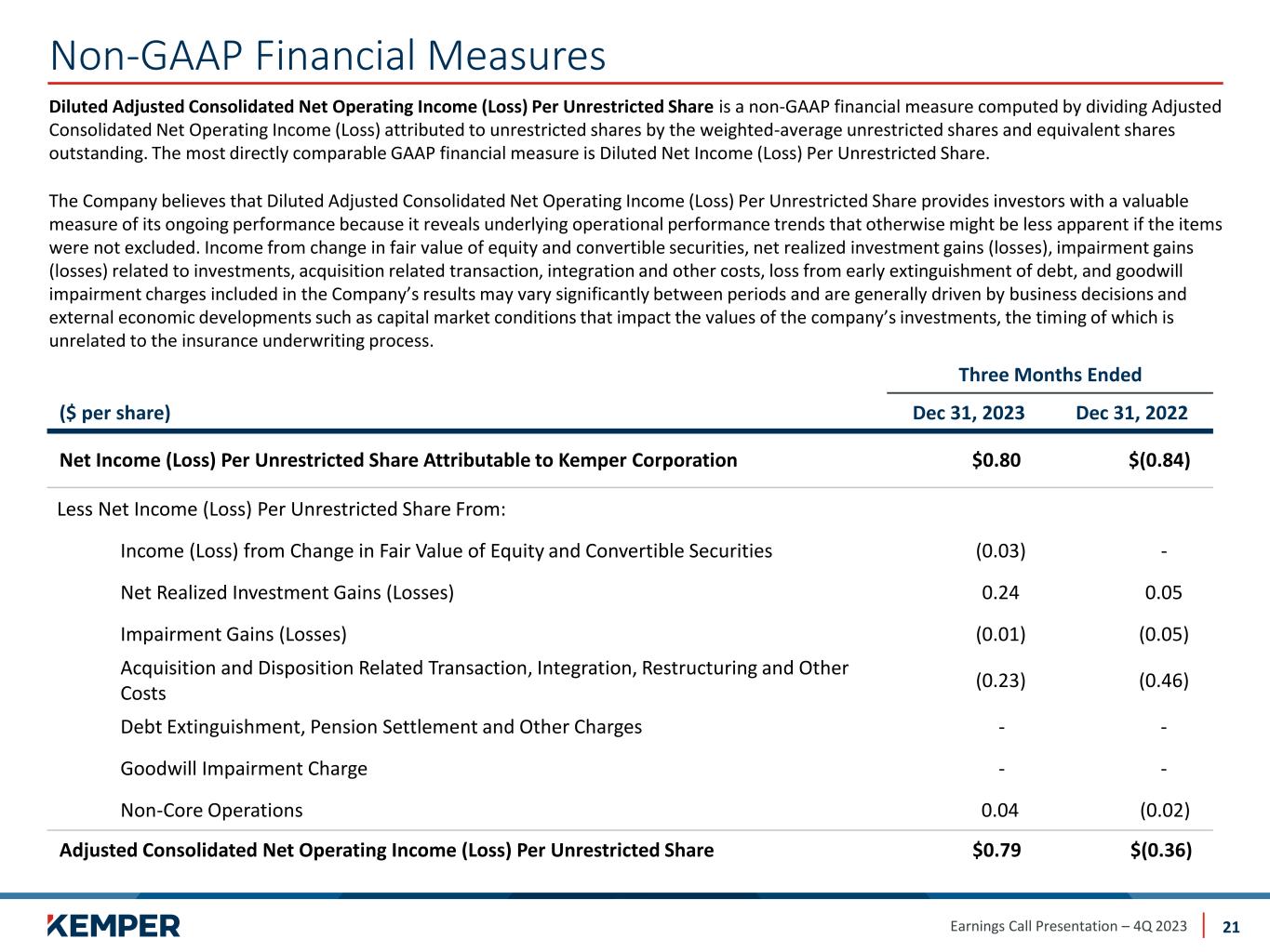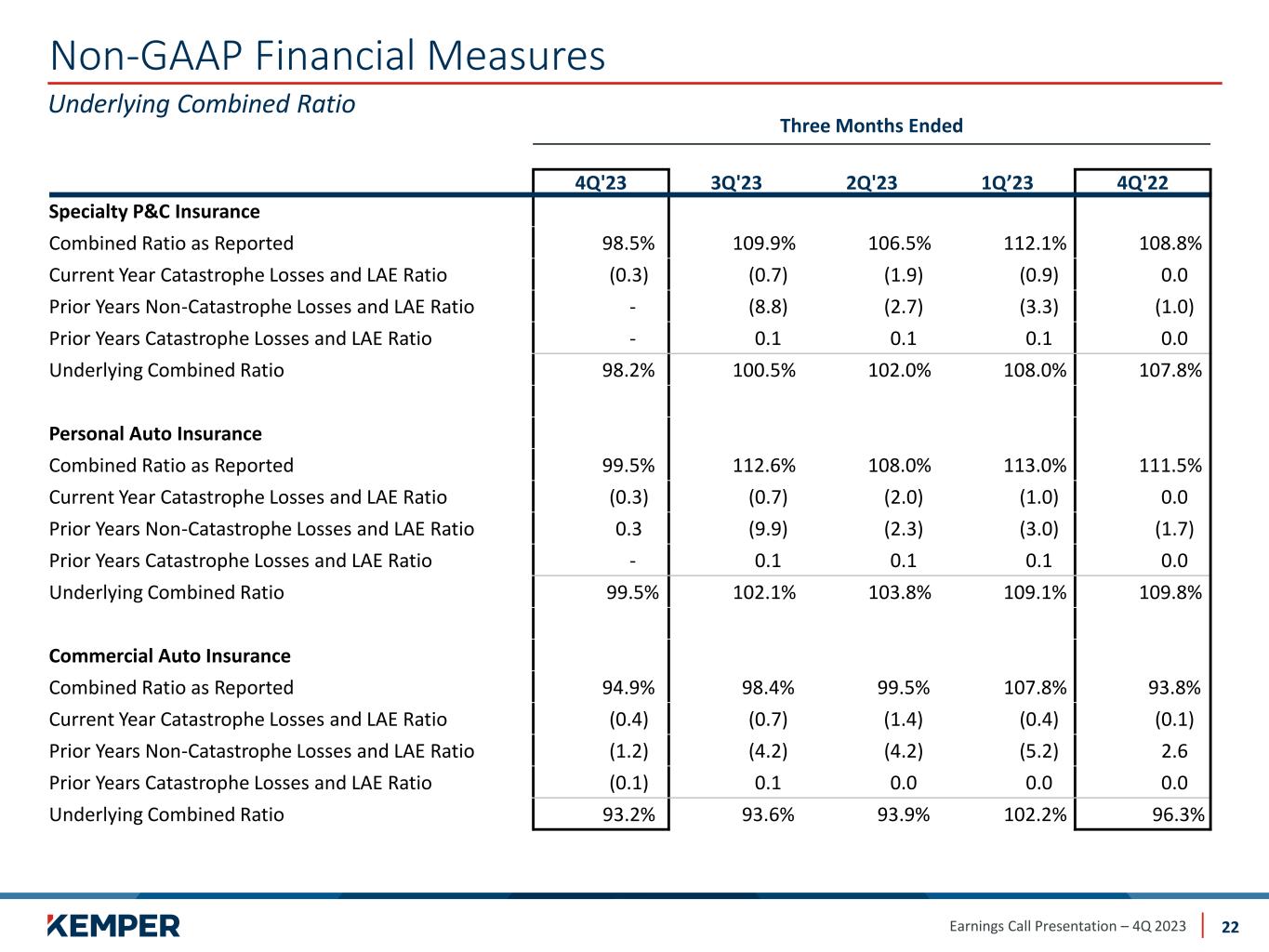 Earnings Call Presentation – 4Q 2023 Non-GAAP Financial Measures 21 Diluted Adjusted Consolidated Net Operating Income (Loss) Per Unrestricted Share is a non-GAAP financial measure computed by dividing Adjusted Consolidated Net Operating Income (Loss) attributed to unrestricted shares by the weighted-average unrestricted shares and equivalent shares outstanding. The most directly comparable GAAP financial measure is Diluted Net Income (Loss) Per Unrestricted Share. The Company believes that Diluted Adjusted Consolidated Net Operating Income (Loss) Per Unrestricted Share provides investors with a valuable measure of its ongoing performance because it reveals underlying operational performance trends that otherwise might be less apparent if the items were not excluded. Income from change in fair value of equity and convertible securities, net realized investment gains (losses), impairment gains (losses) related to investments, acquisition related transaction, integration and other costs, loss from early extinguishment of debt, and goodwill impairment charges included in the Company’s results may vary significantly between periods and are generally driven by business decisions and external economic developments such as capital market conditions that impact the values of the company’s investments, the timing of which is unrelated to the insurance underwriting process. Three Months Ended ​​($ per share) Dec 31, 2023​ Dec 31, 2022 Net Income (Loss) Per Unrestricted Share Attributable to Kemper Corporation $0.80 $(0.84) Less Net Income (Loss) Per Unrestricted Share From: Income (Loss) from Change in Fair Value of Equity and Convertible Securities (0.03) - Net Realized Investment Gains (Losses) 0.24 0.05 Impairment Gains (Losses) (0.01) (0.05) Acquisition and Disposition Related Transaction, Integration, Restructuring and Other Costs (0.23) (0.46) Debt Extinguishment, Pension Settlement and Other Charges - - Goodwill Impairment Charge - - Non-Core Operations 0.04 (0.02) Adjusted Consolidated Net Operating Income (Loss) Per Unrestricted Share $0.79 $(0.36)