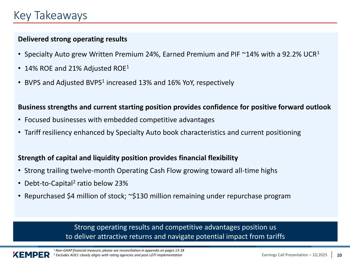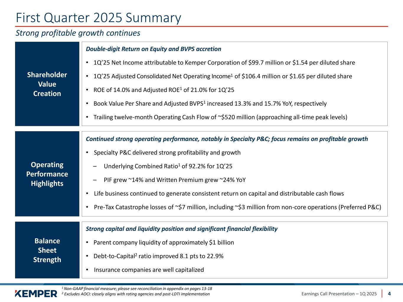 Earnings Call Presentation – 1Q 2025 Target top quartile value creation for customers, employees and shareholders Leading Insurer Empowering Specialty and Underserved Markets 3 Distribution Have Limited or Unfocused Competition Require Unique Expertise Sizable Market Delivering appropriate and affordable insurance and financial solutions Specialty auto insurance1 for underserved markets; Latino, Hispanic and urban areas Life insurance2 for low/moderate income customers Market Characteristics Differentiated Capabilities Product SophisticationEase of UseLow-Cost Management Enable Systematic, Sustainable Competitive Advantages (SSCAs) 1 Kemper Auto is equivalent to the Specialty Property & Casualty Insurance Segment 2 Kemper Life is equivalent to the Life Insurance Segment Enabled by a dynamic, innovative team with broad expertise who act like owners