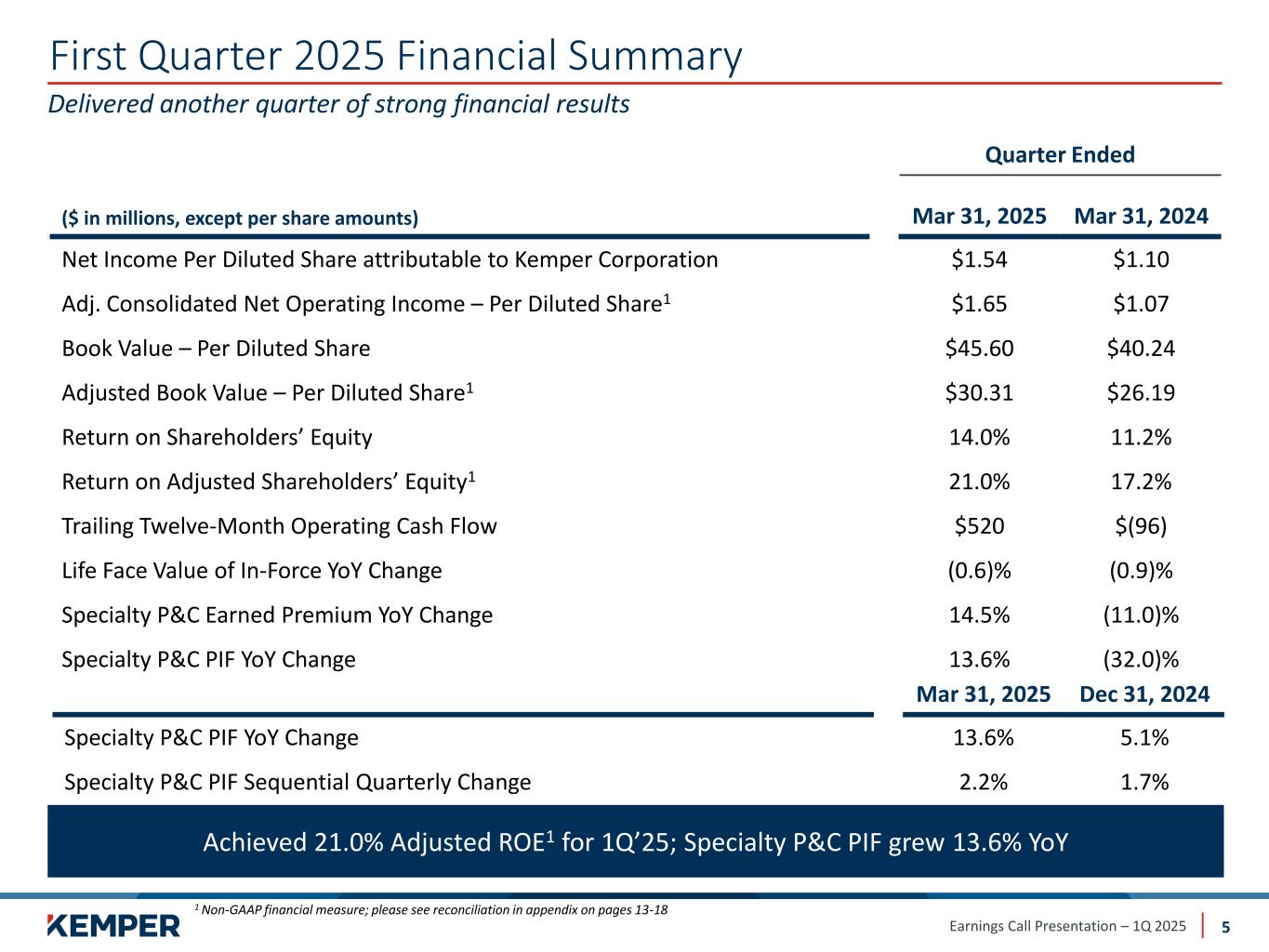 Earnings Call Presentation – 1Q 2025 4 Continued strong operating performance, notably in Specialty P&C; focus remains on profitable growth • Specialty P&C delivered strong profitability and growth – Underlying Combined Ratio1 of 92.2% for 1Q’25 – PIF grew ~14% and Written Premium grew ~24% YoY • Life business continued to generate consistent return on capital and distributable cash flows • Pre-Tax Catastrophe losses of ~$7 million, including ~$3 million from non-core operations (Preferred P&C) Operating Performance Highlights Double-digit Return on Equity and BVPS accretion • 1Q’25 Net Income attributable to Kemper Corporation of $99.7 million or $1.54 per diluted share • 1Q’25 Adjusted Consolidated Net Operating Income1 of $106.4 million or $1.65 per diluted share • ROE of 14.0% and Adjusted ROE1 of 21.0% for 1Q’25 • Book Value Per Share and Adjusted BVPS1 increased 13.3% and 15.7% YoY, respectively • Trailing twelve-month Operating Cash Flow of ~$520 million (approaching all-time peak levels) Shareholder Value Creation Strong capital and liquidity position and significant financial flexibility • Parent company liquidity of approximately $1 billion • Debt-to-Capital2 ratio improved 8.1 pts to 22.9% • Insurance companies are well capitalized Balance Sheet Strength 1 Non-GAAP financial measure; please see reconciliation in appendix on pages 13-18 2 Excludes AOCI: closely aligns with rating agencies and post-LDTI implementation First Quarter 2025 Summary Strong profitable growth continues