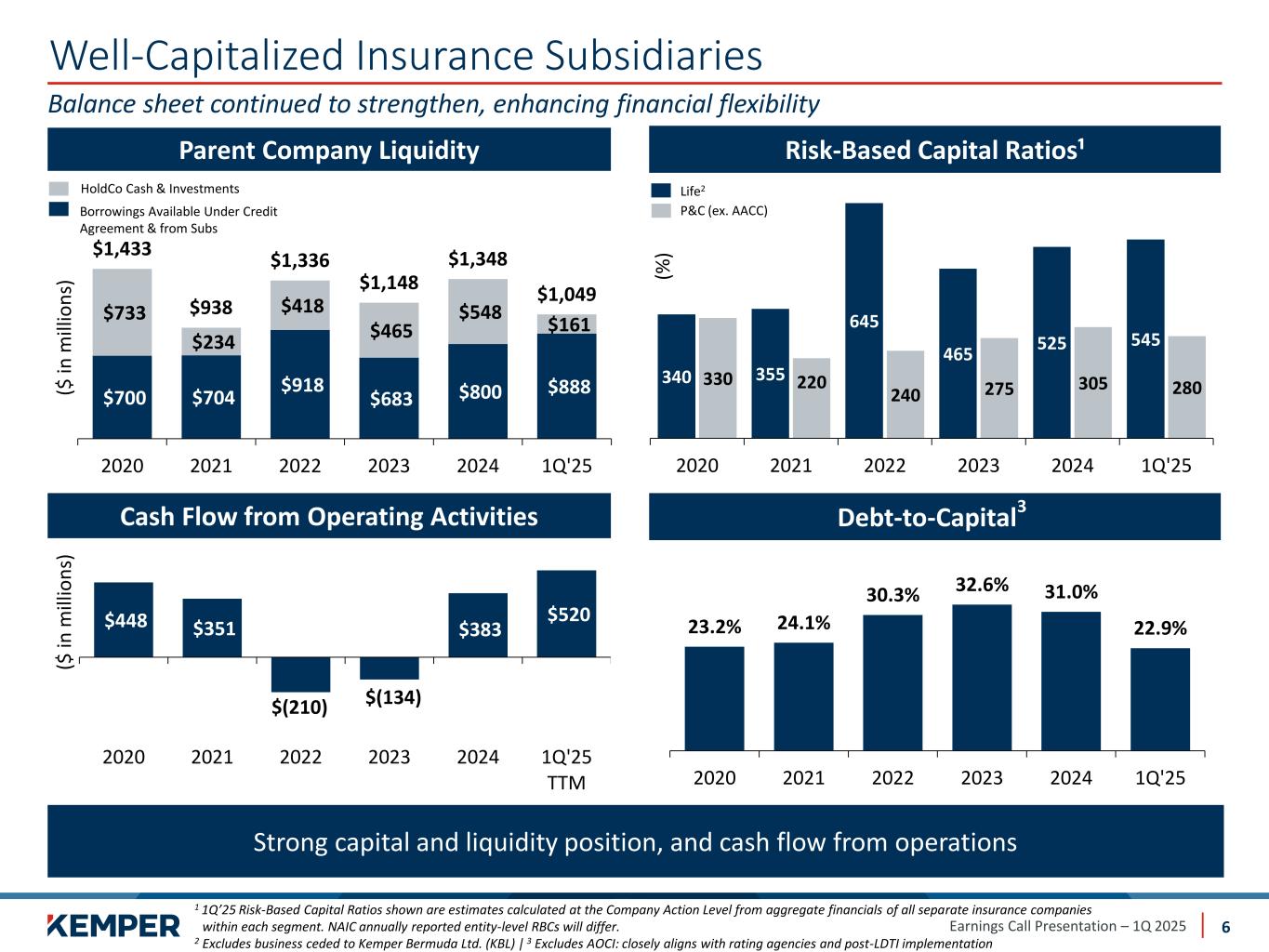 Earnings Call Presentation – 1Q 2025 Mar 31, 2025 Dec 31, 2024 Specialty P&C PIF YoY Change 13.6% 5.1% Specialty P&C PIF Sequential Quarterly Change 2.2% 1.7% First Quarter 2025 Financial Summary 5 Delivered another quarter of strong financial results 1 Non-GAAP financial measure; please see reconciliation in appendix on pages 13-18 Achieved 21.0% Adjusted ROE1 for 1Q’25; Specialty P&C PIF grew 13.6% YoY Quarter Ended ($ in millions, except per share amounts) Mar 31, 2025 Mar 31, 2024 Net Income Per Diluted Share attributable to Kemper Corporation $1.54 $1.10 Adj. Consolidated Net Operating Income – Per Diluted Share1 $1.65 $1.07 Book Value – Per Diluted Share $45.60 $40.24 Adjusted Book Value – Per Diluted Share1 $30.31 $26.19 Return on Shareholders’ Equity 14.0% 11.2% Return on Adjusted Shareholders’ Equity1 21.0% 17.2% Trailing Twelve-Month Operating Cash Flow $520 $(96) Life Face Value of In-Force YoY Change (0.6)% (0.9)% Specialty P&C Earned Premium YoY Change 14.5% (11.0)% Specialty P&C PIF YoY Change 13.6% (32.0)%