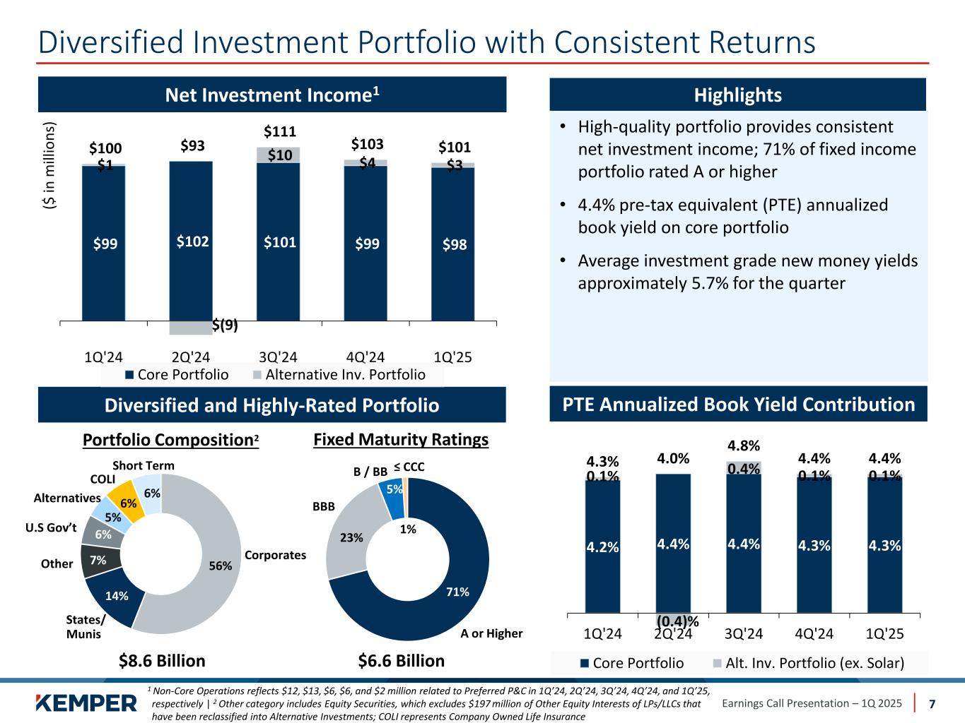 Earnings Call Presentation – 1Q 2025 Well-Capitalized Insurance Subsidiaries 6 Balance sheet continued to strengthen, enhancing financial flexibility Strong capital and liquidity position, and cash flow from operations 23.2% 24.1% 30.3% 32.6% 31.0% 22.9% 2020 2021 2022 2023 2024 1Q'25 Debt-to-Capital 3 Parent Company Liquidity Risk-Based Capital Ratios¹ $700 $704 $918 $683 $800 $888 $733 $234 $418 $465 $548 $161 $1,433 $938 $1,336 $1,148 $1,348 $1,049 2020 2021 2022 2023 2024 1Q'25 (% ) Debt Cash Flow from Operating Activities ($ in m ill io n s) $448 $351 $(210) $(134) $383 $520 2020 2021 2022 2023 2024 1Q'25 TTM HoldCo Cash & Investments Borrowings Available Under Credit Agreement & from Subs P&C (ex. AACC) Life2 1 1Q’25 Risk-Based Capital Ratios shown are estimates calculated at the Company Action Level from aggregate financials of all separate insurance companies within each segment. NAIC annually reported entity-level RBCs will differ. 2 Excludes business ceded to Kemper Bermuda Ltd. (KBL) | 3 Excludes AOCI: closely aligns with rating agencies and post-LDTI implementation ($ in m ill io n s) 340 355 645 465 525 545 330 220 240 275 305 280 2020 2021 2022 2023 2024 1Q'25