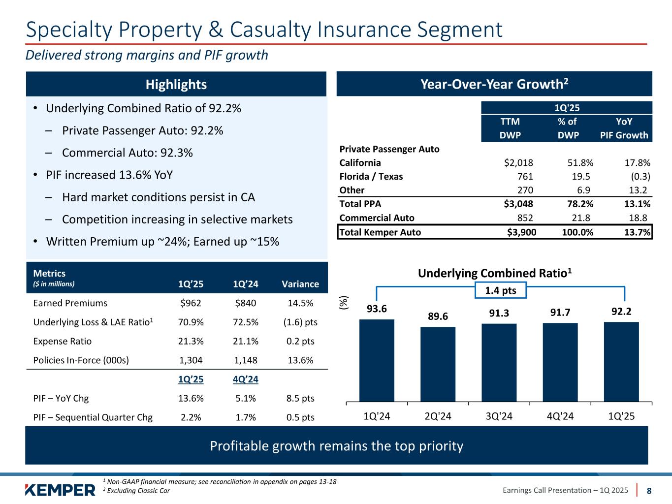 Earnings Call Presentation – 1Q 2025 Non-GAAP Financial Measures 14 Return on Adjusted Shareholders’ Equity is a calculation that uses a non-GAAP financial measure. It is calculated by dividing the period’s Net Income attributable to Kemper Corporation by the average shareholders’ equity excluding net unrealized gains and losses on fixed maturities, the change in discount rate on future life policyholder benefits and goodwill. Return on Shareholders’ Equity is the most directly comparable GAAP measure. We use this non-GAAP measure to identify and analyze the change in performance attributable to management efforts between periods. The Company believes this non-GAAP financial measure is useful to investors because it eliminates the effect of items that can fluctuate significantly from period to period and are generally driven by economic developments, primarily capital market conditions, the magnitude and timing of which are not influenced by management. The Company believes it enhances understanding and comparability of performance by highlighting underlying business activity and profitability drivers. The “Return on Adjusted Shareholders’ Equity” metric was referred to as “Return on Tangible Shareholders’ Equity” in prior periods. Adjusted Book Value Per Share is a calculation that uses a non-GAAP financial measure. It is calculated by dividing shareholders’ equity after excluding the after-tax impact of net unrealized gains and losses on fixed income securities, the change in discount rate on future life policyholder benefits and goodwill by total Common Shares Issued and Outstanding. Book value per share is the most directly comparable GAAP financial measure. The Company uses the trends in book value per share excluding the after-tax impact of net unrealized gains and losses on fixed income securities, the change in discount rate on future life policyholder benefits and goodwill in conjunction with book value per share to identify and analyze the change in net worth excluding goodwill attributable to management efforts between periods. The Company believes the non-GAAP financial measure is useful to investors because it eliminates the effect of items that can fluctuate significantly from period to period and are generally driven by economic developments, primarily capital market conditions, the magnitude and timing of which are not influenced by management. The Company believes it enhances understanding and comparability of performance by highlighting underlying business activity and profitability drivers. The “Adjusted Book Value Per Share” metric was referred to as “Tangible Book Value Per Share” in prior periods. Underlying Combined Ratio is a non-GAAP financial measure. It is computed by adding the Current Year Non-catastrophe Losses and LAE Ratio with the Insurance Expense Ratio. The most directly comparable GAAP financial measure is the Combined Ratio, which is computed by adding Total Incurred Losses and LAE Ratio, including the impact of catastrophe losses and loss and LAE reserve development from prior years, with the Insurance Expense Ratio. The Company believes Underlying Losses and LAE and the Underlying Combined Ratio are useful to investors and uses these financial measures to reveal the trends in the Company’s Property & Casualty Insurance segment that may be obscured by catastrophe losses and prior-year reserve development. These catastrophe losses may cause the Company’s loss trends to vary significantly between periods as a result of their incidence of occurrence and magnitude and can have a significant impact on incurred losses and LAE and the Combined Ratio. Prior-year reserve developments are caused by unexpected loss development on historical reserves. Because reserve development relates to the re-estimation of losses from earlier periods, it has no bearing on the performance of the Company’s insurance products in the current period. The Company believes it is useful for investors to evaluate these components separately and in the aggregate when reviewing the Company’s underwriting performance.