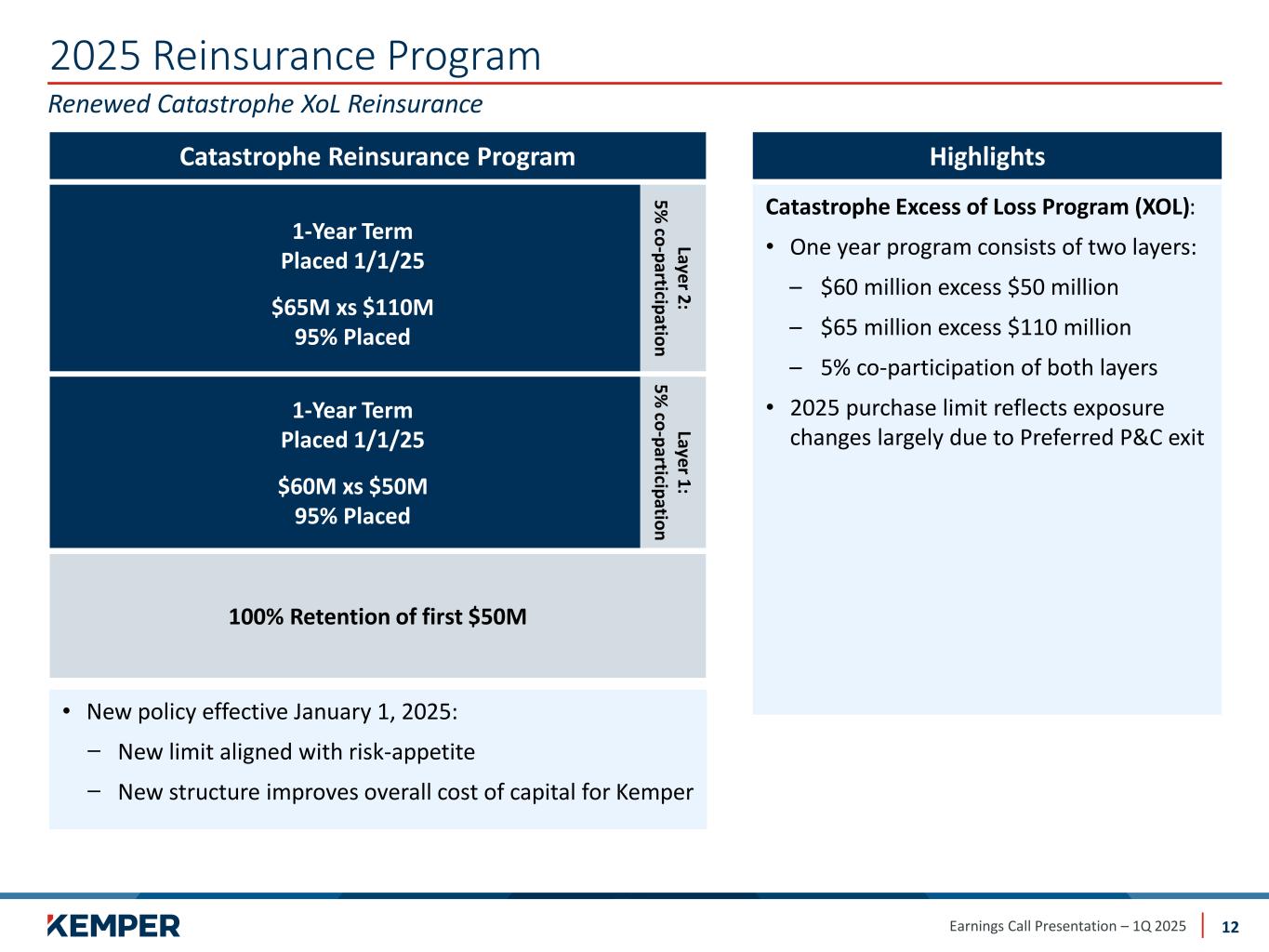 Earnings Call Presentation – 1Q 2025 2025 Reinsurance Program 12 Renewed Catastrophe XoL Reinsurance • New policy effective January 1, 2025: ̶ New limit aligned with risk-appetite ̶ New structure improves overall cost of capital for Kemper Catastrophe Excess of Loss Program (XOL): • One year program consists of two layers: – $60 million excess $50 million – $65 million excess $110 million – 5% co-participation of both layers • 2025 purchase limit reflects exposure changes largely due to Preferred P&C exit HighlightsCatastrophe Reinsurance Program 100% Retention of first $50M 1-Year Term Placed 1/1/25 $60M xs $50M 95% Placed 1-Year Term Placed 1/1/25 $65M xs $110M 95% Placed Laye r 1 : 5 % co -p articip atio n Laye r 2 : 5 % co -p articip atio n