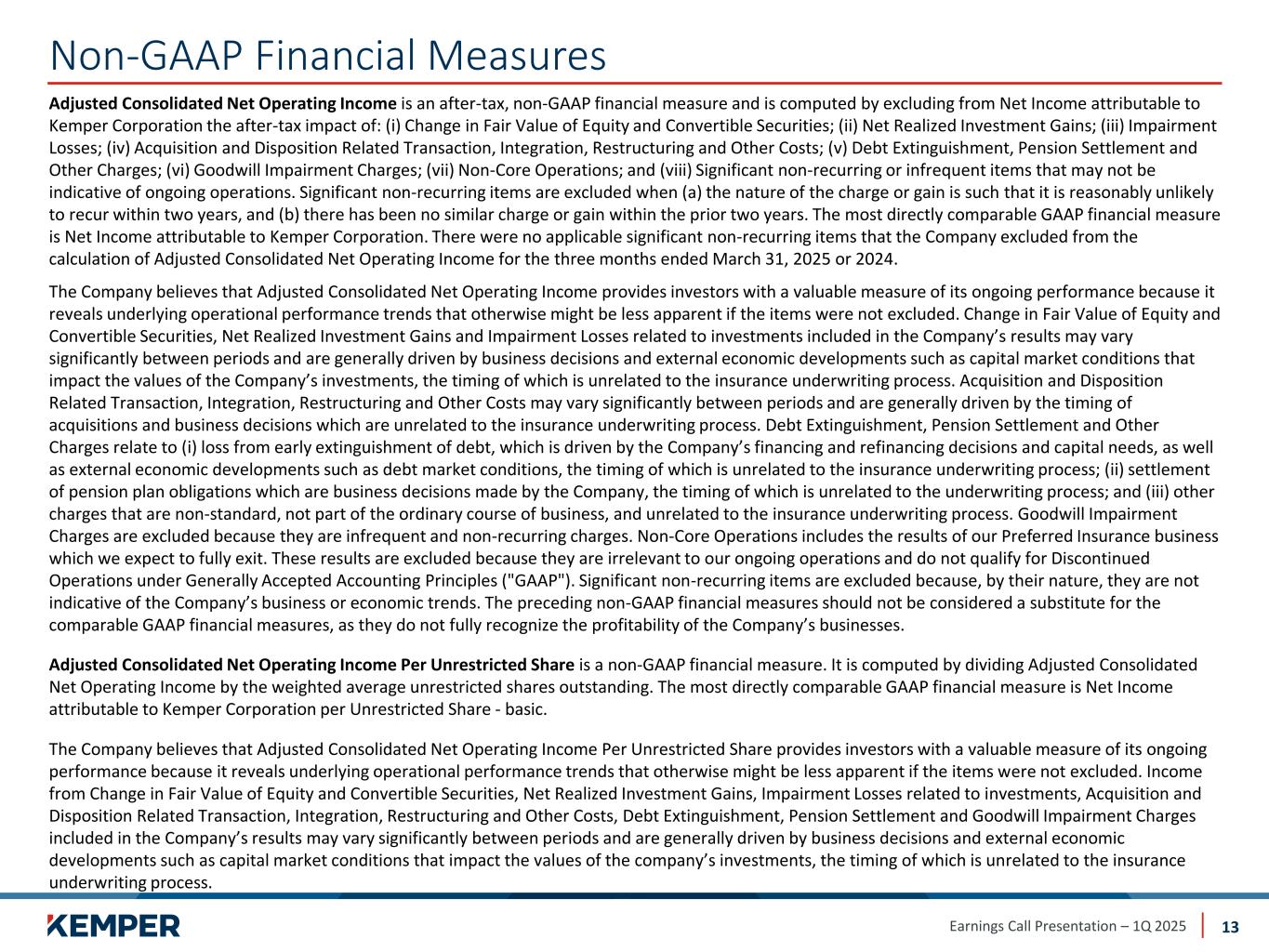 Earnings Call Presentation – 1Q 2025 Non-GAAP Financial Measures 15 Adjusted Consolidated Net Operating Income attributable to Kemper Corporation Three Months Ended ​​($ per share) Mar 31, 2025​ Mar 31, 2024 Net Income attributable to Kemper Corporation Per Unrestricted Share $1.56 $1.11 Less Net Income (Loss) Per Unrestricted Share From: Change in Fair Value of Equity and Convertible Securities - 0.04 Net Realized Investment Gains 0.01 0.09 Impairment Losses - (0.02) Acquisition and Disposition Related Transaction, Integration, Restructuring and Other Costs (0.07) (0.16) Debt Extinguishment, Pension Settlement and Other Charges 0.01 - Non-Core Operations (0.06) 0.08 Adjusted Consolidated Net Operating Income Per Unrestricted Share $1.67 $1.08 Three Months Ended ​​($ in millions) Mar 31, 2025 Mar 31, 2024 Net Income attributable to Kemper Corporation $99.7 $71.3 Less Net Income (Loss) From: Change in Fair Value of Equity and Convertible Securities 0.1 2.7 Net Realized Investment Gains 0.7 5.2 Impairment Losses 0.2 (1.2) Acquisition and Disposition Related Transaction, Integration, Restructuring and Other Costs (4.2) (10.1) Debt Extinguishment, Pension Settlement and Other Charges 0.4 - Non-Core Operations (3.9) 5.0 Adjusted Consolidated Net Operating Income $106.4 $69.7