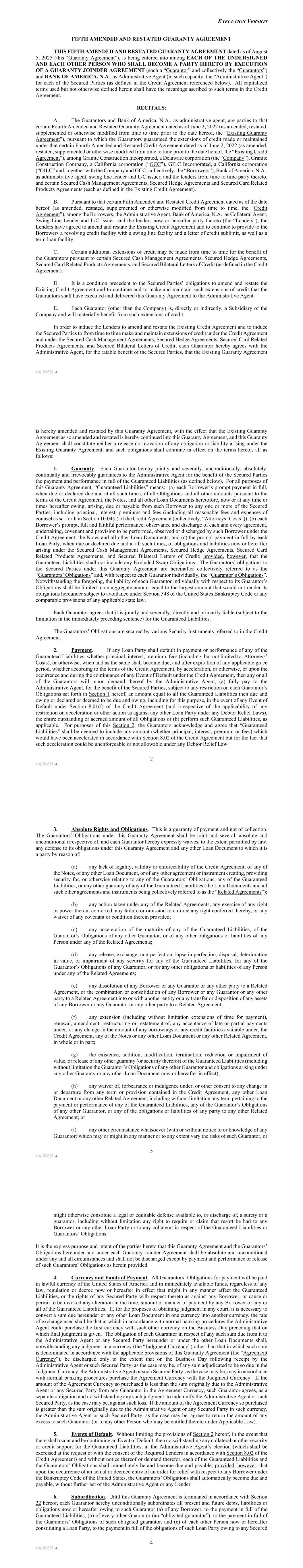 EXECUTION VERSION 207089383_4 FIFTH AMENDED AND RESTATED GUARANTY AGREEMENT THIS FIFTH AMENDED AND RESTATED GUARANTY AGREEMENT dated as of August 5, 2025 (this “Guaranty Agreement”), is being entered into among EACH OF THE UNDERSIGNED AND EACH OTHER PERSON WHO SHALL BECOME A PARTY HERETO BY EXECUTION OF A GUARANTY JOINDER AGREEMENT (each a “Guarantor” and collectively the “Guarantors”) and BANK OF AMERICA, N.A., as Administrative Agent (in such capacity, the “Administrative Agent”) for each of the Secured Parties (as defined in the Credit Agreement referenced below). All capitalized terms used but not otherwise defined herein shall have the meanings ascribed to such terms in the Credit Agreement. RECITALS: A. The Guarantors and Bank of America, N.A., as administrative agent, are parties to that certain Fourth Amended and Restated Guaranty Agreement dated as of June 2, 2022 (as amended, restated, supplemented or otherwise modified from time to time prior to the date hereof, the “Existing Guaranty Agreement”), pursuant to which the Guarantors guaranteed the extensions of credit made or maintained under that certain Fourth Amended and Restated Credit Agreement dated as of June 2, 2022 (as amended, restated, supplemented or otherwise modified from time to time prior to the date hereof, the “Existing Credit Agreement”), among Granite Construction Incorporated, a Delaware corporation (the “Company”), Granite Construction Company, a California corporation (“GCC”), GILC Incorporated, a California corporation (“GILC” and, together with the Company and GCC, collectively, the “Borrowers”), Bank of America, N.A., as administrative agent, swing line lender and L/C issuer, and the lenders from time to time party thereto, and certain Secured Cash Management Agreements, Secured Hedge Agreements and Secured Card Related Products Agreements (each as defined in the Existing Credit Agreement). B. Pursuant to that certain Fifth Amended and Restated Credit Agreement dated as of the date hereof (as amended, restated, supplemented or otherwise modified from time to time, the “Credit Agreement”), among the Borrowers, the Administrative Agent, Bank of America, N.A., as Collateral Agent, Swing Line Lender and L/C Issuer, and the lenders now or hereafter party thereto (the “Lenders”), the Lenders have agreed to amend and restate the Existing Credit Agreement and to continue to provide to the Borrowers a revolving credit facility with a swing line facility and a letter of credit sublimit, as well as a term loan facility. C. Certain additional extensions of credit may be made from time to time for the benefit of the Guarantors pursuant to certain Secured Cash Management Agreements, Secured Hedge Agreements, Secured Card Related Products Agreements, and Secured Bilateral Letters of Credit (as defined in the Credit Agreement). D. It is a condition precedent to the Secured Parties’ obligations to amend and restate the Existing Credit Agreement and to continue and to make and maintain such extensions of credit that the Guarantors shall have executed and delivered this Guaranty Agreement to the Administrative Agent. E. Each Guarantor (other than the Company) is, directly or indirectly, a Subsidiary of the Company and will materially benefit from such extensions of credit. In order to induce the Lenders to amend and restate the Existing Credit Agreement and to induce the Secured Parties to from time to time make and maintain extensions of credit under the Credit Agreement and under the Secured Cash Management Agreements, Secured Hedge Agreements, Secured Card Related Products Agreements, and Secured Bilateral Letters of Credit, each Guarantor hereby agrees with the Administrative Agent, for the ratable benefit of the Secured Parties, that the Existing Guaranty Agreement 2 207089383_4 is hereby amended and restated by this Guaranty Agreement, with the effect that the Existing Guaranty Agreement as so amended and restated is hereby continued into this Guaranty Agreement, and this Guaranty Agreement shall constitute neither a release nor novation of any obligation or liability arising under the Existing Guaranty Agreement, and such obligations shall continue in effect on the terms hereof, all as follows: 1. Guaranty. Each Guarantor hereby jointly and severally, unconditionally, absolutely, continually and irrevocably guarantees to the Administrative Agent for the benefit of the Secured Parties the payment and performance in full of the Guaranteed Liabilities (as defined below). For all purposes of this Guaranty Agreement, “Guaranteed Liabilities” means: (a) each Borrower’s prompt payment in full, when due or declared due and at all such times, of all Obligations and all other amounts pursuant to the terms of the Credit Agreement, the Notes, and all other Loan Documents heretofore, now or at any time or times hereafter owing, arising, due or payable from such Borrower to any one or more of the Secured Parties, including principal, interest, premiums and fees (including all reasonable fees and expenses of counsel as set forth in Section 10.04(a) of the Credit Agreement (collectively, “Attorneys’ Costs”)); (b) each Borrower’s prompt, full and faithful performance, observance and discharge of each and every agreement, undertaking, covenant and provision to be performed, observed or discharged by such Borrower under the Credit Agreement, the Notes and all other Loan Documents; and (c) the prompt payment in full by each Loan Party, when due or declared due and at all such times, of obligations and liabilities now or hereafter arising under the Secured Cash Management Agreements, Secured Hedge Agreements, Secured Card Related Products Agreements, and Secured Bilateral Letters of Credit; provided, however, that the Guaranteed Liabilities shall not include any Excluded Swap Obligations. The Guarantors’ obligations to the Secured Parties under this Guaranty Agreement are