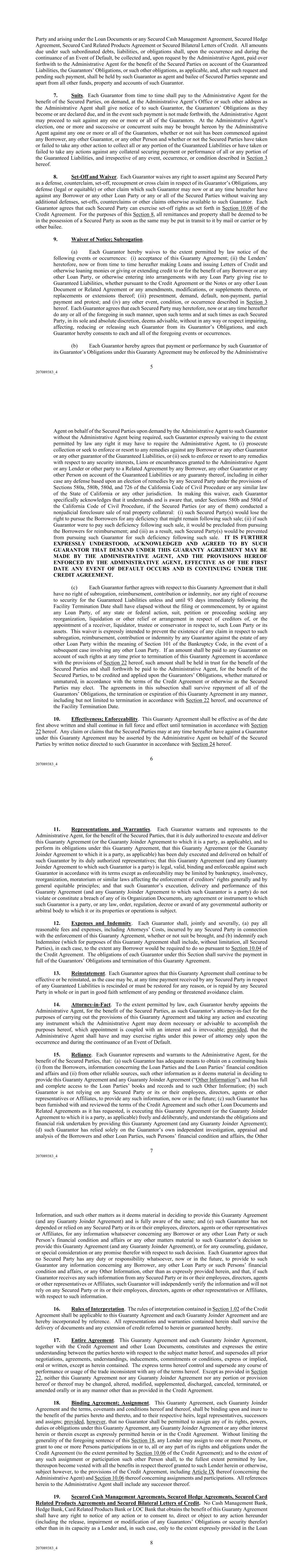 5 207089383_4 Party and arising under the Loan Documents or any Secured Cash Management Agreement, Secured Hedge Agreement, Secured Card Related Products Agreement or Secured Bilateral Letters of Credit. All amounts due under such subordinated debts, liabilities, or obligations shall, upon the occurrence and during the continuance of an Event of Default, be collected and, upon request by the Administrative Agent, paid over forthwith to the Administrative Agent for the benefit of the Secured Parties on account of the Guaranteed Liabilities, the Guarantors’ Obligations, or such other obligations, as applicable, and, after such request and pending such payment, shall be held by such Guarantor as agent and bailee of Secured Parties separate and apart from all other funds, property and accounts of such Guarantor. 7. Suits. Each Guarantor from time to time shall pay to the Administrative Agent for the benefit of the Secured Parties, on demand, at the Administrative Agent’s Office or such other address as the Administrative Agent shall give notice of to such Guarantor, the Guarantors’ Obligations as they become or are declared due, and in the event such payment is not made forthwith, the Administrative Agent may proceed to suit against any one or more or all of the Guarantors. At the Administrative Agent’s election, one or more and successive or concurrent suits may be brought hereon by the Administrative Agent against any one or more or all of the Guarantors, whether or not suit has been commenced against any Borrower, any other Guarantor, or any other Person and whether or not the Secured Parties have taken or failed to take any other action to collect all or any portion of the Guaranteed Liabilities or have taken or failed to take any actions against any collateral securing payment or performance of all or any portion of the Guaranteed Liabilities, and irrespective of any event, occurrence, or condition described in Section 3 hereof. 8. Set-Off and Waiver. Each Guarantor waives any right to assert against any Secured Party as a defense, counterclaim, set-off, recoupment or cross claim in respect of its Guarantor’s Obligations, any defense (legal or equitable) or other claim which such Guarantor may now or at any time hereafter have against any Borrower or any other Loan Party or any or all of the Secured Parties without waiving any additional defenses, set-offs, counterclaims or other claims otherwise available to such Guarantor. Each Guarantor agrees that each Secured Party can exercise set-off rights as set forth in Section 10.08 of the Credit Agreement. For the purposes of this Section 8, all remittances and property shall be deemed to be in the possession of a Secured Party as soon as the same may be put in transit to it by mail or carrier or by other bailee. 9. Waiver of Notice; Subrogation. (a) Each Guarantor hereby waives to the extent permitted by law notice of the following events or occurrences: (i) acceptance of this Guaranty Agreement; (ii) the Lenders’ heretofore, now or from time to time hereafter making Loans and issuing Letters of Credit and otherwise loaning monies or giving or extending credit to or for the benefit of any Borrower or any other Loan Party, or otherwise entering into arrangements with any Loan Party giving rise to Guaranteed Liabilities, whether pursuant to the Credit Agreement or the Notes or any other Loan Document or Related Agreement or any amendments, modifications, or supplements thereto, or replacements or extensions thereof; (iii) presentment, demand, default, non-payment, partial payment and protest; and (iv) any other event, condition, or occurrence described in Section 3 hereof. Each Guarantor agrees that each Secured Party may heretofore, now or at any time hereafter do any or all of the foregoing in such manner, upon such terms and at such times as each Secured Party, in its sole and absolute discretion, deems advisable, without in any way or respect impairing, affecting, reducing or releasing such Guarantor from its Guarantor’s Obligations, and each Guarantor hereby consents to each and all of the foregoing events or occurrences. (b) Each Guarantor hereby agrees that payment or performance by such Guarantor of its Guarantor’s Obligations under this Guaranty Agreement may be enforced by the Administrative 6 207089383_4 Agent on behalf of the Secured Parties upon demand by the Administrative Agent to such Guarantor without the Administrative Agent being required, such Guarantor expressly waiving to the extent permitted by law any right it may have to require the Administrative Agent, to (i) prosecute collection or seek to enforce or resort to any remedies against any Borrower or any other Guarantor or any other guarantor of the Guaranteed Liabilities, or (ii) seek to enforce or resort to any remedies with respect to any security interests, Liens or encumbrances granted to the Administrative Agent or any Lender or other party to a Related Agreement by any Borrower, any other Guarantor or any other Person on account of the Guaranteed Liabilities or any guaranty thereof, including in either case any defense based upon an election of remedies by any Secured Party under the provisions of Sections 580a, 580b, 580d, and 726 of the California Code of Civil Procedure or any similar law of the State of California or any other jurisdiction. In making this waiver, each Guarantor specifically acknowledges that it understands and is aware that, under Sections 580b and 580d of the California Code of Civil Procedure, if the Secured Parties (or any of them) conducted a nonjudicial foreclosure sale of real property collateral: (i) such Secured Party(s) would lose the right to pursue the Borrowers for any deficiency that might remain following such sale; (ii) if such Guarantor were to pay such deficiency following such sale, it would be precluded from pursuing the Borrowers for reimbursement; and (iii) as a result, such Secured Party(s) would be prev