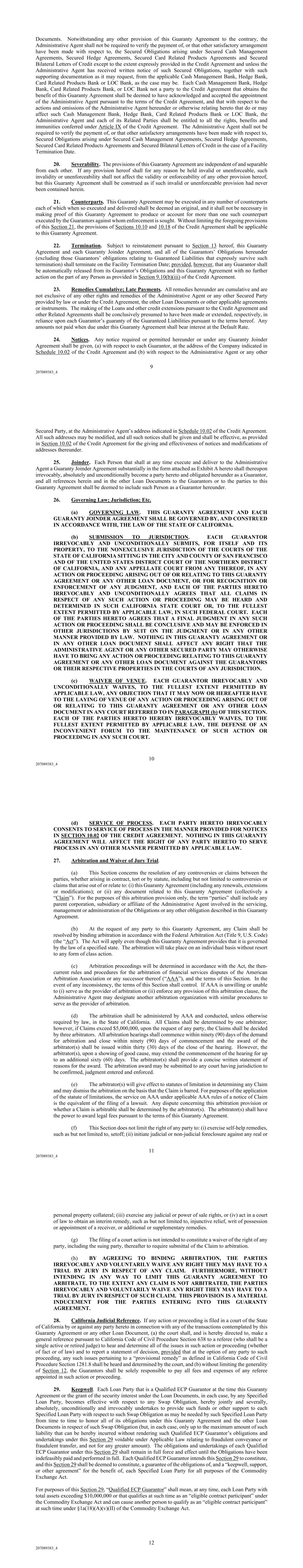 9 207089383_4 Documents. Notwithstanding any other provision of this Guaranty Agreement to the contrary, the Administrative Agent shall not be required to verify the payment of, or that other satisfactory arrangement have been made with respect to, the Secured Obligations arising under Secured Cash Management Agreements, Secured Hedge Agreements, Secured Card Related Products Agreements and Secured Bilateral Letters of Credit except to the extent expressly provided in the Credit Agreement and unless the Administrative Agent has received written notice of such Secured Obligations, together with such supporting documentation as it may request, from the applicable Cash Management Bank, Hedge Bank, Card Related Products Bank or LOC Bank, as the case may be. Each Cash Management Bank, Hedge Bank, Card Related Products Bank, or LOC Bank not a party to the Credit Agreement that obtains the benefit of this Guaranty Agreement shall be deemed to have acknowledged and accepted the appointment of the Administrative Agent pursuant to the terms of the Credit Agreement, and that with respect to the actions and omissions of the Administrative Agent hereunder or otherwise relating hereto that do or may affect such Cash Management Bank, Hedge Bank, Card Related Products Bank or LOC Bank, the Administrative Agent and each of its Related Parties shall be entitled to all the rights, benefits and immunities conferred under Article IX of the Credit Agreement. The Administrative Agent shall not be required to verify the payment of, or that other satisfactory arrangements have been made with respect to, Secured Obligations arising under Secured Cash Management Agreements, Secured Hedge Agreements, Secured Card Related Products Agreements and Secured Bilateral Letters of Credit in the case of a Facility Termination Date. 20. Severability. The provisions of this Guaranty Agreement are independent of and separable from each other. If any provision hereof shall for any reason be held invalid or unenforceable, such invalidity or unenforceability shall not affect the validity or enforceability of any other provision hereof, but this Guaranty Agreement shall be construed as if such invalid or unenforceable provision had never been contained herein. 21. Counterparts. This Guaranty Agreement may be executed in any number of counterparts each of which when so executed and delivered shall be deemed an original, and it shall not be necessary in making proof of this Guaranty Agreement to produce or account for more than one such counterpart executed by the Guarantors against whom enforcement is sought. Without limiting the foregoing provisions of this Section 21, the provisions of Sections 10.10 and 10.18 of the Credit Agreement shall be applicable to this Guaranty Agreement. 22. Termination. Subject to reinstatement pursuant to Section 13 hereof, this Guaranty Agreement and each Guaranty Joinder Agreement, and all of the Guarantors’ Obligations hereunder (excluding those Guarantors’ obligations relating to Guaranteed Liabilities that expressly survive such termination) shall terminate on the Facility Termination Date; provided, however, that any Guarantor shall be automatically released from its Guarantor’s Obligations and this Guaranty Agreement with no further action on the part of any Person as provided in Section 9.10(b)(iii) of the Credit Agreement. 23. Remedies Cumulative; Late Payments. All remedies hereunder are cumulative and are not exclusive of any other rights and remedies of the Administrative Agent or any other Secured Party provided by law or under the Credit Agreement, the other Loan Documents or other applicable agreements or instruments. The making of the Loans and other credit extensions pursuant to the Credit Agreement and other Related Agreements shall be conclusively presumed to have been made or extended, respectively, in reliance upon each Guarantor’s guaranty of the Guaranteed Liabilities pursuant to the terms hereof. Any amounts not paid when due under this Guaranty Agreement shall bear interest at the Default Rate. 24. Notices. Any notice required or permitted hereunder or under any Guaranty Joinder Agreement shall be given, (a) with respect to each Guarantor, at the address of the Company indicated in Schedule 10.02 of the Credit Agreement and (b) with respect to the Administrative Agent or any other 10 207089383_4 Secured Party, at the Administrative Agent’s address indicated in Schedule 10.02 of the Credit Agreement. All such addresses may be modified, and all such notices shall be given and shall be effective, as provided in Section 10.02 of the Credit Agreement for the giving and effectiveness of notices and modifications of addresses thereunder. 25. Joinder. Each Person that shall at any time execute and deliver to the Administrative Agent a Guaranty Joinder Agreement substantially in the form attached as Exhibit A hereto shall thereupon irrevocably, absolutely and unconditionally become a party hereto and obligated hereunder as a Guarantor, and all references herein and in the other Loan Documents to the Guarantors or to the parties to this Guaranty Agreement shall be deemed to include such Person as a Guarantor hereunder. 26. Governing Law; Jurisdiction; Etc. (a) GOVERNING LAW. THIS GUARANTY AGREEMENT AND EACH GUARANTY JOINDER AGREEMENT SHALL BE GOVERNED BY, AND CONSTRUED IN ACCORDANCE WITH, THE LAW OF THE STATE OF CALIFORNIA. (b) SUBMISSION TO JURISDICTION. EACH GUARANTOR IRREVOCABLY AND UNCONDITIONALLY SUBMITS, FOR ITSELF AND ITS PROPERTY, TO THE NONEXCLUSIVE JURISDICTION OF THE COURTS OF THE STATE OF CALIFORNIA SITTING IN THE CITY AND COUNTY OF SAN FRANCISCO AND OF THE UNITED STATES DISTRICT COURT OF THE NORTHERN DISTRICT OF CALIFORNIA, AND ANY APPELLATE COURT FROM ANY THEREOF, IN ANY ACTION OR PROCEEDING ARISING OUT OF OR RELATING TO THIS GUARANTY AGREEMENT OR ANY OTHER LOAN DOCUMENT, OR FOR RECOGNITION OR ENFORCEMENT OF ANY JUDGMENT, AND EACH OF THE PARTIES HERETO IRREVOCABL