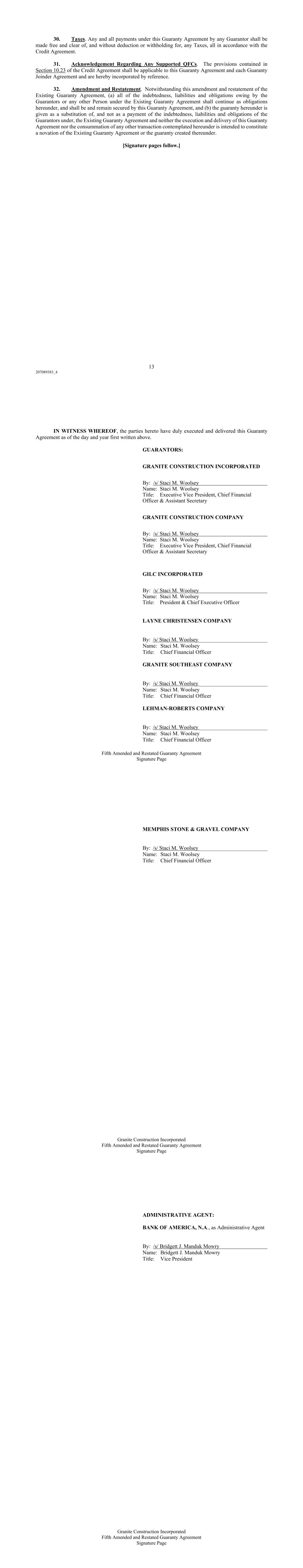 13 207089383_4 30. Taxes. Any and all payments under this Guaranty Agreement by any Guarantor shall be made free and clear of, and without deduction or withholding for, any Taxes, all in accordance with the Credit Agreement. 31. Acknowledgement Regarding Any Supported QFCs. The provisions contained in Section 10.23 of the Credit Agreement shall be applicable to this Guaranty Agreement and each Guaranty Joinder Agreement and are hereby incorporated by reference. 32. Amendment and Restatement. Notwithstanding this amendment and restatement of the Existing Guaranty Agreement, (a) all of the indebtedness, liabilities and obligations owing by the Guarantors or any other Person under the Existing Guaranty Agreement shall continue as obligations hereunder, and shall be and remain secured by this Guaranty Agreement, and (b) the guaranty hereunder is given as a substitution of, and not as a payment of the indebtedness, liabilities and obligations of the Guarantors under, the Existing Guaranty Agreement and neither the execution and delivery of this Guaranty Agreement nor the consummation of any other transaction contemplated hereunder is intended to constitute a novation of the Existing Guaranty Agreement or the guaranty created thereunder. [Signature pages follow.] Fifth Amended and Restated Guaranty Agreement Signature Page IN WITNESS WHEREOF, the parties hereto have duly executed and delivered this Guaranty Agreement as of the day and year first written above. GUARANTORS: GRANITE CONSTRUCTION INCORPORATED By: /s/ Staci M. Woolsey Name: Staci M. Woolsey Title: Executive Vice President, Chief Financial Officer & Assistant Secretary GRANITE CONSTRUCTION COMPANY By: /s/ Staci M. Woolsey Name: Staci M. Woolsey Title: Executive Vice President, Chief Financial Officer & Assistant Secretary GILC INCORPORATED By: /s/ Staci M. Woolsey Name: Staci M. Woolsey Title: President & Chief Executive Officer LAYNE CHRISTENSEN COMPANY By: /s/ Staci M. Woolsey _________________________ Name: Staci M. Woolsey Title: Chief Financial Officer GRANITE SOUTHEAST COMPANY By: /s/ Staci M. Woolsey _________________________ Name: Staci M. Woolsey Title: Chief Financial Officer LEHMAN-ROBERTS COMPANY By: /s/ Staci M. Woolsey _________________________ Name: Staci M. Woolsey Title: Chief Financial Officer Granite Construction Incorporated Fifth Amended and Restated Guaranty Agreement Signature Page MEMPHIS STONE & GRAVEL COMPANY By: /s/ Staci M. Woolsey _________________________ Name: Staci M. Woolsey Title: Chief Financial Officer Granite Construction Incorporated Fifth Amended and Restated Guaranty Agreement Signature Page ADMINISTRATIVE AGENT: BANK OF AMERICA, N.A., as Administrative Agent By: /s/ Bridgett J. Manduk Mowry Name: Bridgett J. Manduk Mowry Title: Vice President