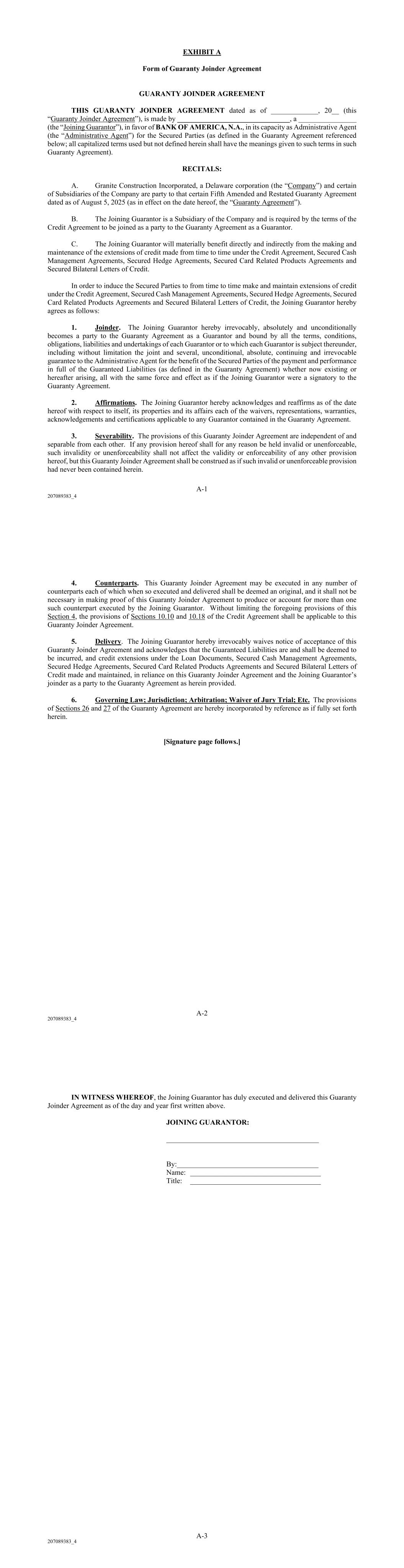 A-1 207089383_4 EXHIBIT A Form of Guaranty Joinder Agreement GUARANTY JOINDER AGREEMENT THIS GUARANTY JOINDER AGREEMENT dated as of _____________, 20__ (this “Guaranty Joinder Agreement”), is made by _______________________________, a ________________ (the “Joining Guarantor”), in favor of BANK OF AMERICA, N.A., in its capacity as Administrative Agent (the “Administrative Agent”) for the Secured Parties (as defined in the Guaranty Agreement referenced below; all capitalized terms used but not defined herein shall have the meanings given to such terms in such Guaranty Agreement). RECITALS: A. Granite Construction Incorporated, a Delaware corporation (the “Company”) and certain of Subsidiaries of the Company are party to that certain Fifth Amended and Restated Guaranty Agreement dated as of August 5, 2025 (as in effect on the date hereof, the “Guaranty Agreement”). B. The Joining Guarantor is a Subsidiary of the Company and is required by the terms of the Credit Agreement to be joined as a party to the Guaranty Agreement as a Guarantor. C. The Joining Guarantor will materially benefit directly and indirectly from the making and maintenance of the extensions of credit made from time to time under the Credit Agreement, Secured Cash Management Agreements, Secured Hedge Agreements, Secured Card Related Products Agreements and Secured Bilateral Letters of Credit. In order to induce the Secured Parties to from time to time make and maintain extensions of credit under the Credit Agreement, Secured Cash Management Agreements, Secured Hedge Agreements, Secured Card Related Products Agreements and Secured Bilateral Letters of Credit, the Joining Guarantor hereby agrees as follows: 1. Joinder. The Joining Guarantor hereby irrevocably, absolutely and unconditionally becomes a party to the Guaranty Agreement as a Guarantor and bound by all the terms, conditions, obligations, liabilities and undertakings of each Guarantor or to which each Guarantor is subject thereunder, including without limitation the joint and several, unconditional, absolute, continuing and irrevocable guarantee to the Administrative Agent for the benefit of the Secured Parties of the payment and performance in full of the Guaranteed Liabilities (as defined in the Guaranty Agreement) whether now existing or hereafter arising, all with the same force and effect as if the Joining Guarantor were a signatory to the Guaranty Agreement. 2. Affirmations. The Joining Guarantor hereby acknowledges and reaffirms as of the date hereof with respect to itself, its properties and its affairs each of the waivers, representations, warranties, acknowledgements and certifications applicable to any Guarantor contained in the Guaranty Agreement. 3. Severability. The provisions of this Guaranty Joinder Agreement are independent of and separable from each other. If any provision hereof shall for any reason be held invalid or unenforceable, such invalidity or unenforceability shall not affect the validity or enforceability of any other provision hereof, but this Guaranty Joinder Agreement shall be construed as if such invalid or unenforceable provision had never been contained herein. 207089383_4 A-2 4. Counterparts. This Guaranty Joinder Agreement may be executed in any number of counterparts each of which when so executed and delivered shall be deemed an original, and it shall not be necessary in making proof of this Guaranty Joinder Agreement to produce or account for more than one such counterpart executed by the Joining Guarantor. Without limiting the foregoing provisions of this Section 4, the provisions of Sections 10.10 and 10.18 of the Credit Agreement shall be applicable to this Guaranty Joinder Agreement. 5. Delivery. The Joining Guarantor hereby irrevocably waives notice of acceptance of this Guaranty Joinder Agreement and acknowledges that the Guaranteed Liabilities are and shall be deemed to be incurred, and credit extensions under the Loan Documents, Secured Cash Management Agreements, Secured Hedge Agreements, Secured Card Related Products Agreements and Secured Bilateral Letters of Credit made and maintained, in reliance on this Guaranty Joinder Agreement and the Joining Guarantor’s joinder as a party to the Guaranty Agreement as herein provided. 6. Governing Law; Jurisdiction; Arbitration; Waiver of Jury Trial; Etc. The provisions of Sections 26 and 27 of the Guaranty Agreement are hereby incorporated by reference as if fully set forth herein. [Signature page follows.] 207089383_4 A-3 IN WITNESS WHEREOF, the Joining Guarantor has duly executed and delivered this Guaranty Joinder Agreement as of the day and year first written above. JOINING GUARANTOR: __________________________________________ By:_______________________________________ Name: ____________________________________ Title: ____________________________________