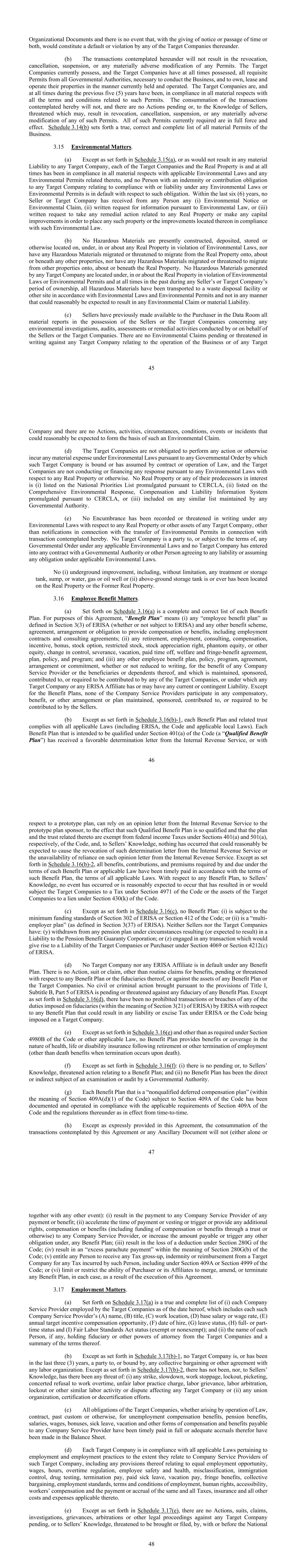 45 Organizational Documents and there is no event that, with the giving of notice or passage of time or both, would constitute a default or violation by any of the Target Companies thereunder. (b) The transactions contemplated hereunder will not result in the revocation, cancellation, suspension, or any materially adverse modification of any Permits. The Target Companies currently possess, and the Target Companies have at all times possessed, all requisite Permits from all Governmental Authorities, necessary to conduct the Business, and to own, lease and operate their properties in the manner currently held and operated. The Target Companies are, and at all times during the previous five (5) years have been, in compliance in all material respects with all the terms and conditions related to such Permits. The consummation of the transactions contemplated hereby will not, and there are no Actions pending or, to the Knowledge of Sellers, threatened which may, result in revocation, cancellation, suspension, or any materially adverse modification of any of such Permits. All of such Permits currently required are in full force and effect. Schedule 3.14(b) sets forth a true, correct and complete list of all material Permits of the Business. 3.15 Environmental Matters. (a) Except as set forth in Schedule 3.15(a), or as would not result in any material Liability to any Target Company, each of the Target Companies and the Real Property is and at all times has been in compliance in all material respects with applicable Environmental Laws and any Environmental Permits related thereto, and no Person with an indemnity or contribution obligation to any Target Company relating to compliance with or liability under any Environmental Laws or Environmental Permits is in default with respect to such obligation. Within the last six (6) years, no Seller or Target Company has received from any Person any (i) Environmental Notice or Environmental Claim, (ii) written request for information pursuant to Environmental Law, or (iii) written request to take any remedial action related to any Real Property or make any capital improvements in order to place any such property or the improvements located thereon in compliance with such Environmental Law. (b) No Hazardous Materials are presently constructed, deposited, stored or otherwise located on, under, in or about any Real Property in violation of Environmental Laws, nor have any Hazardous Materials migrated or threatened to migrate from the Real Property onto, about or beneath any other properties, nor have any Hazardous Materials migrated or threatened to migrate from other properties onto, about or beneath the Real Property. No Hazardous Materials generated by any Target Company are located under, in or about the Real Property in violation of Environmental Laws or Environmental Permits and at all times in the past during any Seller’s or Target Company’s period of ownership, all Hazardous Materials have been transported to a waste disposal facility or other site in accordance with Environmental Laws and Environmental Permits and not in any manner that could reasonably be expected to result in any Environmental Claim or material Liability. (c) Sellers have previously made available to the Purchaser in the Data Room all material reports in the possession of the Sellers or the Target Companies concerning any environmental investigations, audits, assessments or remedial activities conducted by or on behalf of the Sellers or the Target Companies. There are no Environmental Claims pending or threatened in writing against any Target Company relating to the operation of the Business or of any Target 46 Company and there are no Actions, activities, circumstances, conditions, events or incidents that could reasonably be expected to form the basis of such an Environmental Claim. (d) The Target Companies are not obligated to perform any action or otherwise incur any material expense under Environmental Laws pursuant to any Governmental Order by which such Target Company is bound or has assumed by contract or operation of Law, and the Target Companies are not conducting or financing any response pursuant to any Environmental Laws with respect to any Real Property or otherwise. No Real Property or any of their predecessors in interest is (i) listed on the National Priorities List promulgated pursuant to CERCLA, (ii) listed on the Comprehensive Environmental Response, Compensation and Liability Information System promulgated pursuant to CERCLA, or (iii) included on any similar list maintained by any Governmental Authority. (e) No Encumbrance has been recorded or threatened in writing under any Environmental Laws with respect to any Real Property or other assets of any Target Company, other than notifications in connection with the transfer of Environmental Permits in connection with transaction contemplated hereby. No Target Company is a party to, or subject to the terms of, any Governmental Order under any applicable Environmental Laws and no Target Company has entered into any contract with a Governmental Authority or other Person agreeing to any liability or assuming any obligation under applicable Environmental Laws. No (i) underground improvement, including, without limitation, any treatment or storage tank, sump, or water, gas or oil well or (ii) above-ground storage tank is or ever has been located on the Real Property or the Former Real Property. 3.16 Employee Benefit Matters. (a) Set forth on Schedule 3.16(a) is a complete and correct list of each Benefit Plan. For purposes of this Agreement, “Benefit Plan” means (i) any “employee benefit plan” as defined in Section 3(3) of ERISA (whether or not subject to ERISA) and any other benefit scheme, agreement, arrangement or obligation to provide compensation or benefits, including employment contracts and consulting agreements; (ii) any retirement, employment, consulting, compensation, incentive, bonus, stock opti