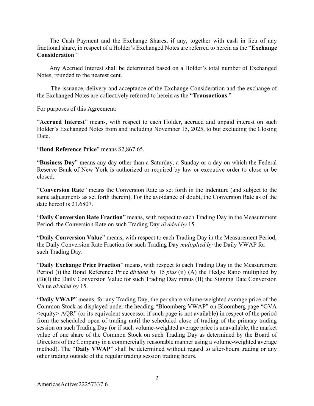 2 AmericasActive:22257337.6 The Cash Payment and the Exchange Shares, if any, together with cash in lieu of any fractional share, in respect of a Holder’s Exchanged Notes are referred to herein as the “Exchange Consideration.” Any Accrued Interest shall be determined based on a Holder’s total number of Exchanged Notes, rounded to the nearest cent. The issuance, delivery and acceptance of the Exchange Consideration and the exchange of the Exchanged Notes are collectively referred to herein as the “Transactions.” For purposes of this Agreement: “Accrued Interest” means, with respect to each Holder, accrued and unpaid interest on such Holder’s Exchanged Notes from and including November 15, 2025, to but excluding the Closing Date. “Bond Reference Price” means $2,867.65. “Business Day” means any day other than a Saturday, a Sunday or a day on which the Federal Reserve Bank of New York is authorized or required by law or executive order to close or be closed. “Conversion Rate” means the Conversion Rate as set forth in the Indenture (and subject to the same adjustments as set forth therein). For the avoidance of doubt, the Conversion Rate as of the date hereof is 21.6807. “Daily Conversion Rate Fraction” means, with respect to each Trading Day in the Measurement Period, the Conversion Rate on such Trading Day divided by 15. “Daily Conversion Value” means, with respect to each Trading Day in the Measurement Period, the Daily Conversion Rate Fraction for such Trading Day multiplied by the Daily VWAP for such Trading Day. “Daily Exchange Price Fraction” means, with respect to each Trading Day in the Measurement Period (i) the Bond Reference Price divided by 15 plus (ii) (A) the Hedge Ratio multiplied by (B)(I) the Daily Conversion Value for such Trading Day minus (II) the Signing Date Conversion Value divided by 15. “Daily VWAP” means, for any Trading Day, the per share volume-weighted average price of the Common Stock as displayed under the heading “Bloomberg VWAP” on Bloomberg page “GVA <equity> AQR” (or its equivalent successor if such page is not available) in respect of the period from the scheduled open of trading until the scheduled close of trading of the primary trading session on such Trading Day (or if such volume-weighted average price is unavailable, the market value of one share of the Common Stock on such Trading Day as determined by the Board of Directors of the Company in a commercially reasonable manner using a volume-weighted average method). The “Daily VWAP” shall be determined without regard to after-hours trading or any other trading outside of the regular trading session trading hours.
