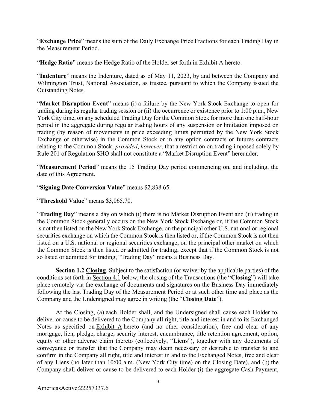 3 AmericasActive:22257337.6 “Exchange Price” means the sum of the Daily Exchange Price Fractions for each Trading Day in the Measurement Period. “Hedge Ratio” means the Hedge Ratio of the Holder set forth in Exhibit A hereto. “Indenture” means the Indenture, dated as of May 11, 2023, by and between the Company and Wilmington Trust, National Association, as trustee, pursuant to which the Company issued the Outstanding Notes. “Market Disruption Event” means (i) a failure by the New York Stock Exchange to open for trading during its regular trading session or (ii) the occurrence or existence prior to 1:00 p.m., New York City time, on any scheduled Trading Day for the Common Stock for more than one half-hour period in the aggregate during regular trading hours of any suspension or limitation imposed on trading (by reason of movements in price exceeding limits permitted by the New York Stock Exchange or otherwise) in the Common Stock or in any option contracts or futures contracts relating to the Common Stock; provided, however, that a restriction on trading imposed solely by Rule 201 of Regulation SHO shall not constitute a “Market Disruption Event” hereunder. “Measurement Period” means the 15 Trading Day period commencing on, and including, the date of this Agreement. “Signing Date Conversion Value” means $2,838.65. “Threshold Value” means $3,065.70. “Trading Day” means a day on which (i) there is no Market Disruption Event and (ii) trading in the Common Stock generally occurs on the New York Stock Exchange or, if the Common Stock is not then listed on the New York Stock Exchange, on the principal other U.S. national or regional securities exchange on which the Common Stock is then listed or, if the Common Stock is not then listed on a U.S. national or regional securities exchange, on the principal other market on which the Common Stock is then listed or admitted for trading, except that if the Common Stock is not so listed or admitted for trading, “Trading Day” means a Business Day. Section 1.2 Closing. Subject to the satisfaction (or waiver by the applicable parties) of the conditions set forth in Section 4.1 below, the closing of the Transactions (the “Closing”) will take place remotely via the exchange of documents and signatures on the Business Day immediately following the last Trading Day of the Measurement Period or at such other time and place as the Company and the Undersigned may agree in writing (the “Closing Date”). At the Closing, (a) each Holder shall, and the Undersigned shall cause each Holder to, deliver or cause to be delivered to the Company all right, title and interest in and to its Exchanged Notes as specified on Exhibit A hereto (and no other consideration), free and clear of any mortgage, lien, pledge, charge, security interest, encumbrance, title retention agreement, option, equity or other adverse claim thereto (collectively, “Liens”), together with any documents of conveyance or transfer that the Company may deem necessary or desirable to transfer to and confirm in the Company all right, title and interest in and to the Exchanged Notes, free and clear of any Liens (no later than 10:00 a.m. (New York City time) on the Closing Date), and (b) the Company shall deliver or cause to be delivered to each Holder (i) the aggregate Cash Payment,