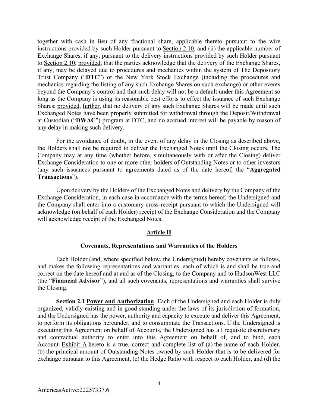 4 AmericasActive:22257337.6 together with cash in lieu of any fractional share, applicable thereto pursuant to the wire instructions provided by such Holder pursuant to Section 2.10, and (ii) the applicable number of Exchange Shares, if any, pursuant to the delivery instructions provided by such Holder pursuant to Section 2.10; provided, that the parties acknowledge that the delivery of the Exchange Shares, if any, may be delayed due to procedures and mechanics within the system of The Depository Trust Company (“DTC”) or the New York Stock Exchange (including the procedures and mechanics regarding the listing of any such Exchange Shares on such exchange) or other events beyond the Company’s control and that such delay will not be a default under this Agreement so long as the Company is using its reasonable best efforts to effect the issuance of such Exchange Shares; provided, further, that no delivery of any such Exchange Shares will be made until such Exchanged Notes have been properly submitted for withdrawal through the Deposit/Withdrawal at Custodian (“DWAC”) program at DTC, and no accrued interest will be payable by reason of any delay in making such delivery. For the avoidance of doubt, in the event of any delay in the Closing as described above, the Holders shall not be required to deliver the Exchanged Notes until the Closing occurs. The Company may at any time (whether before, simultaneously with or after the Closing) deliver Exchange Consideration to one or more other holders of Outstanding Notes or to other investors (any such issuances pursuant to agreements dated as of the date hereof, the “Aggregated Transactions”). Upon delivery by the Holders of the Exchanged Notes and delivery by the Company of the Exchange Consideration, in each case in accordance with the terms hereof, the Undersigned and the Company shall enter into a customary cross-receipt pursuant to which the Undersigned will acknowledge (on behalf of each Holder) receipt of the Exchange Consideration and the Company will acknowledge receipt of the Exchanged Notes. Article II Covenants, Representations and Warranties of the Holders Each Holder (and, where specified below, the Undersigned) hereby covenants as follows, and makes the following representations and warranties, each of which is and shall be true and correct on the date hereof and at and as of the Closing, to the Company and to HudsonWest LLC (the “Financial Advisor”), and all such covenants, representations and warranties shall survive the Closing. Section 2.1 Power and Authorization. Each of the Undersigned and each Holder is duly organized, validly existing and in good standing under the laws of its jurisdiction of formation, and the Undersigned has the power, authority and capacity to execute and deliver this Agreement, to perform its obligations hereunder, and to consummate the Transactions. If the Undersigned is executing this Agreement on behalf of Accounts, the Undersigned has all requisite discretionary and contractual authority to enter into this Agreement on behalf of, and to bind, each Account. Exhibit A hereto is a true, correct and complete list of (a) the name of each Holder, (b) the principal amount of Outstanding Notes owned by such Holder that is to be delivered for exchange pursuant to this Agreement, (c) the Hedge Ratio with respect to each Holder, and (d) the