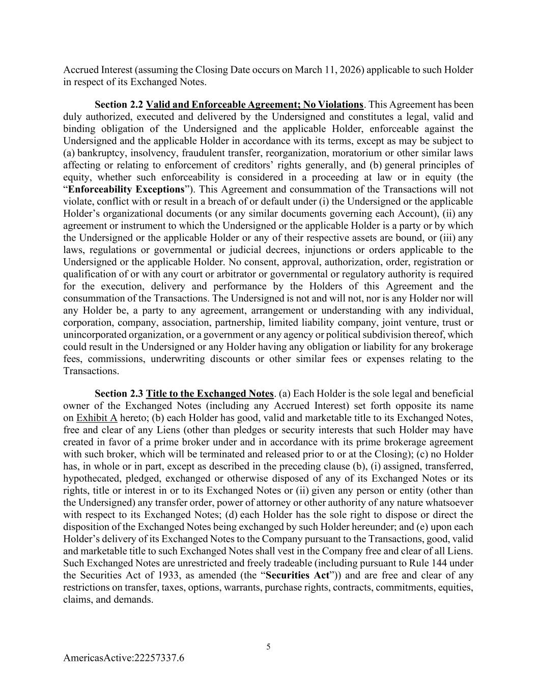 5 AmericasActive:22257337.6 Accrued Interest (assuming the Closing Date occurs on March 11, 2026) applicable to such Holder in respect of its Exchanged Notes. Section 2.2 Valid and Enforceable Agreement; No Violations. This Agreement has been duly authorized, executed and delivered by the Undersigned and constitutes a legal, valid and binding obligation of the Undersigned and the applicable Holder, enforceable against the Undersigned and the applicable Holder in accordance with its terms, except as may be subject to (a) bankruptcy, insolvency, fraudulent transfer, reorganization, moratorium or other similar laws affecting or relating to enforcement of creditors’ rights generally, and (b) general principles of equity, whether such enforceability is considered in a proceeding at law or in equity (the “Enforceability Exceptions”). This Agreement and consummation of the Transactions will not violate, conflict with or result in a breach of or default under (i) the Undersigned or the applicable Holder’s organizational documents (or any similar documents governing each Account), (ii) any agreement or instrument to which the Undersigned or the applicable Holder is a party or by which the Undersigned or the applicable Holder or any of their respective assets are bound, or (iii) any laws, regulations or governmental or judicial decrees, injunctions or orders applicable to the Undersigned or the applicable Holder. No consent, approval, authorization, order, registration or qualification of or with any court or arbitrator or governmental or regulatory authority is required for the execution, delivery and performance by the Holders of this Agreement and the consummation of the Transactions. The Undersigned is not and will not, nor is any Holder nor will any Holder be, a party to any agreement, arrangement or understanding with any individual, corporation, company, association, partnership, limited liability company, joint venture, trust or unincorporated organization, or a government or any agency or political subdivision thereof, which could result in the Undersigned or any Holder having any obligation or liability for any brokerage fees, commissions, underwriting discounts or other similar fees or expenses relating to the Transactions. Section 2.3 Title to the Exchanged Notes. (a) Each Holder is the sole legal and beneficial owner of the Exchanged Notes (including any Accrued Interest) set forth opposite its name on Exhibit A hereto; (b) each Holder has good, valid and marketable title to its Exchanged Notes, free and clear of any Liens (other than pledges or security interests that such Holder may have created in favor of a prime broker under and in accordance with its prime brokerage agreement with such broker, which will be terminated and released prior to or at the Closing); (c) no Holder has, in whole or in part, except as described in the preceding clause (b), (i) assigned, transferred, hypothecated, pledged, exchanged or otherwise disposed of any of its Exchanged Notes or its rights, title or interest in or to its Exchanged Notes or (ii) given any person or entity (other than the Undersigned) any transfer order, power of attorney or other authority of any nature whatsoever with respect to its Exchanged Notes; (d) each Holder has the sole right to dispose or direct the disposition of the Exchanged Notes being exchanged by such Holder hereunder; and (e) upon each Holder’s delivery of its Exchanged Notes to the Company pursuant to the Transactions, good, valid and marketable title to such Exchanged Notes shall vest in the Company free and clear of all Liens. Such Exchanged Notes are unrestricted and freely tradeable (including pursuant to Rule 144 under the Securities Act of 1933, as amended (the “Securities Act”)) and are free and clear of any restrictions on transfer, taxes, options, warrants, purchase rights, contracts, commitments, equities, claims, and demands.