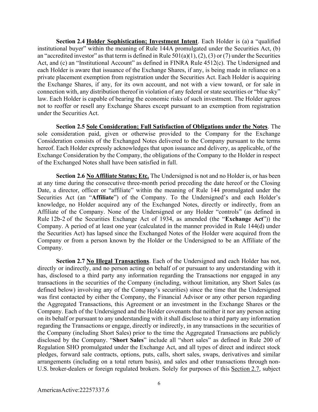 6 AmericasActive:22257337.6 Section 2.4 Holder Sophistication; Investment Intent. Each Holder is (a) a “qualified institutional buyer” within the meaning of Rule 144A promulgated under the Securities Act, (b) an “accredited investor” as that term is defined in Rule 501(a)(1), (2), (3) or (7) under the Securities Act, and (c) an “Institutional Account” as defined in FINRA Rule 4512(c). The Undersigned and each Holder is aware that issuance of the Exchange Shares, if any, is being made in reliance on a private placement exemption from registration under the Securities Act. Each Holder is acquiring the Exchange Shares, if any, for its own account, and not with a view toward, or for sale in connection with, any distribution thereof in violation of any federal or state securities or “blue sky” law. Each Holder is capable of bearing the economic risks of such investment. The Holder agrees not to reoffer or resell any Exchange Shares except pursuant to an exemption from registration under the Securities Act. Section 2.5 Sole Consideration; Full Satisfaction of Obligations under the Notes. The sole consideration paid, given or otherwise provided to the Company for the Exchange Consideration consists of the Exchanged Notes delivered to the Company pursuant to the terms hereof. Each Holder expressly acknowledges that upon issuance and delivery, as applicable, of the Exchange Consideration by the Company, the obligations of the Company to the Holder in respect of the Exchanged Notes shall have been satisfied in full. Section 2.6 No Affiliate Status; Etc. The Undersigned is not and no Holder is, or has been at any time during the consecutive three-month period preceding the date hereof or the Closing Date, a director, officer or “affiliate” within the meaning of Rule 144 promulgated under the Securities Act (an “Affiliate”) of the Company. To the Undersigned’s and each Holder’s knowledge, no Holder acquired any of the Exchanged Notes, directly or indirectly, from an Affiliate of the Company. None of the Undersigned or any Holder “controls” (as defined in Rule 12b-2 of the Securities Exchange Act of 1934, as amended (the “Exchange Act”)) the Company. A period of at least one year (calculated in the manner provided in Rule 144(d) under the Securities Act) has lapsed since the Exchanged Notes of the Holder were acquired from the Company or from a person known by the Holder or the Undersigned to be an Affiliate of the Company. Section 2.7 No Illegal Transactions. Each of the Undersigned and each Holder has not, directly or indirectly, and no person acting on behalf of or pursuant to any understanding with it has, disclosed to a third party any information regarding the Transactions nor engaged in any transactions in the securities of the Company (including, without limitation, any Short Sales (as defined below) involving any of the Company’s securities) since the time that the Undersigned was first contacted by either the Company, the Financial Advisor or any other person regarding the Aggregated Transactions, this Agreement or an investment in the Exchange Shares or the Company. Each of the Undersigned and the Holder covenants that neither it nor any person acting on its behalf or pursuant to any understanding with it shall disclose to a third party any information regarding the Transactions or engage, directly or indirectly, in any transactions in the securities of the Company (including Short Sales) prior to the time the Aggregated Transactions are publicly disclosed by the Company. “Short Sales” include all “short sales” as defined in Rule 200 of Regulation SHO promulgated under the Exchange Act, and all types of direct and indirect stock pledges, forward sale contracts, options, puts, calls, short sales, swaps, derivatives and similar arrangements (including on a total return basis), and sales and other transactions through non- U.S. broker-dealers or foreign regulated brokers. Solely for purposes of this Section 2.7, subject
